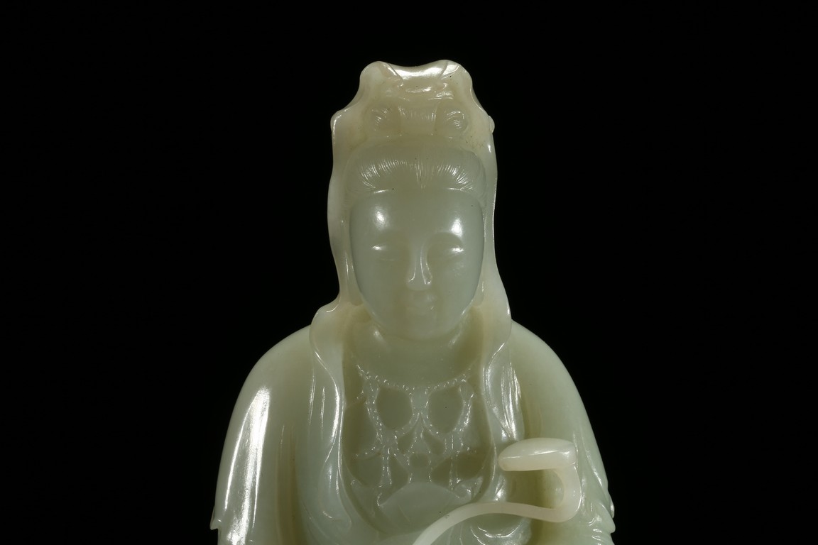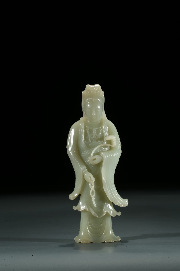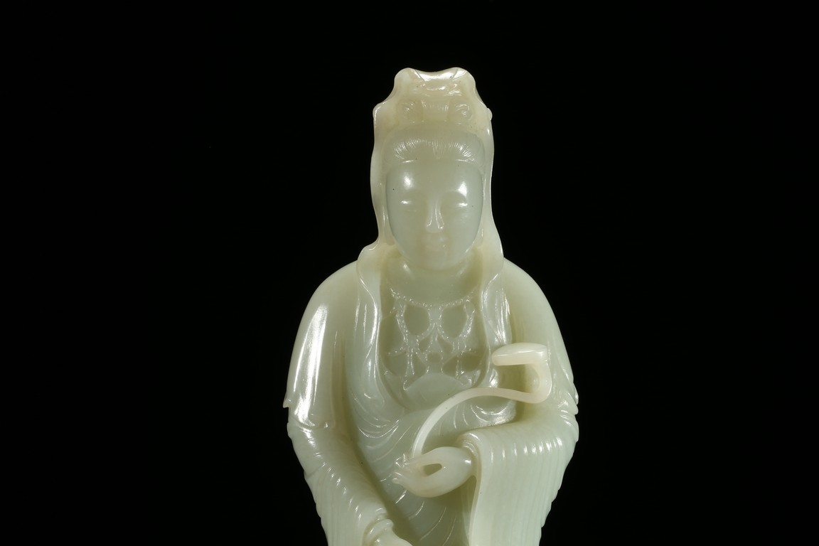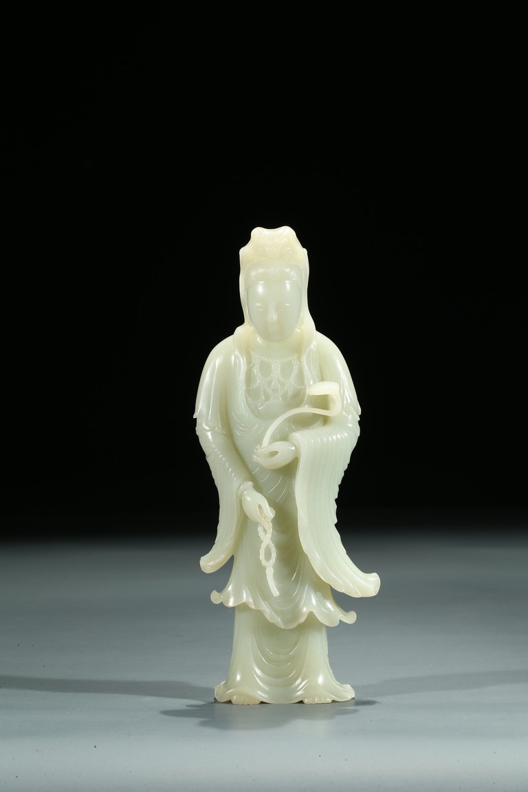 Standing gracefully dressed in long flowing robes, holding a ruyi sceptre on left hand, her face detailed with fine features and downcast eyes set in a benevolent expression, her hair tied up in a high chignon covered with a cowl, her chest adorned with beaded jewellery, the translucent stone of smooth white color.