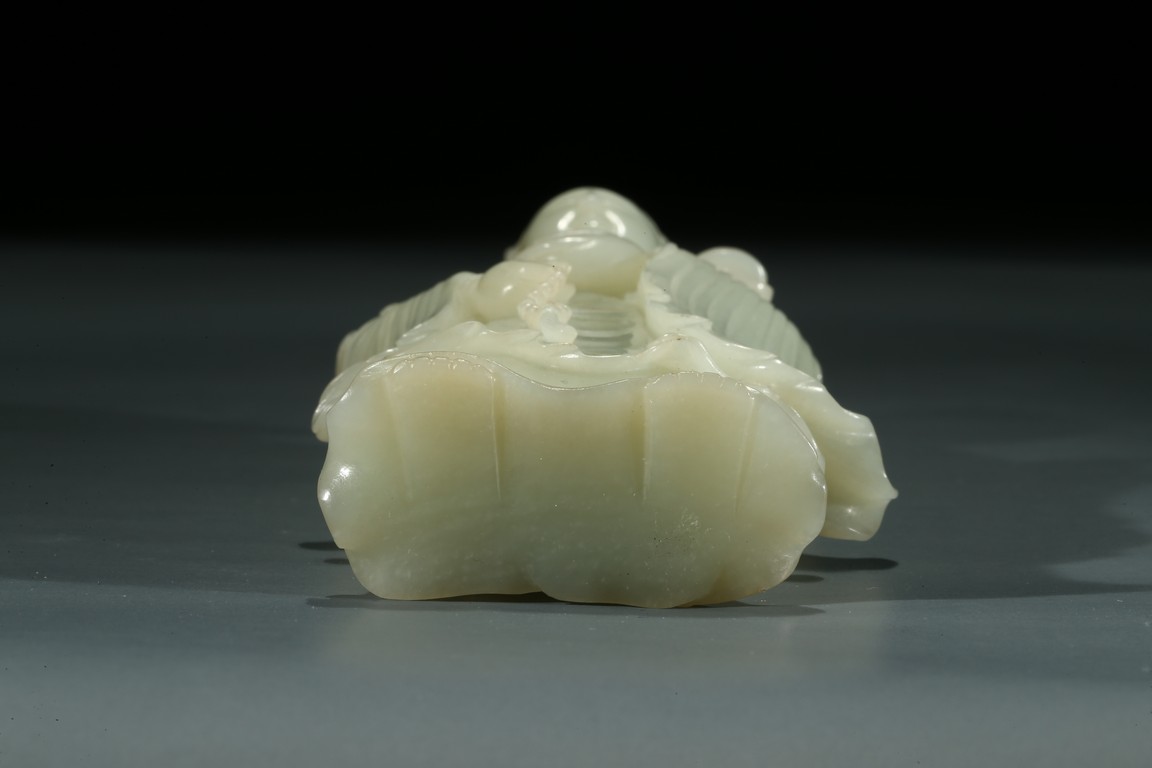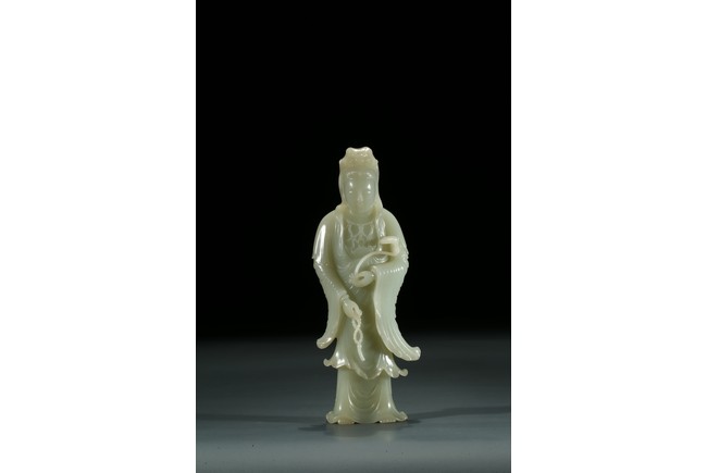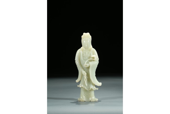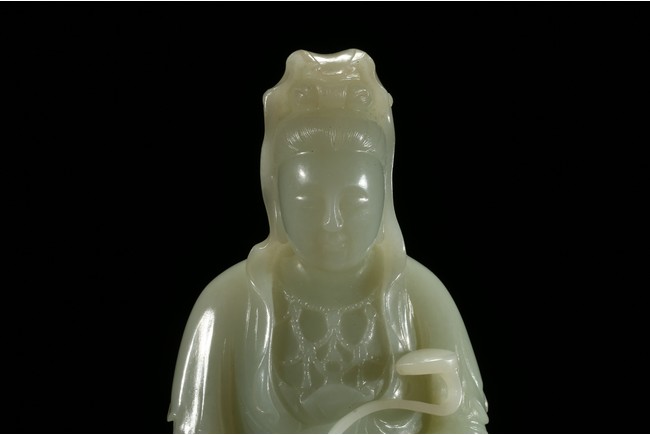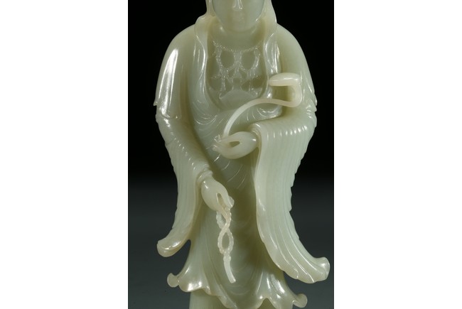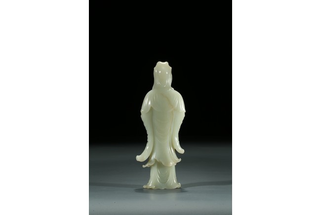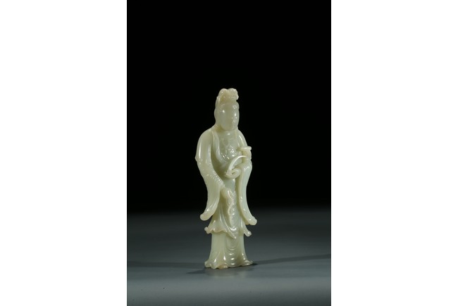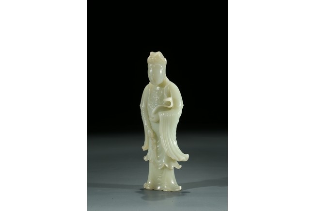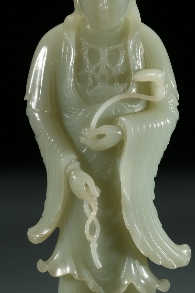 Standing gracefully dressed in long flowing robes, holding a ruyi sceptre on left hand, her face detailed with fine features and downcast eyes set in a benevolent expression, her hair tied up in a high chignon covered with a cowl, her chest adorned with beaded jewellery, the translucent stone of smooth white color.