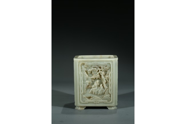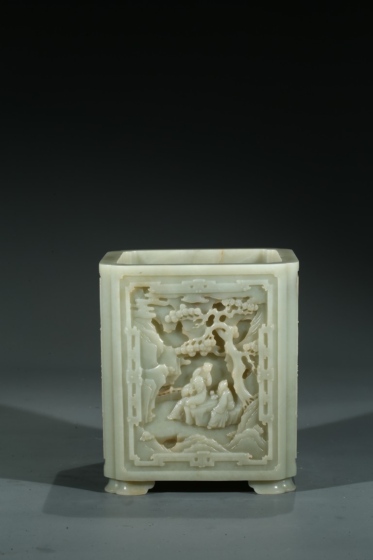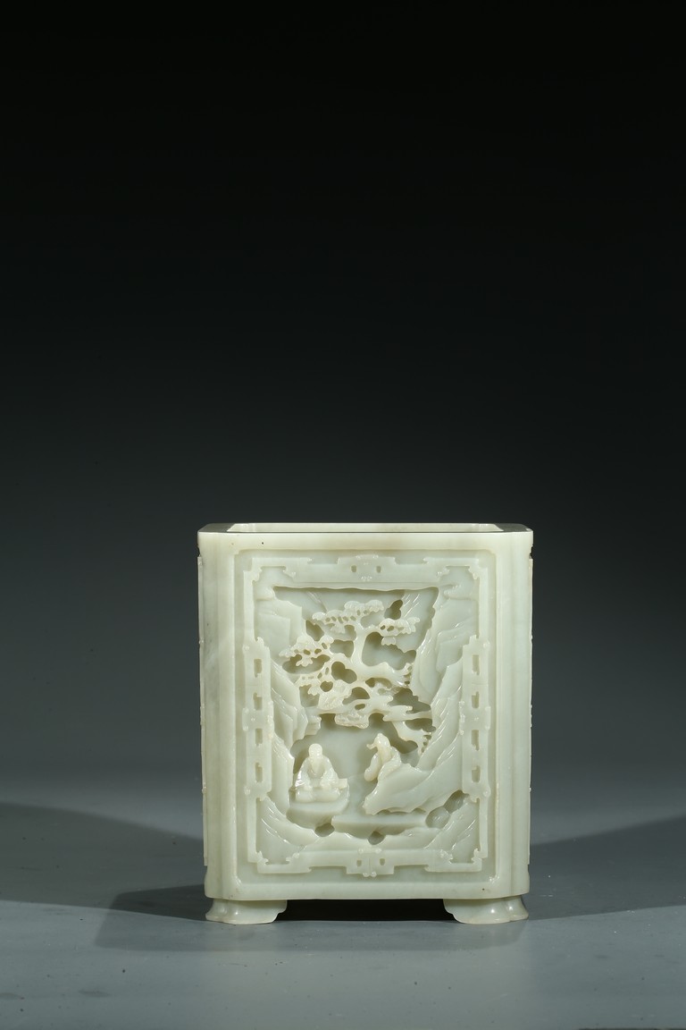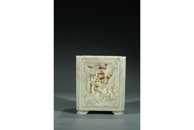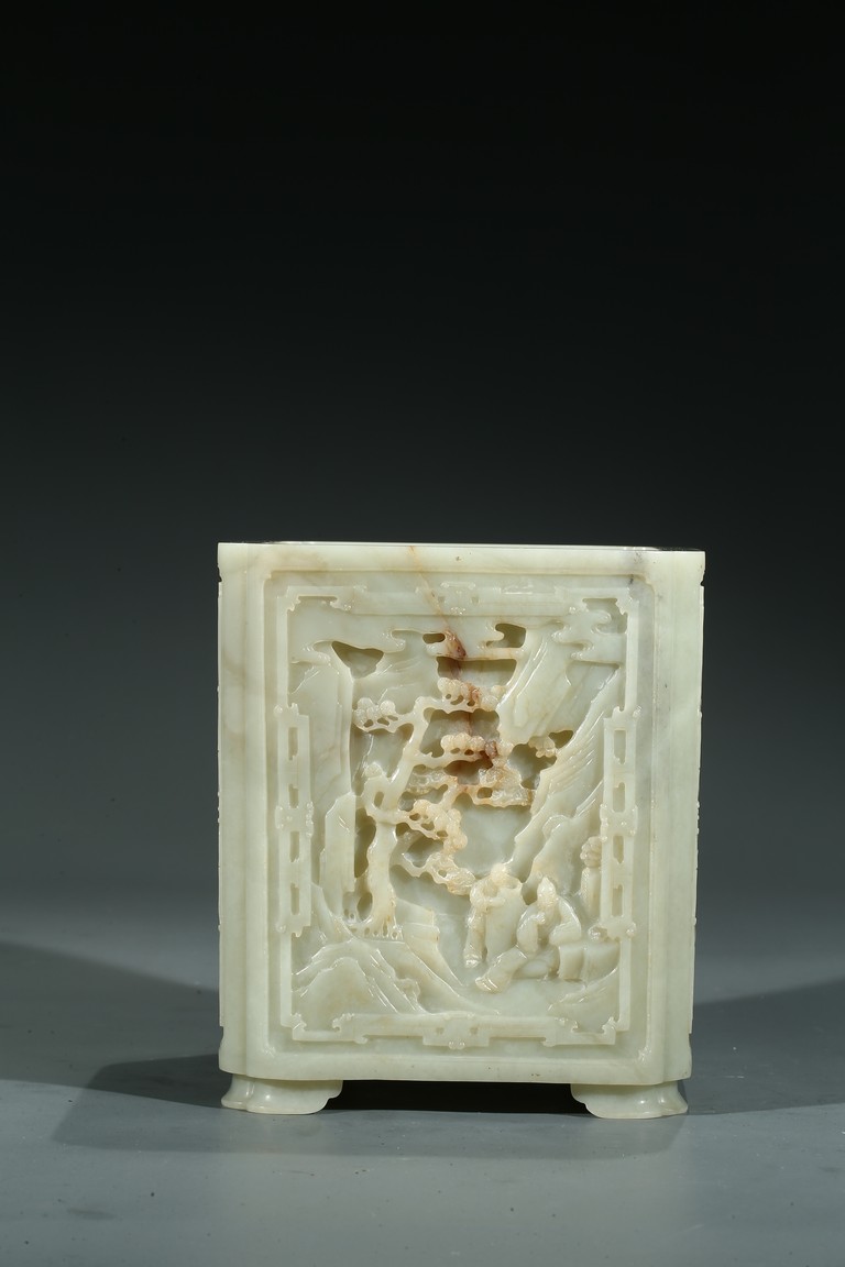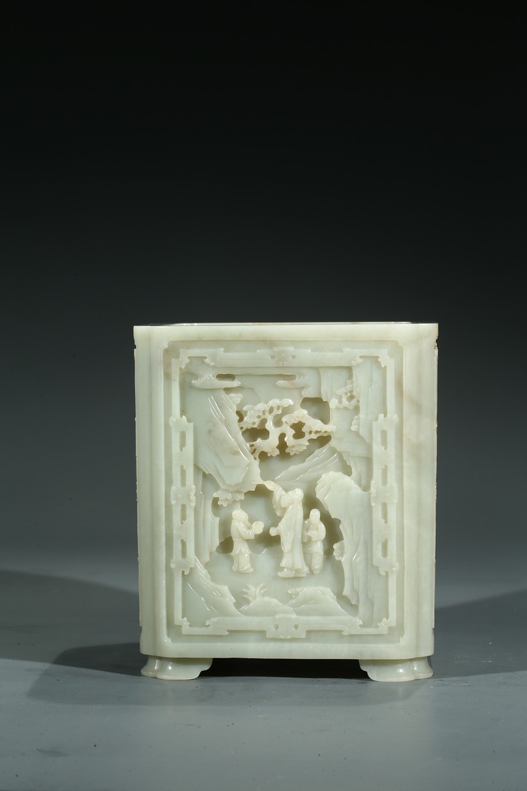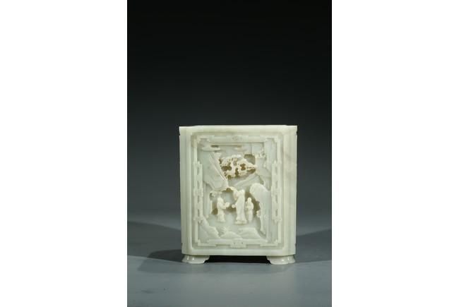 Of square section, each side carved in relief to depict scenes of scholars engaging leisure within a rocky mountain, all supported on four ruyi-shaped feet.