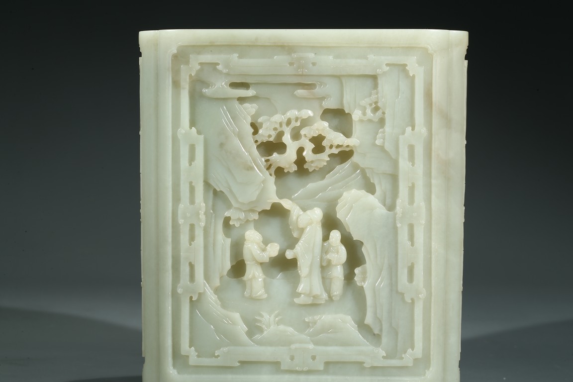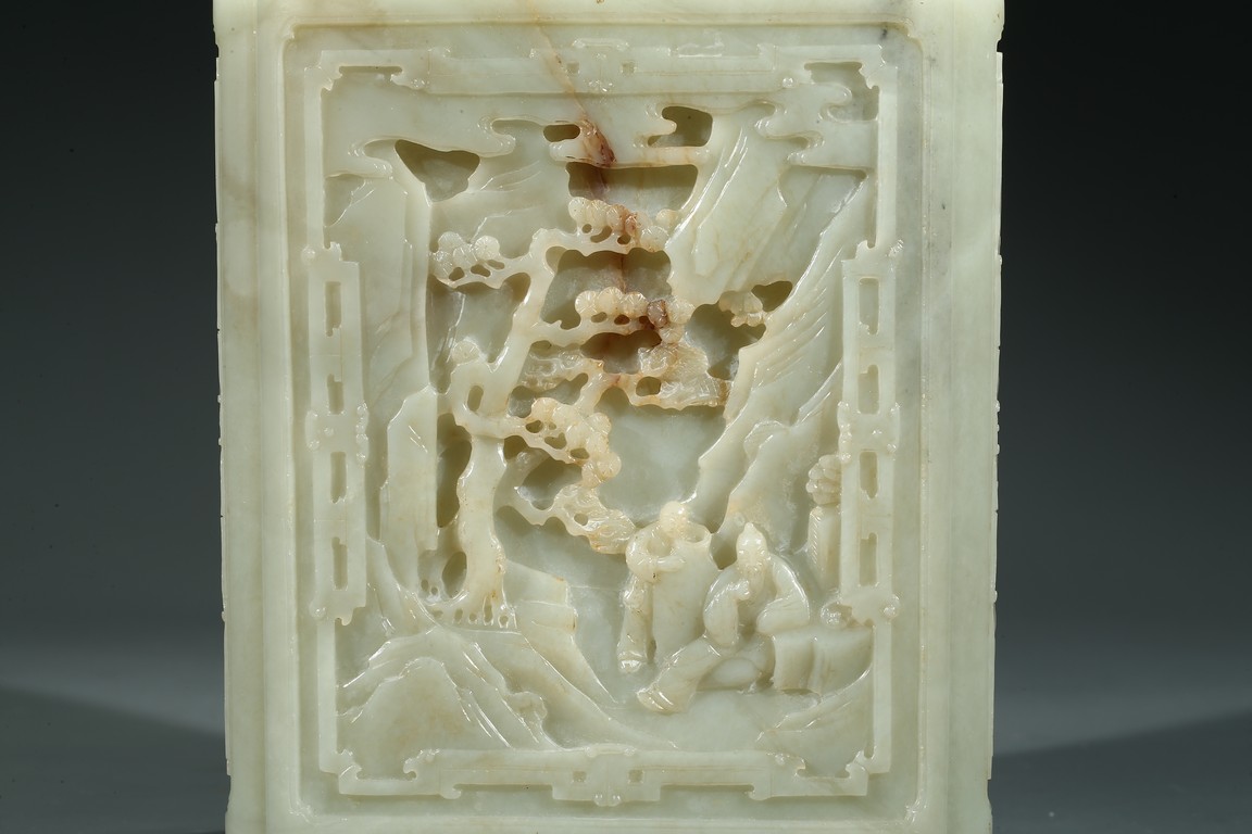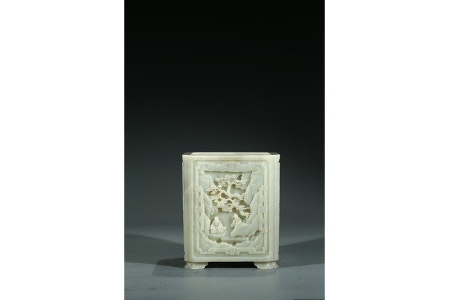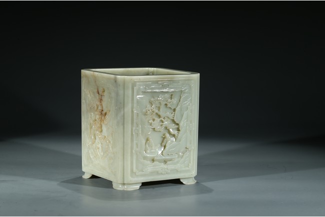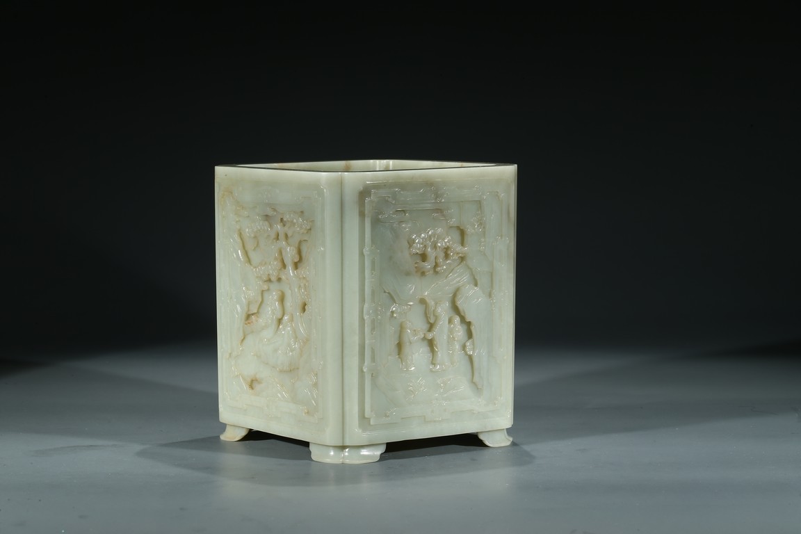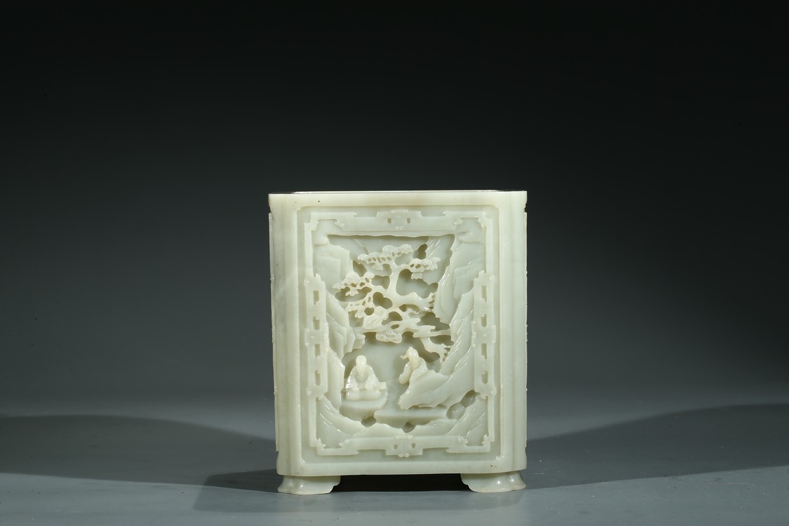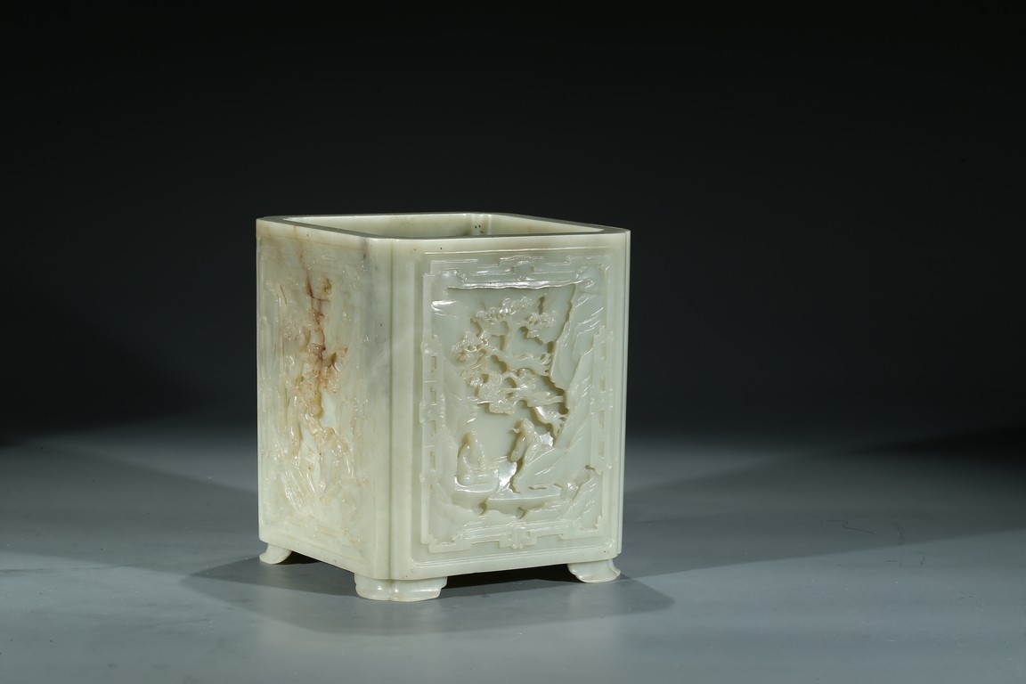 Of square section, each side carved in relief to depict scenes of scholars engaging leisure within a rocky mountain, all supported on four ruyi-shaped feet.