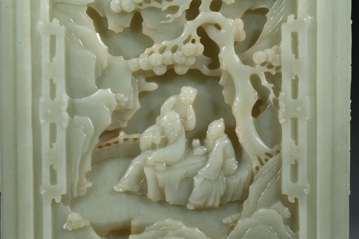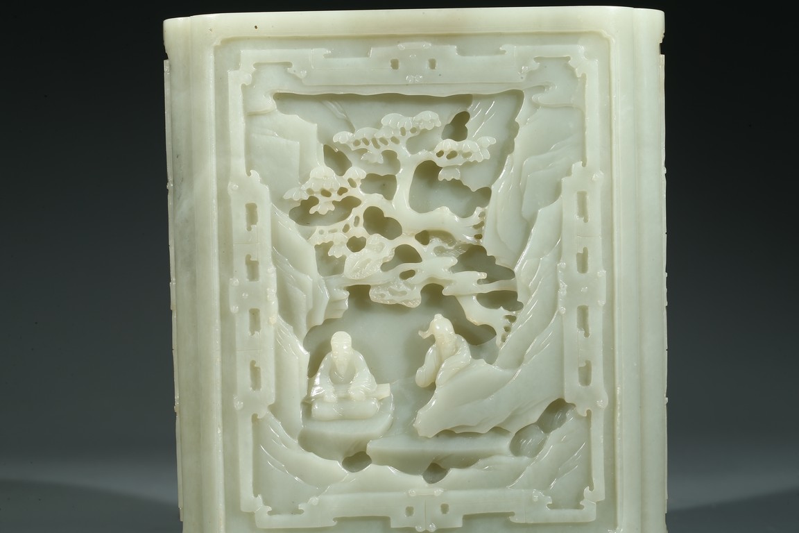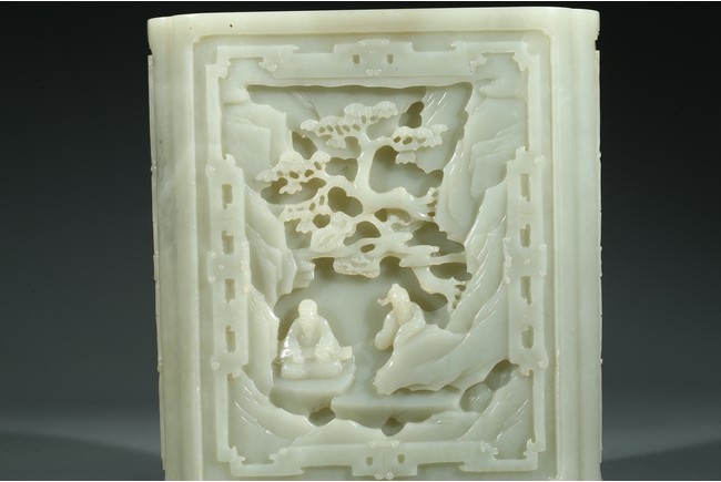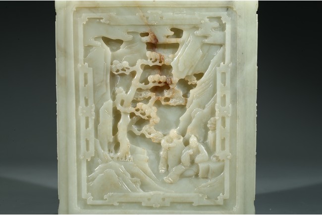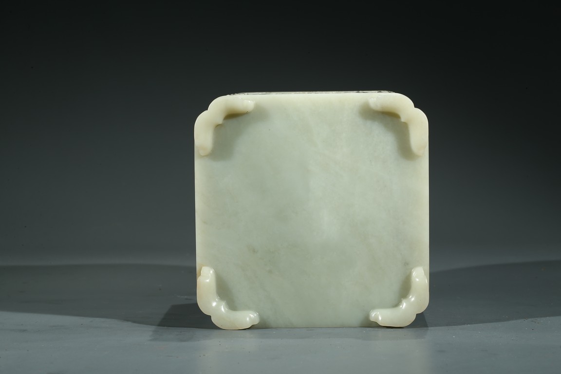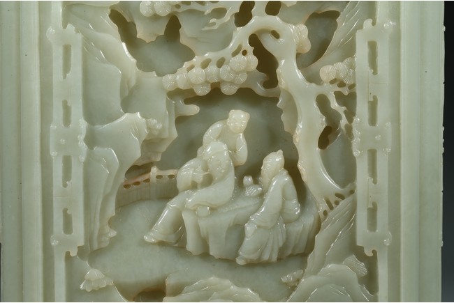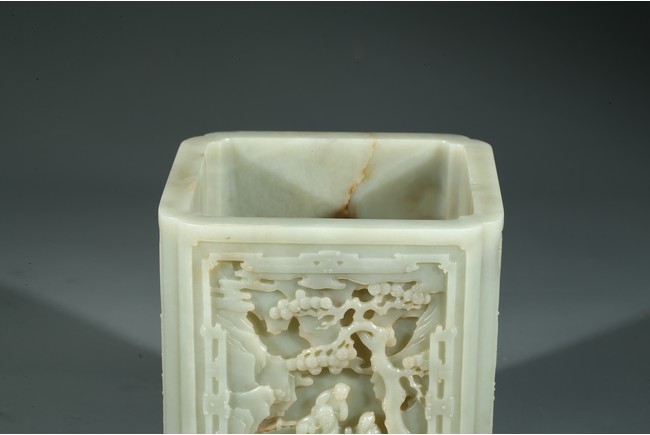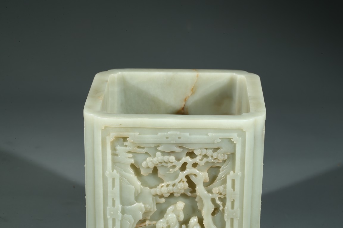 Of square section, each side carved in relief to depict scenes of scholars engaging leisure within a rocky mountain, all supported on four ruyi-shaped feet.