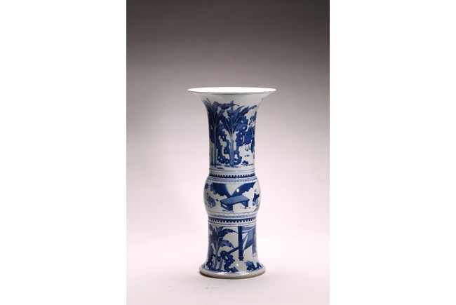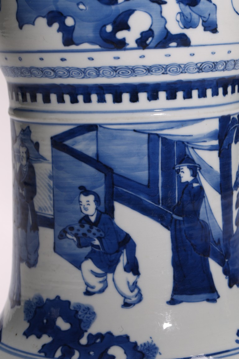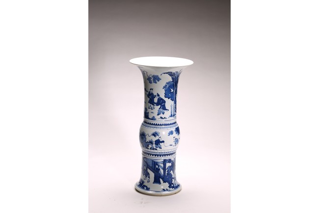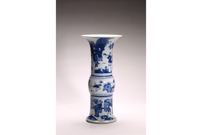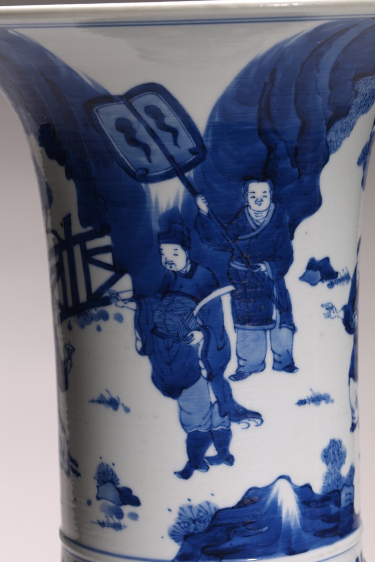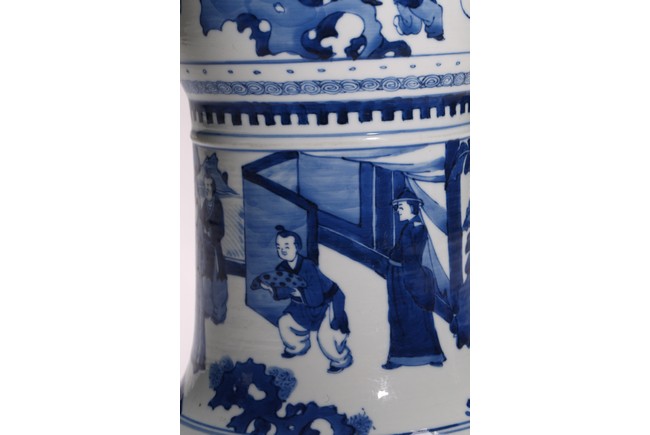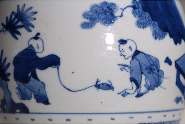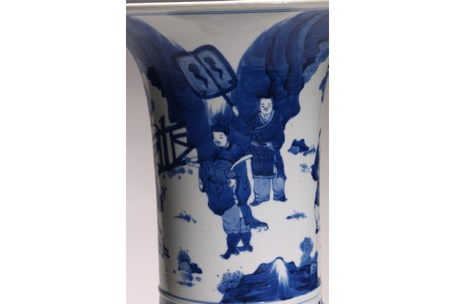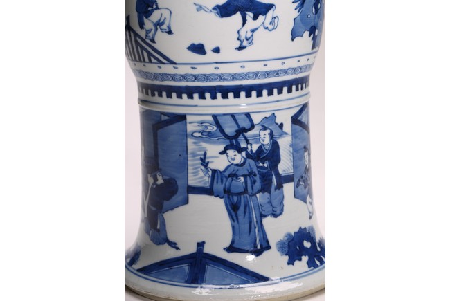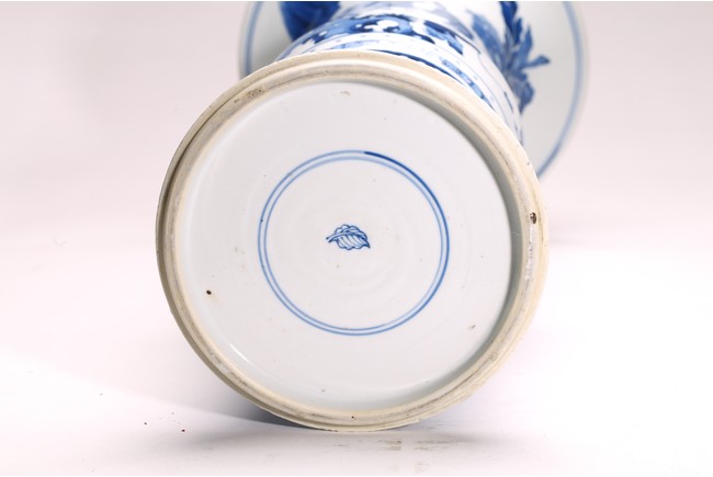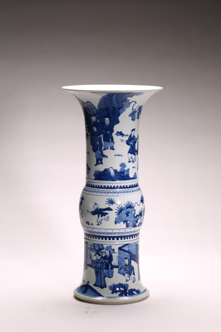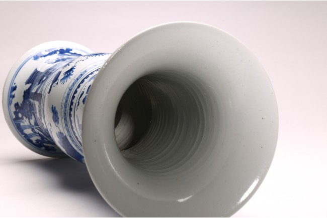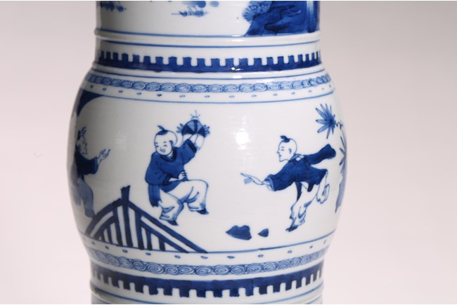 Qing Dynasty period.Of cylindrical form, with a flaring mouth and foot, the middle section vibrantly painted with scenes depicting playful children, the upper and lower section with scenes of scholars and attendants, base with a pictogram within double ring.