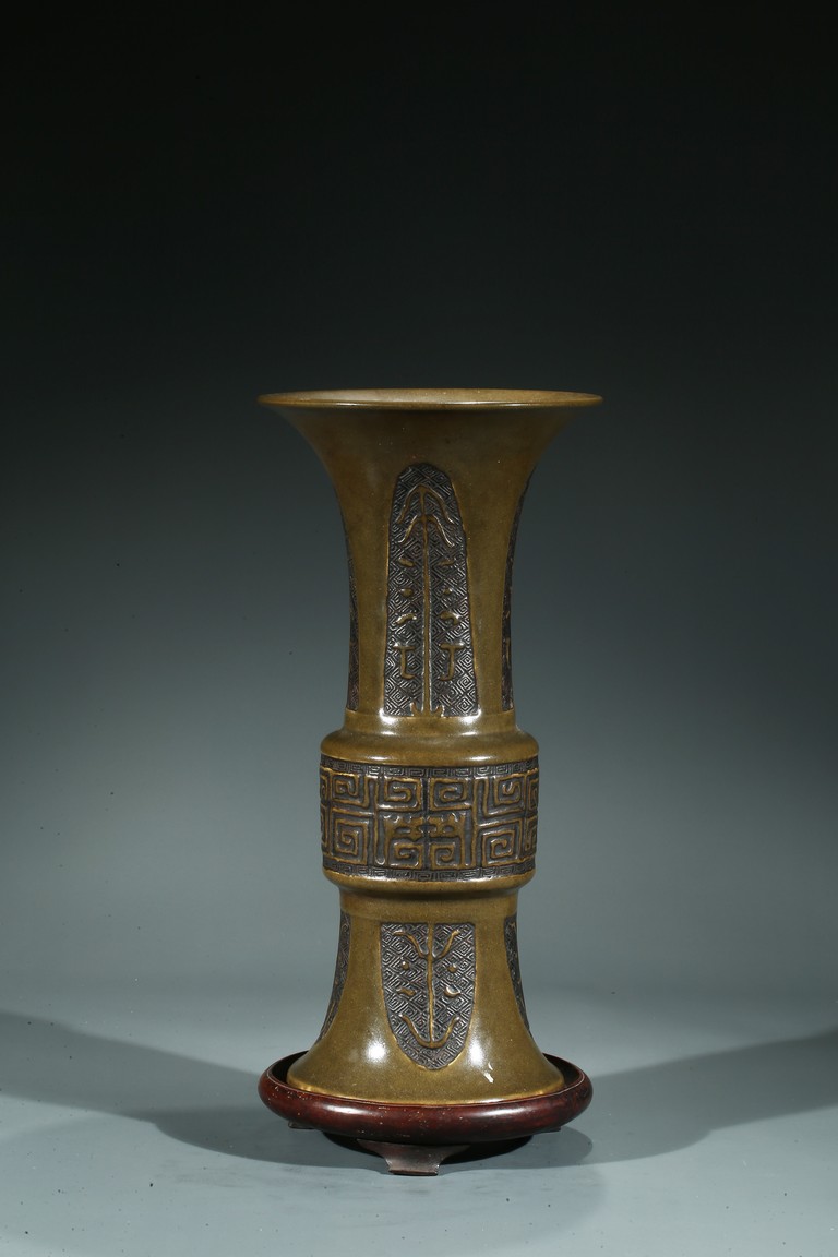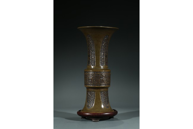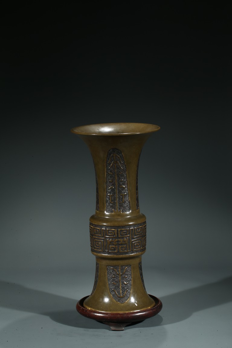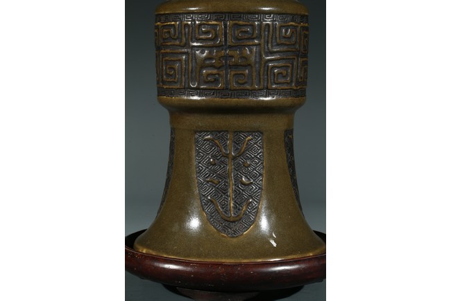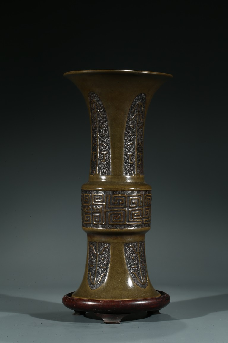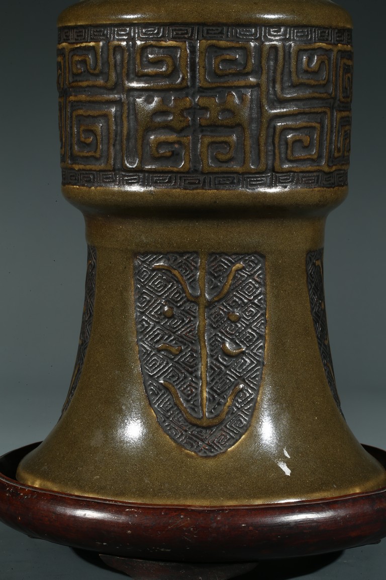 Qing Dynasty period. Of archaistic gu form, of slender form rising from a flared foot to a trumpet mouth, the waisted center carved with key-fret pattern, beneath upright and pendent panels of plantain leaves, covered overall in a deep olive-green, fitted on wood stand.