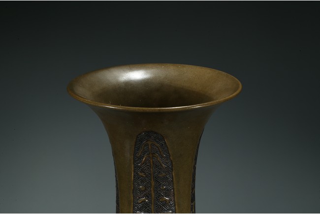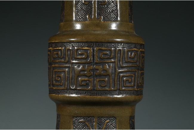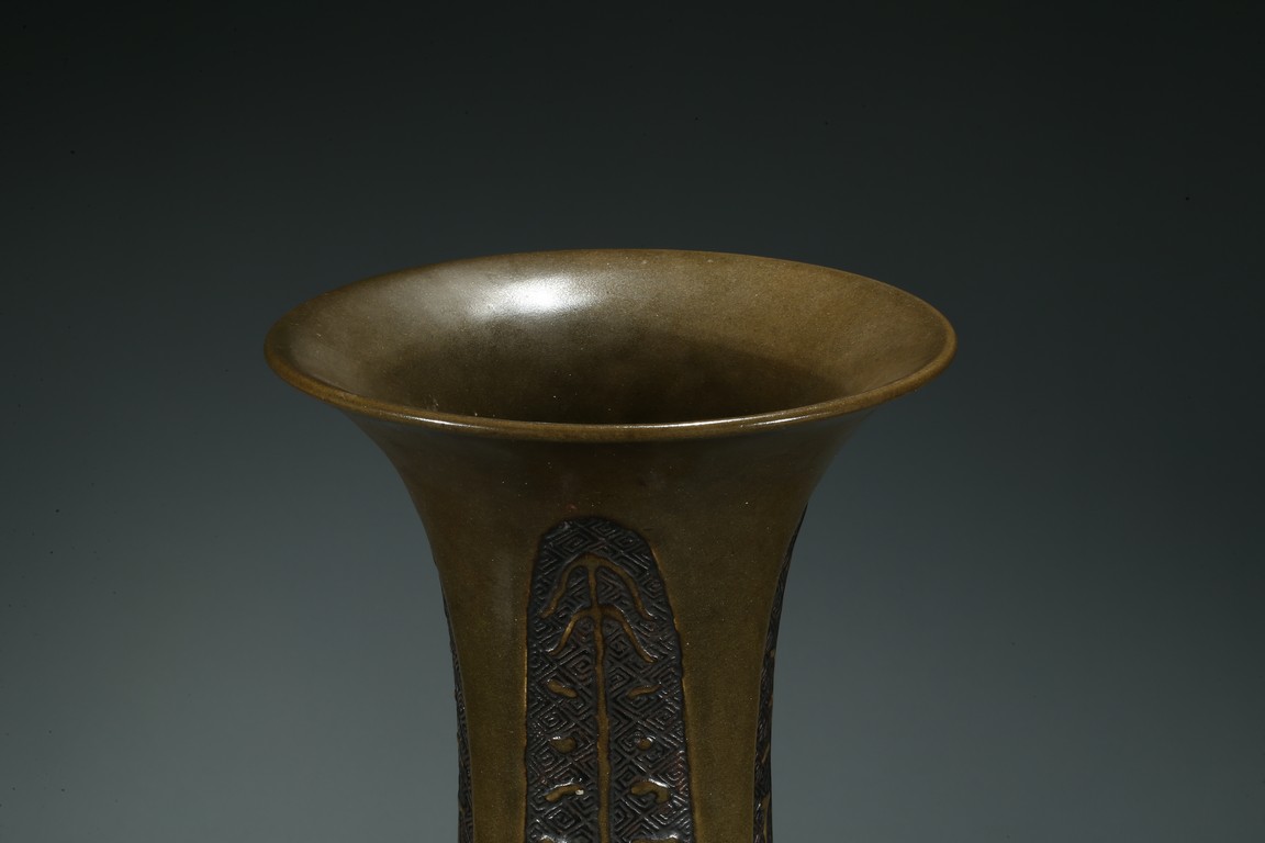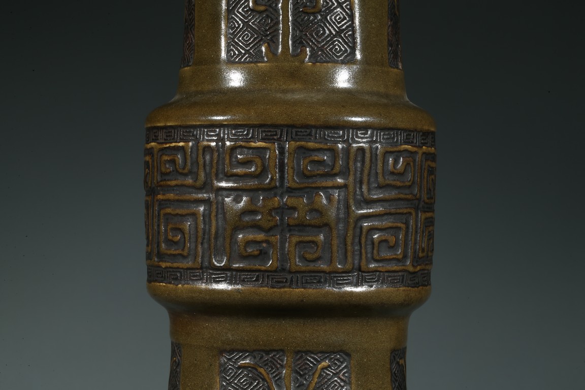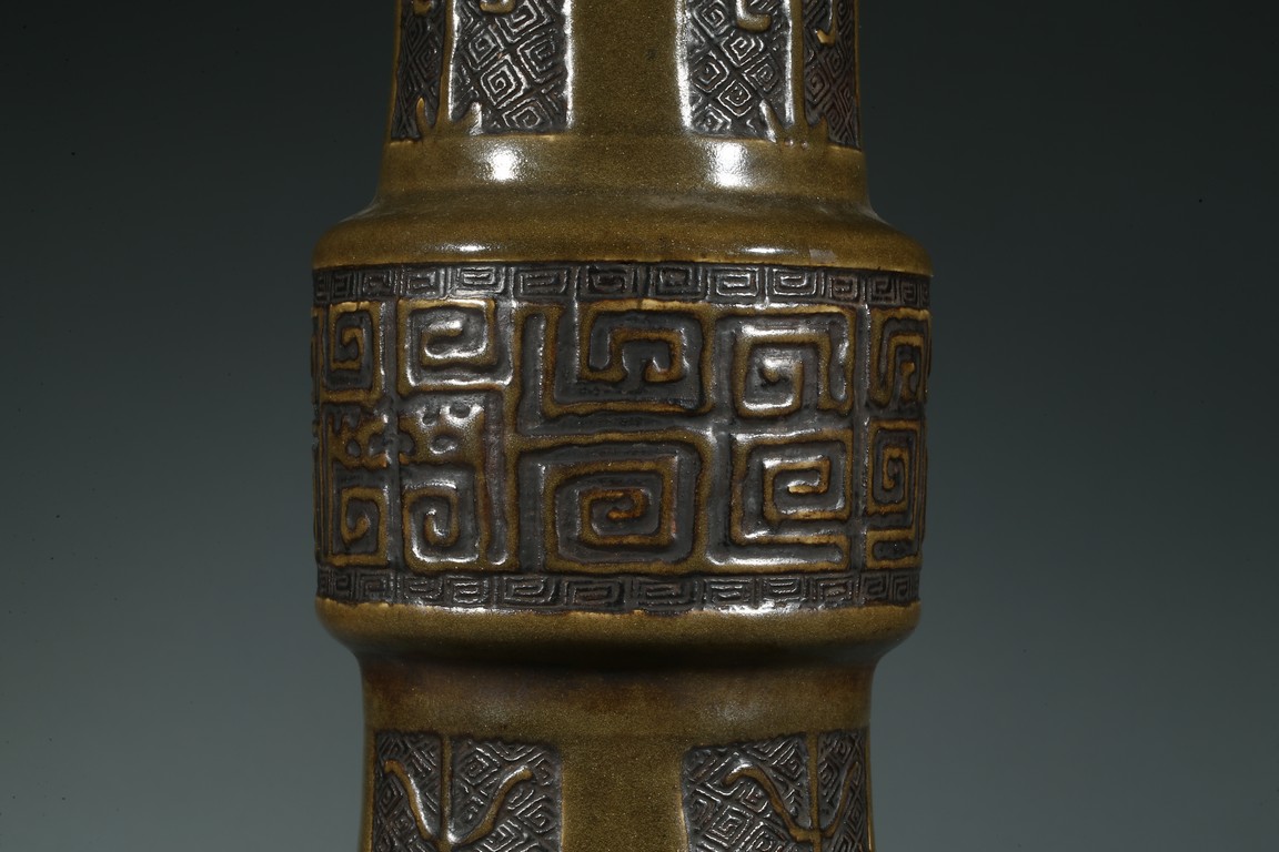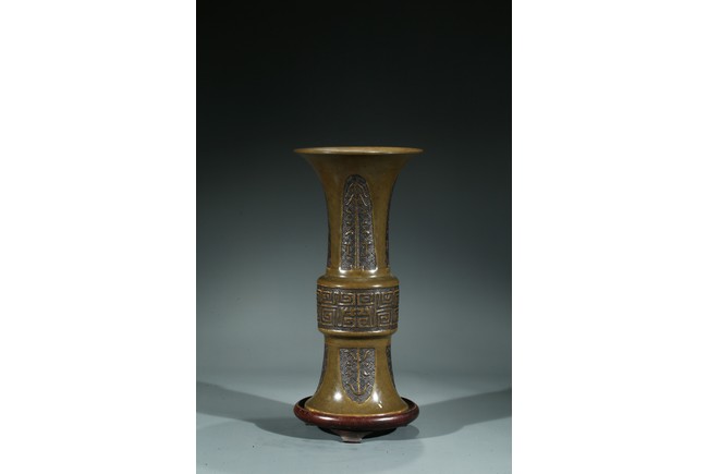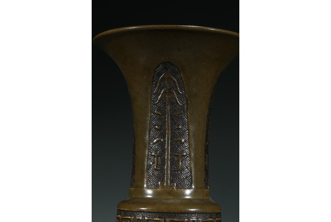 Qing Dynasty period. Of archaistic gu form, of slender form rising from a flared foot to a trumpet mouth, the waisted center carved with key-fret pattern, beneath upright and pendent panels of plantain leaves, covered overall in a deep olive-green, fitted on wood stand.