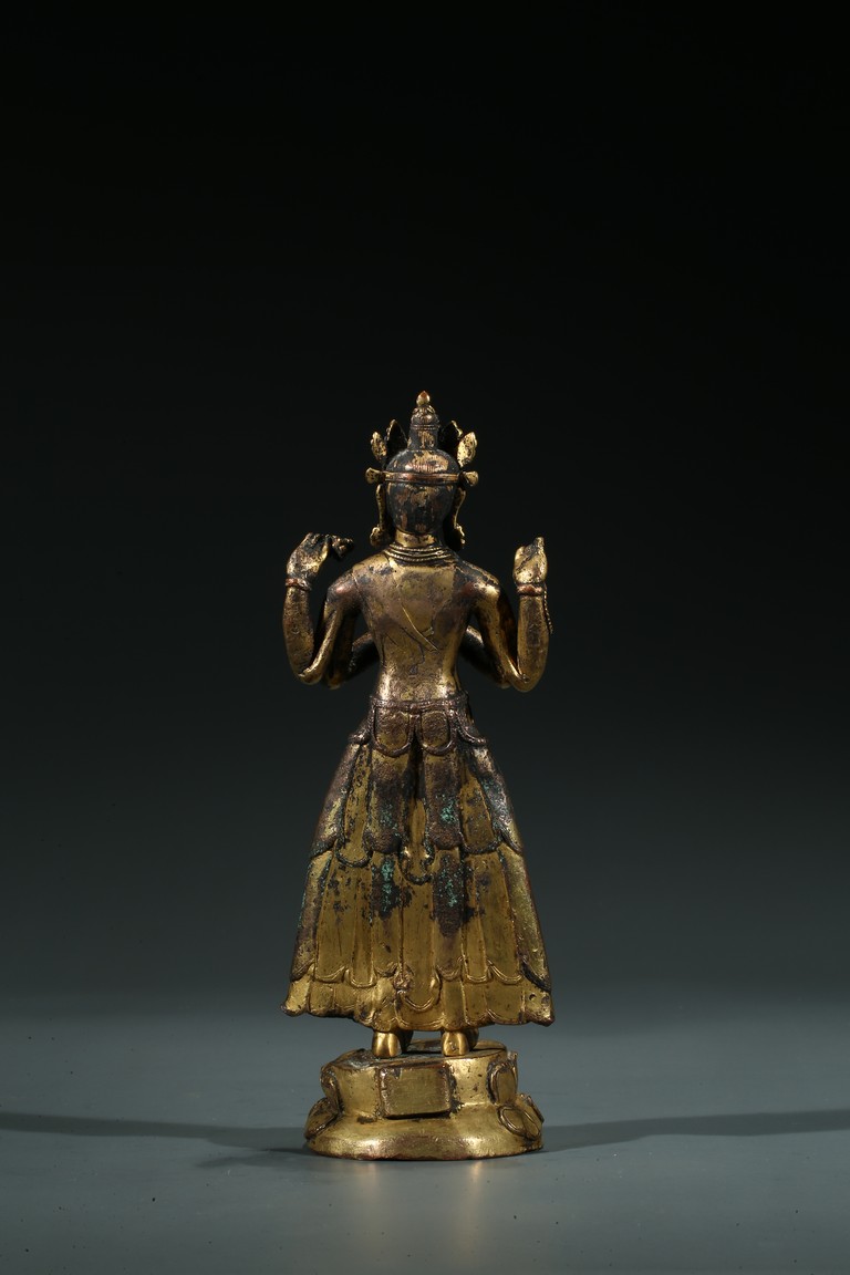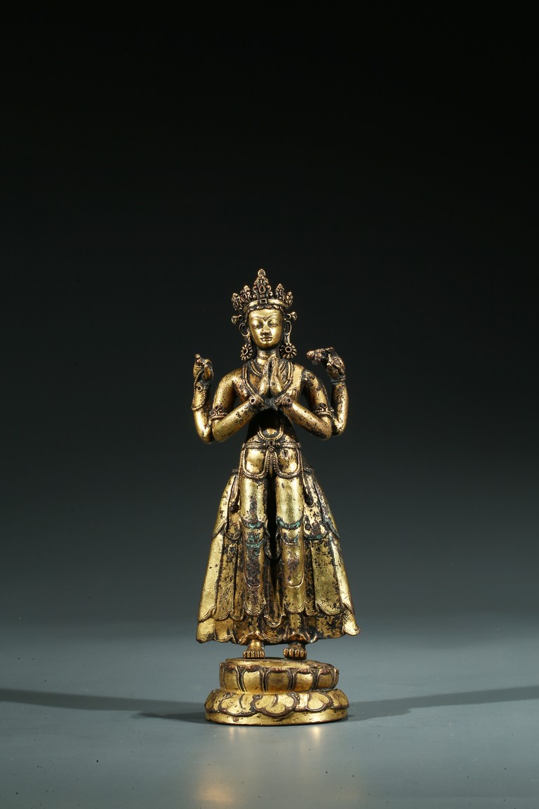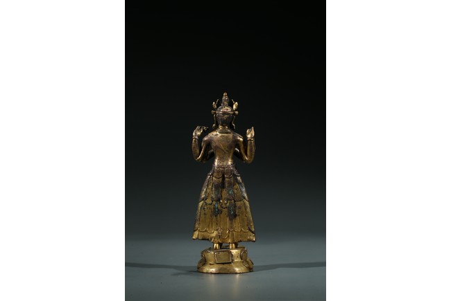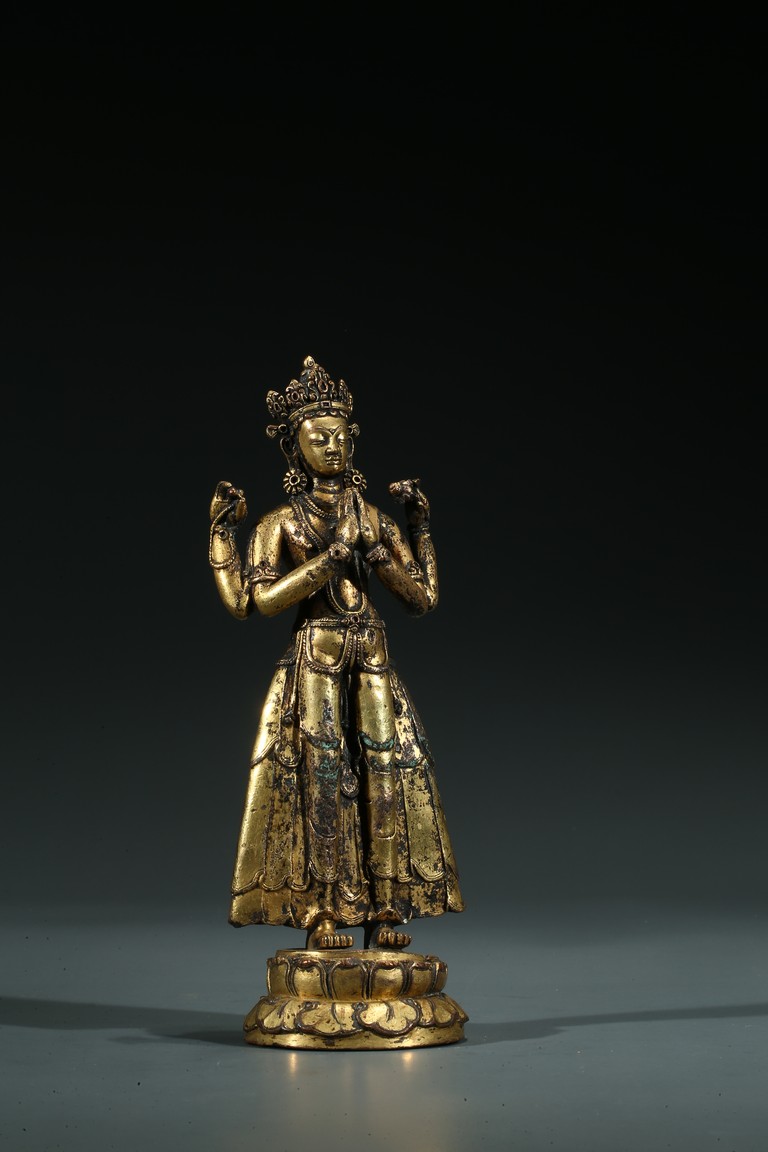 The finely cast figure shown standing upon double lotus throne with four arms, wearing pair of large circular earrings, the face with meditative expression.