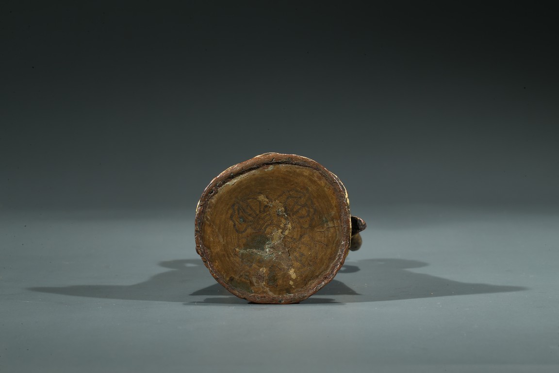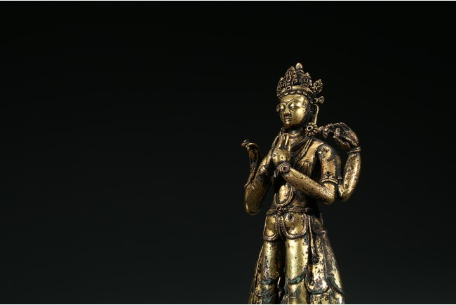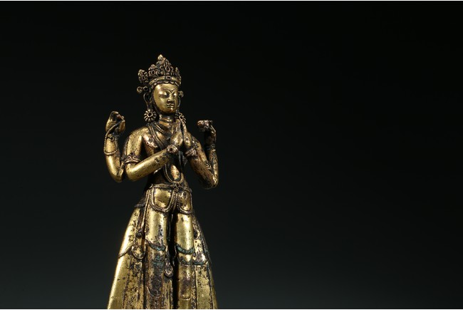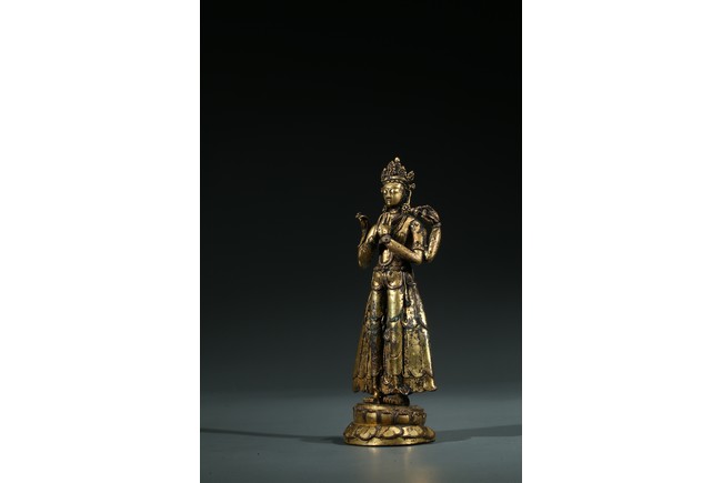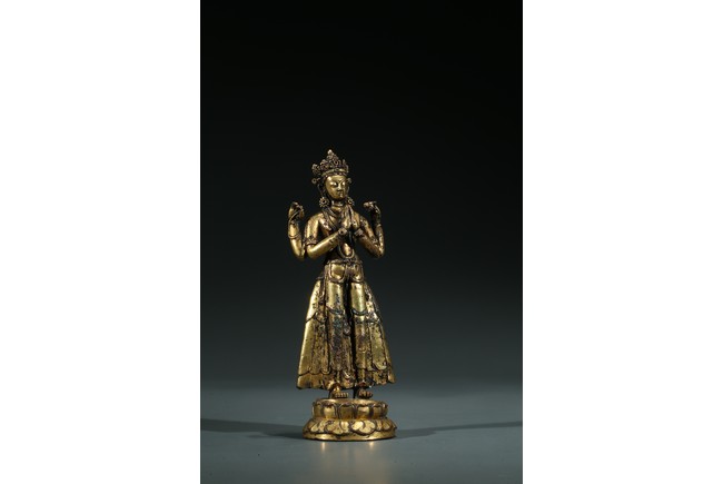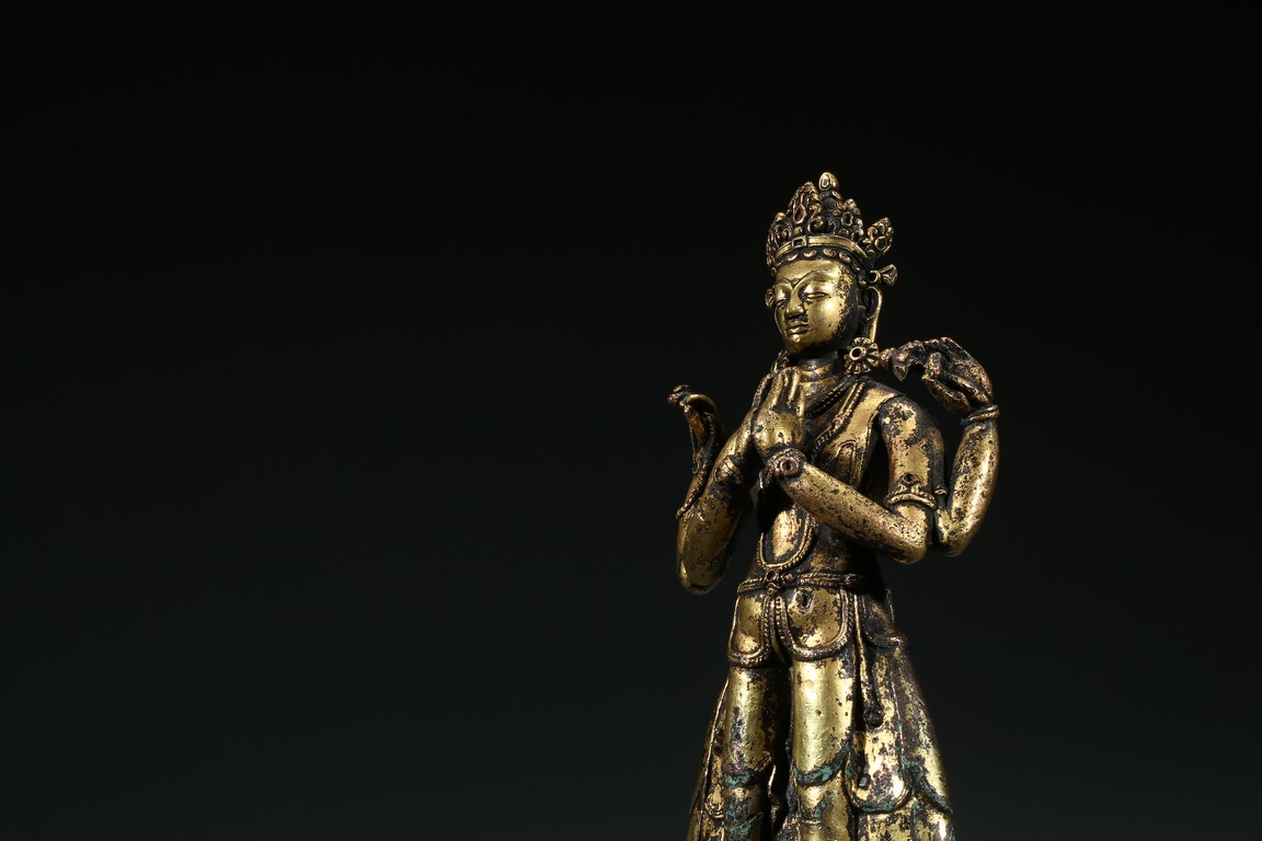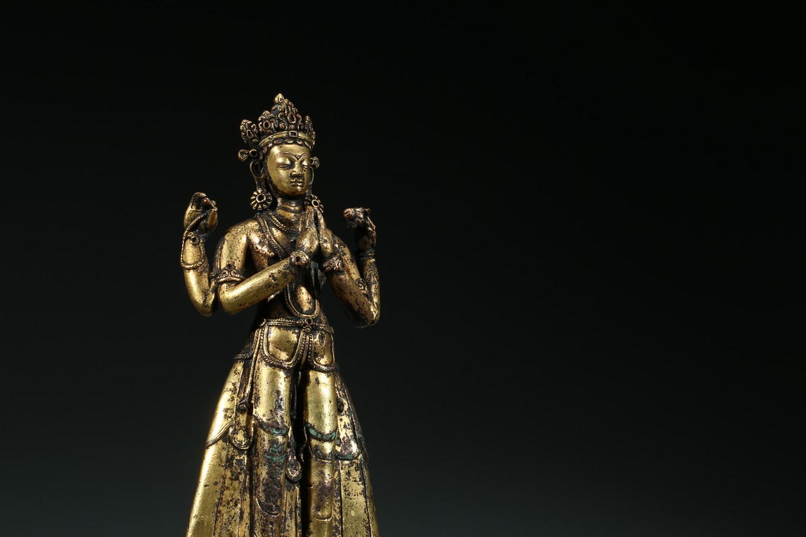 The finely cast figure shown standing upon double lotus throne with four arms, wearing pair of large circular earrings, the face with meditative expression.