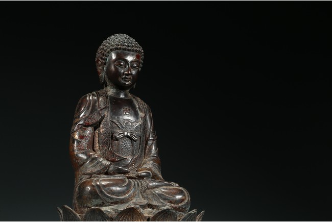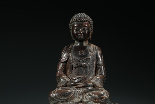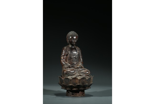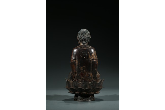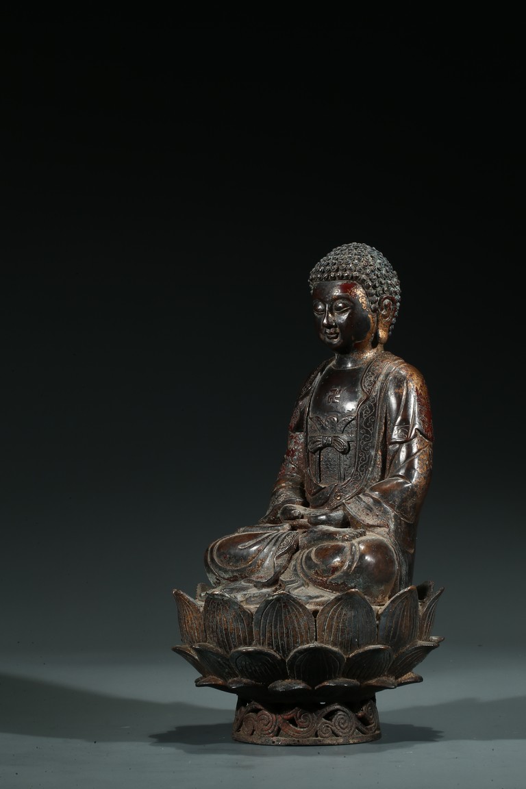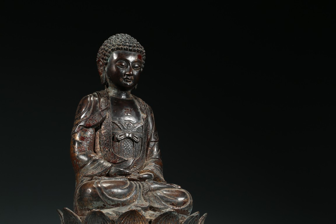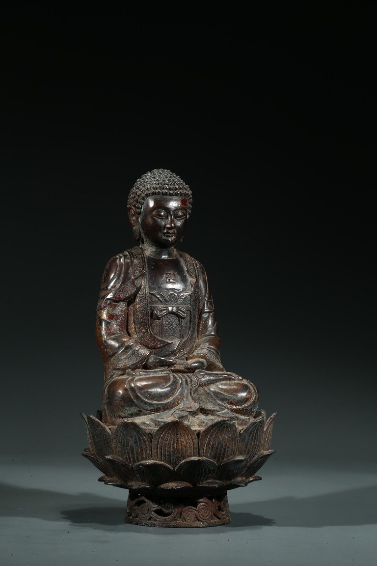 The Buddha cast in vajraparyankasana and dhyana mudra, the hair in neat whorls over the ushnisha and the face in a serene state of meditation, wearing a robe draped over the rounded shoulders and a similarly decorated dhoti, both with incised flowers and lotus meander, chest with a buddhist symbol, all raised on a lotus petal base.