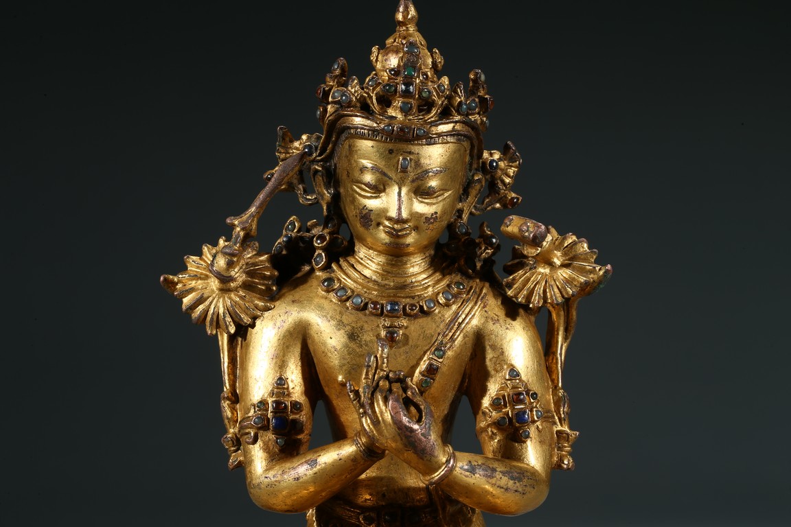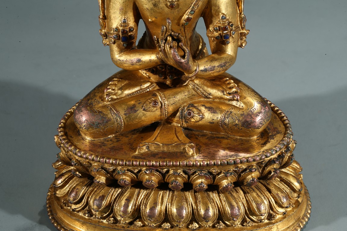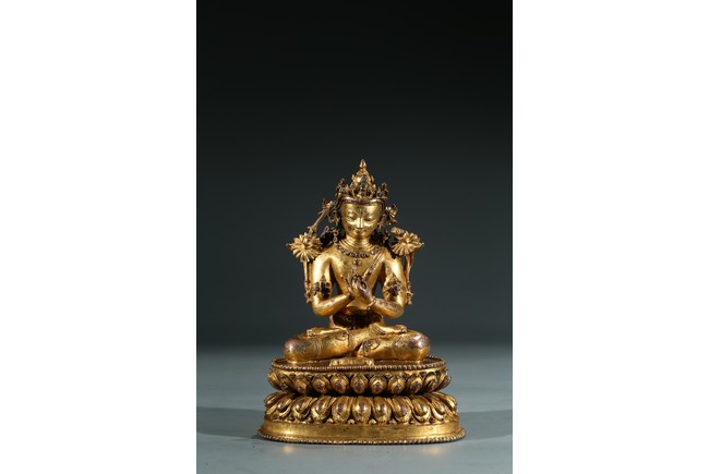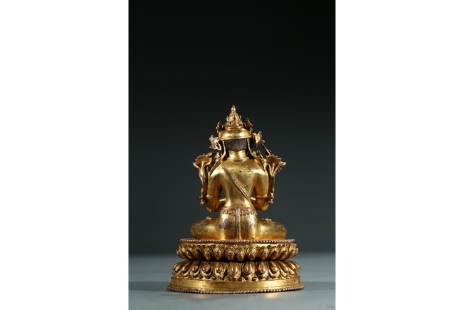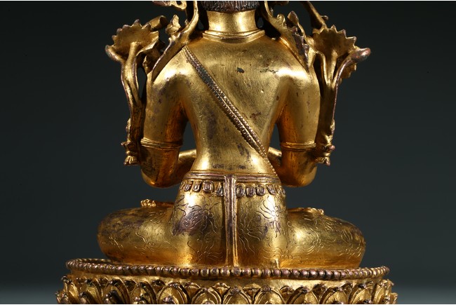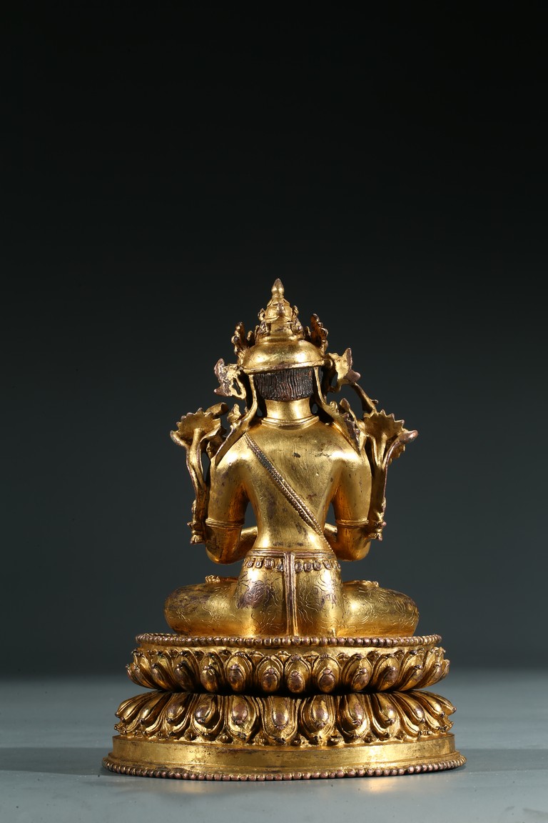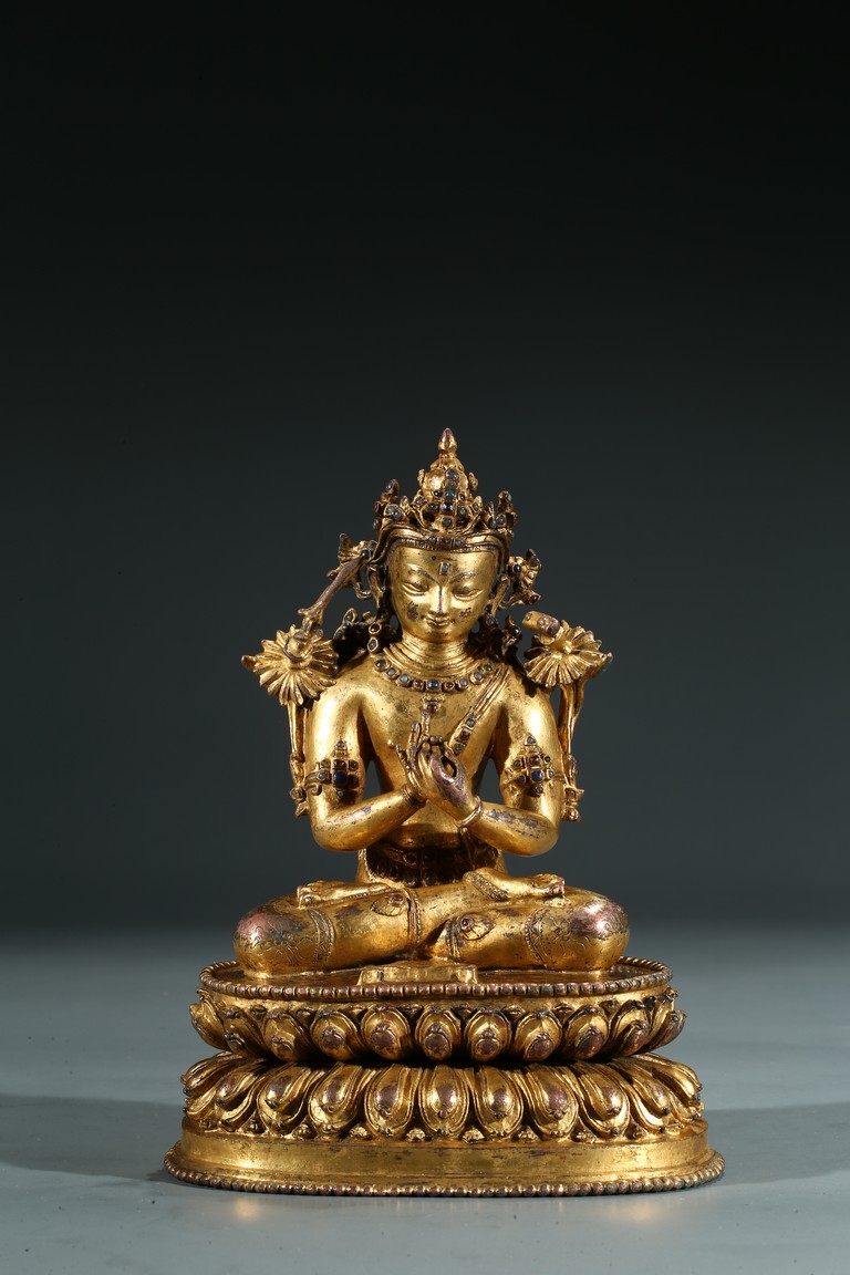 Cast seated on double lotus throne, body wearing elaborate beaded jewelry embellished with various gems, both hands raised in front of chest in buddhist gesture, his shoulders flanked with flowers and attributes, his face with a serene expression.