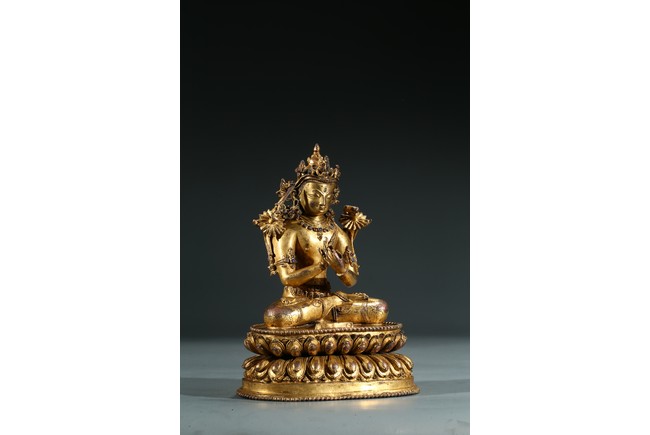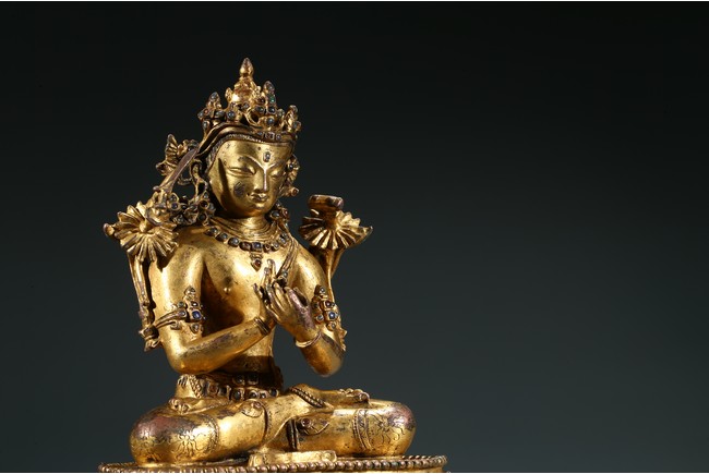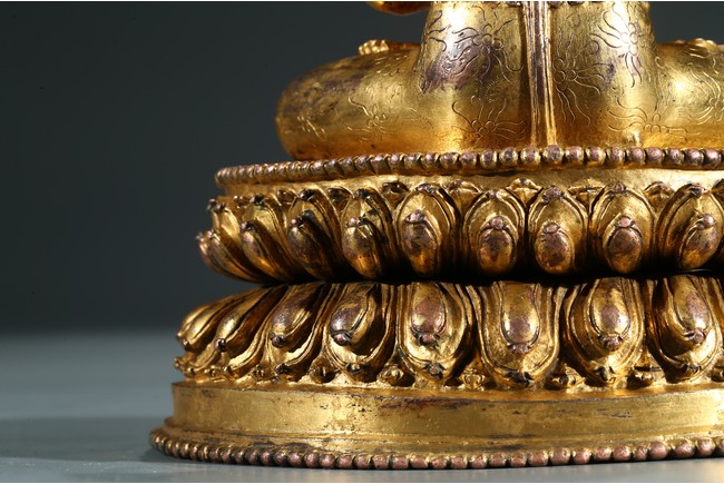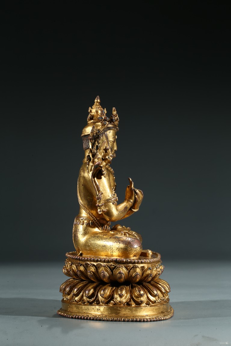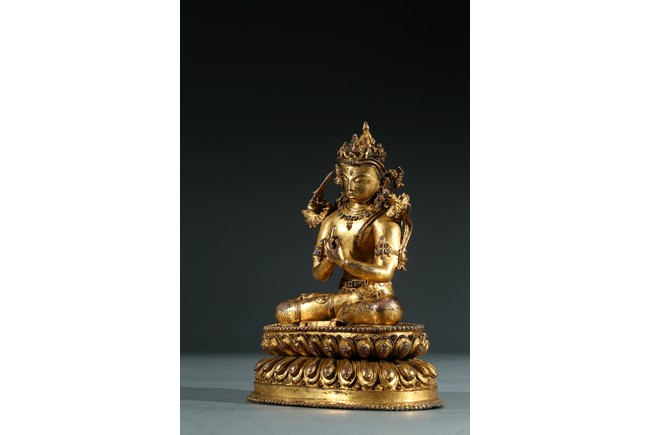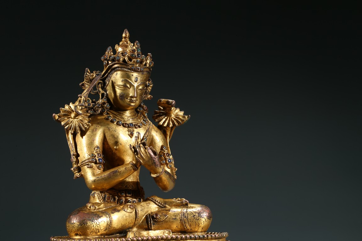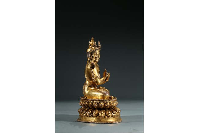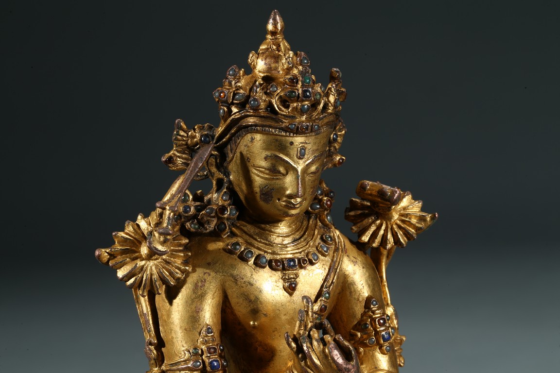 Cast seated on double lotus throne, body wearing elaborate beaded jewelry embellished with various gems, both hands raised in front of chest in buddhist gesture, his shoulders flanked with flowers and attributes, his face with a serene expression.