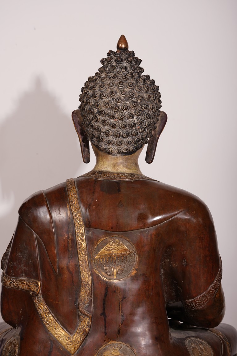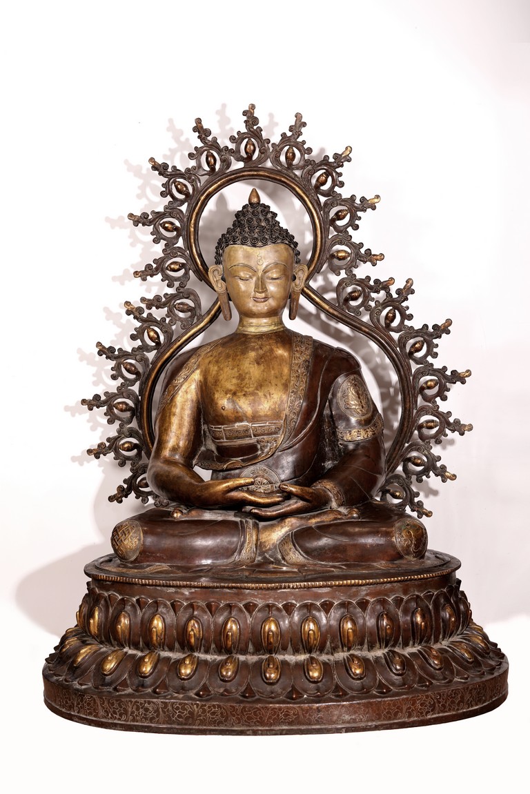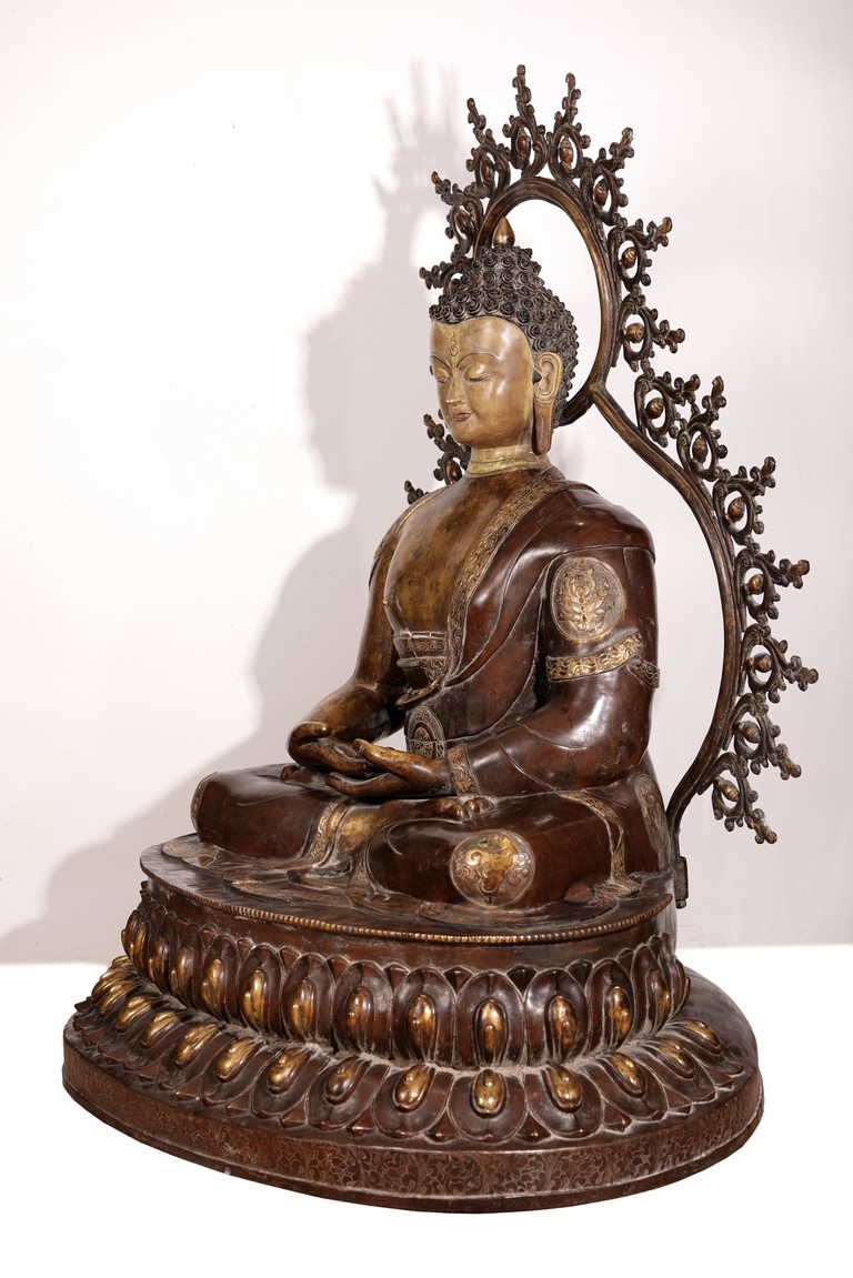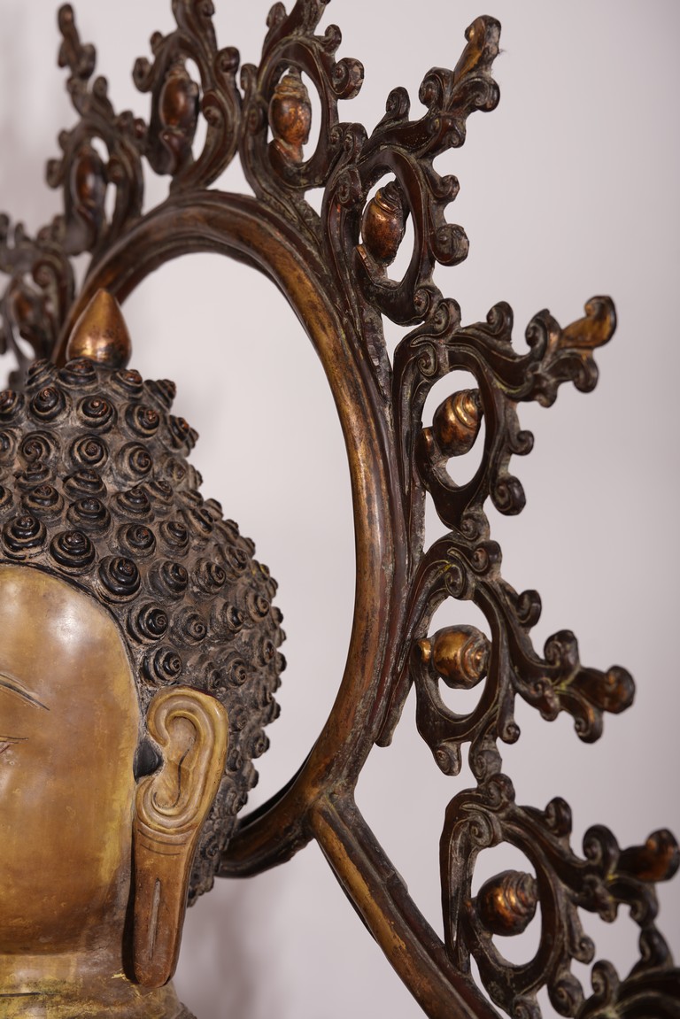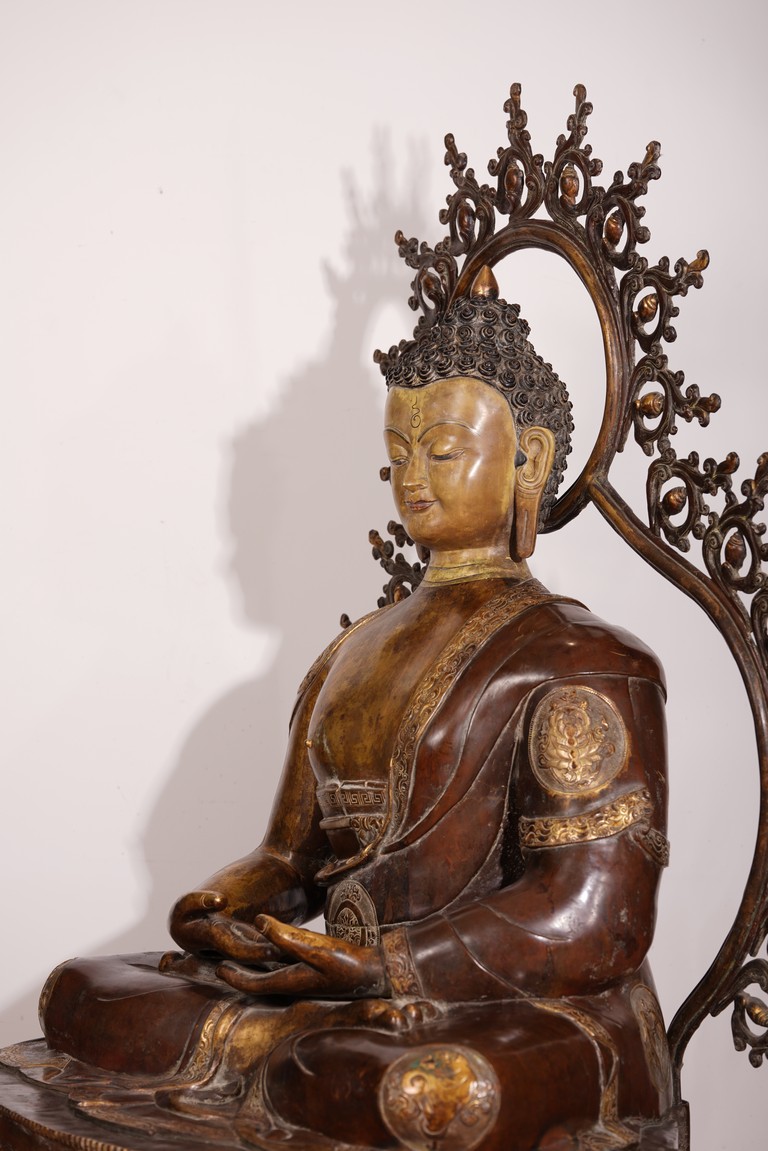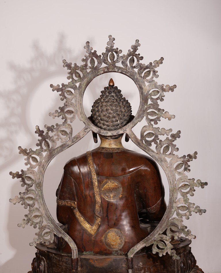 Qing Dynasty period. Heavily cast seated in dhyanasana on a double lotus throne with his hands in dhyana mudra, wearing a sanghati with incised hems and medallions decorations, the face with downcast eyes and gentle smile, flanked by a pair of long pendulous earlobes, backed by a flame-shape mandorla.
