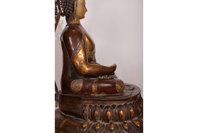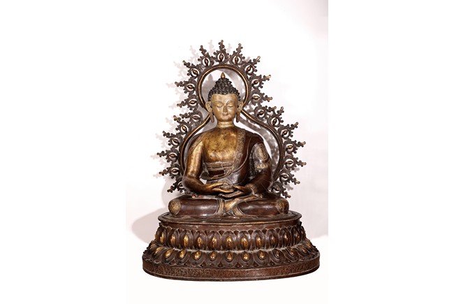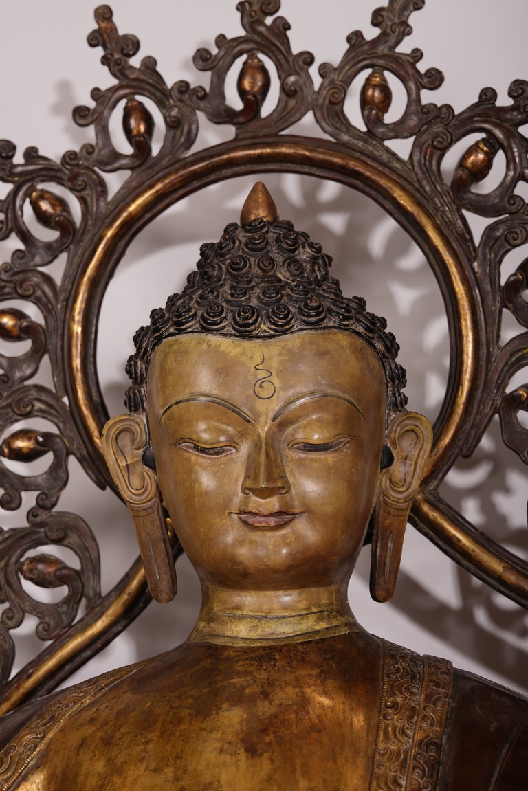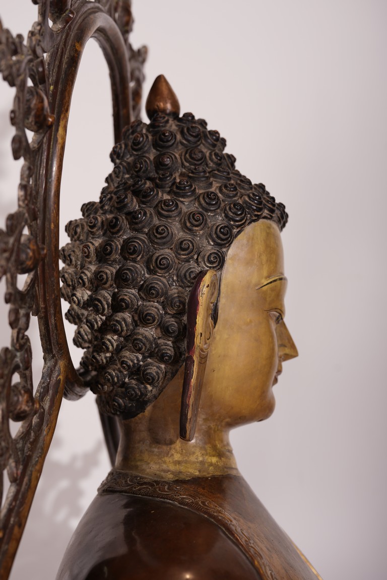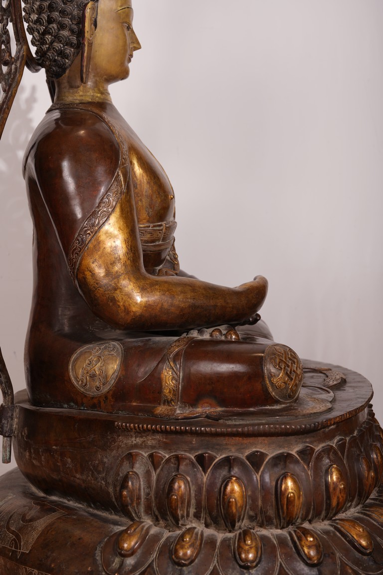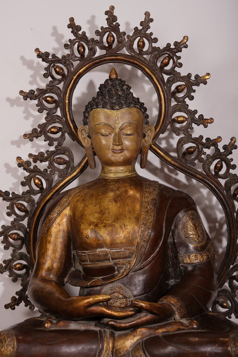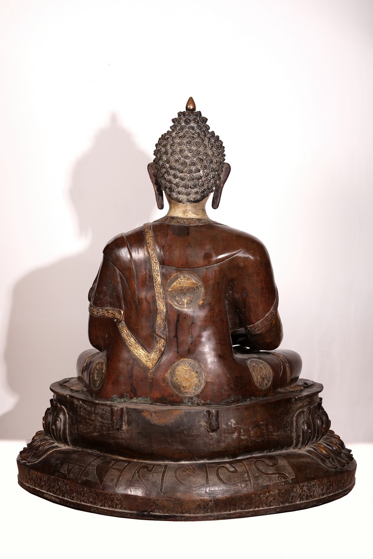 Qing Dynasty period. Heavily cast seated in dhyanasana on a double lotus throne with his hands in dhyana mudra, wearing a sanghati with incised hems and medallions decorations, the face with downcast eyes and gentle smile, flanked by a pair of long pendulous earlobes, backed by a flame-shape mandorla.