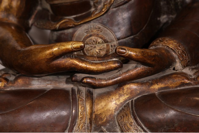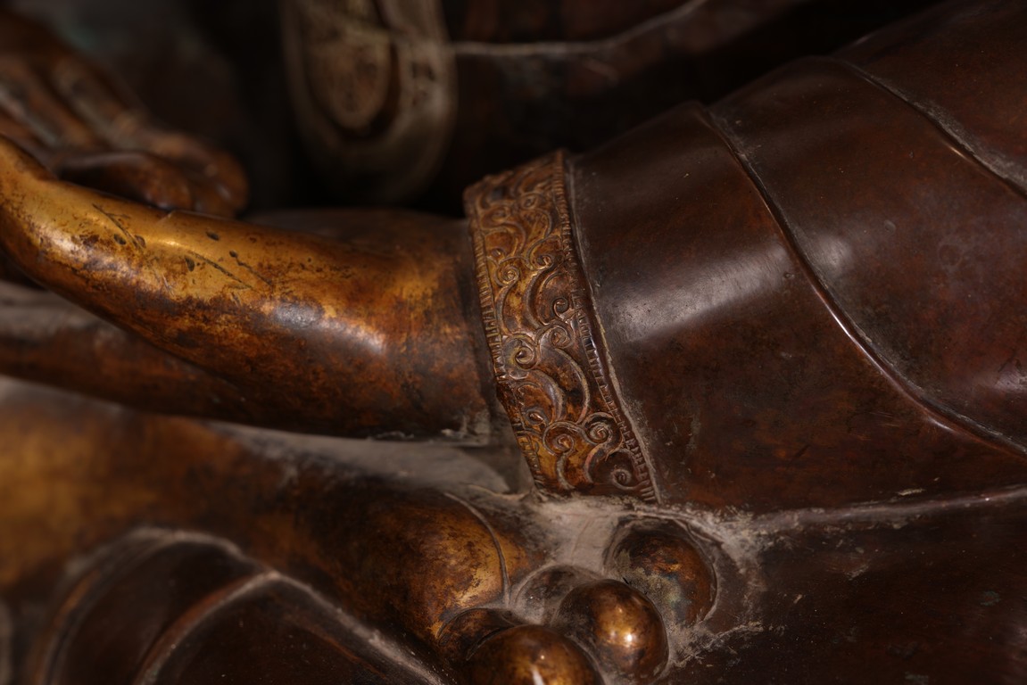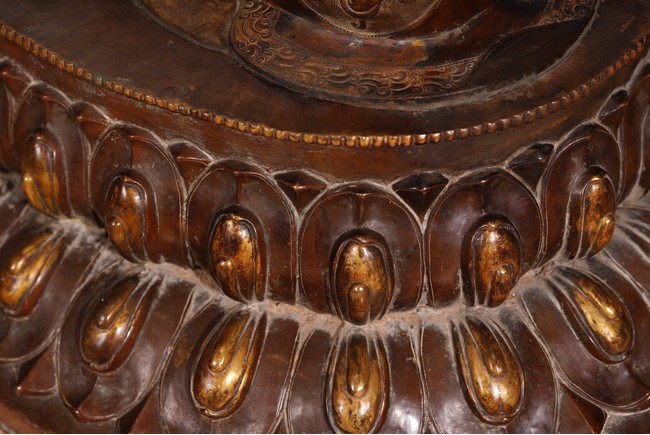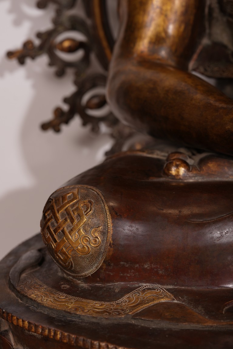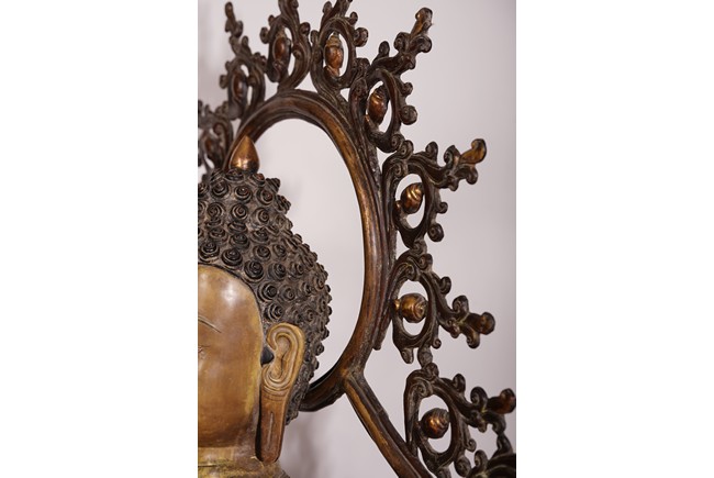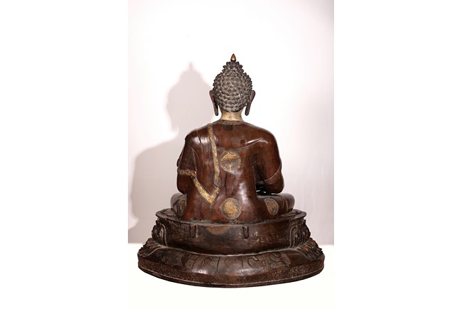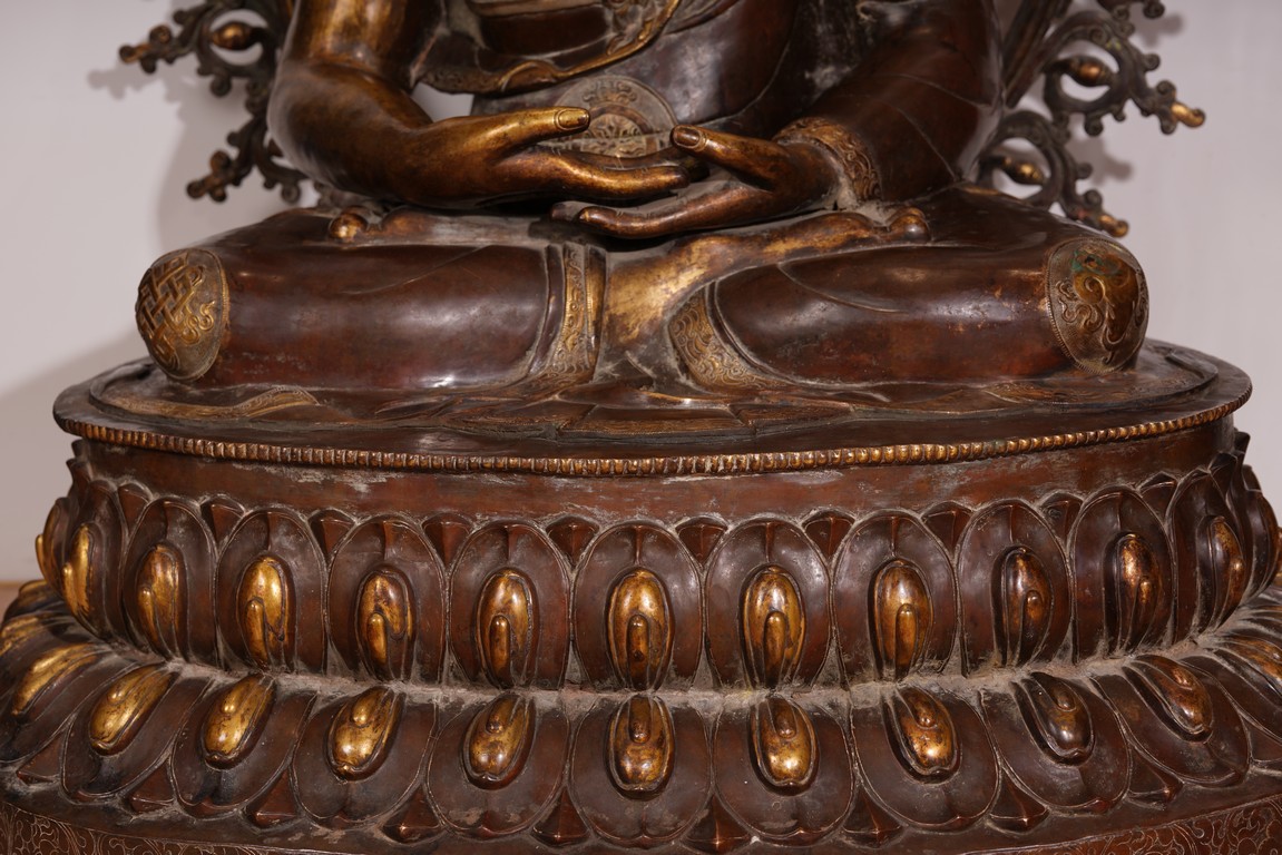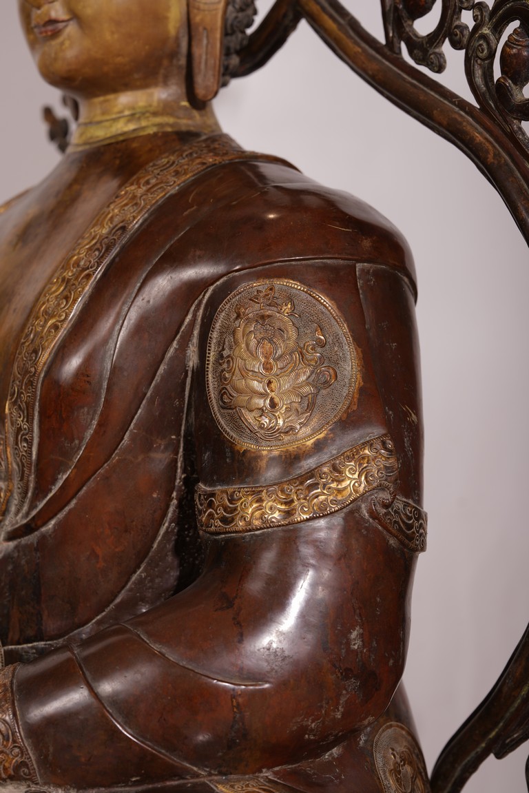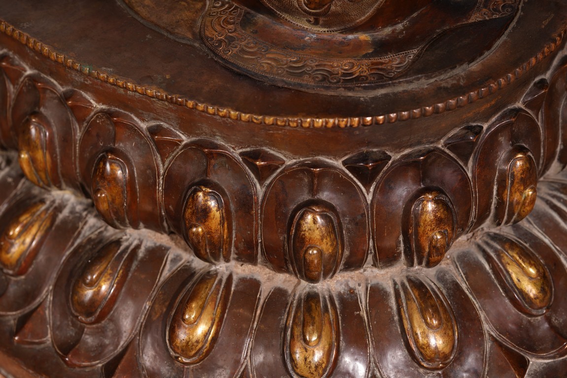 Qing Dynasty period. Heavily cast seated in dhyanasana on a double lotus throne with his hands in dhyana mudra, wearing a sanghati with incised hems and medallions decorations, the face with downcast eyes and gentle smile, flanked by a pair of long pendulous earlobes, backed by a flame-shape mandorla.