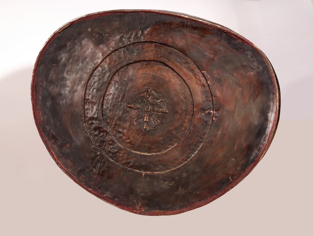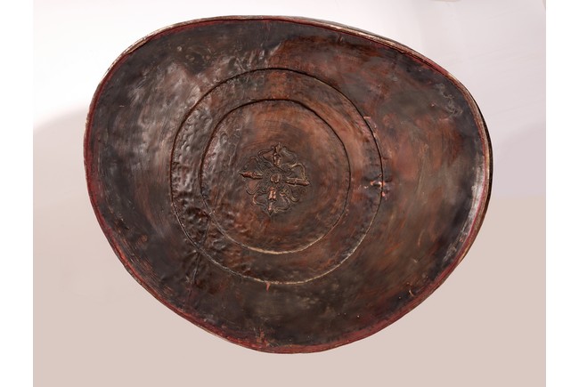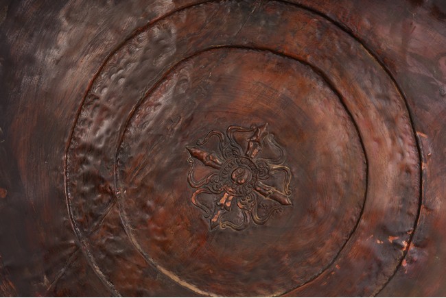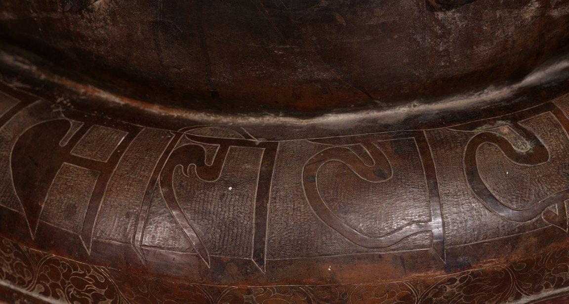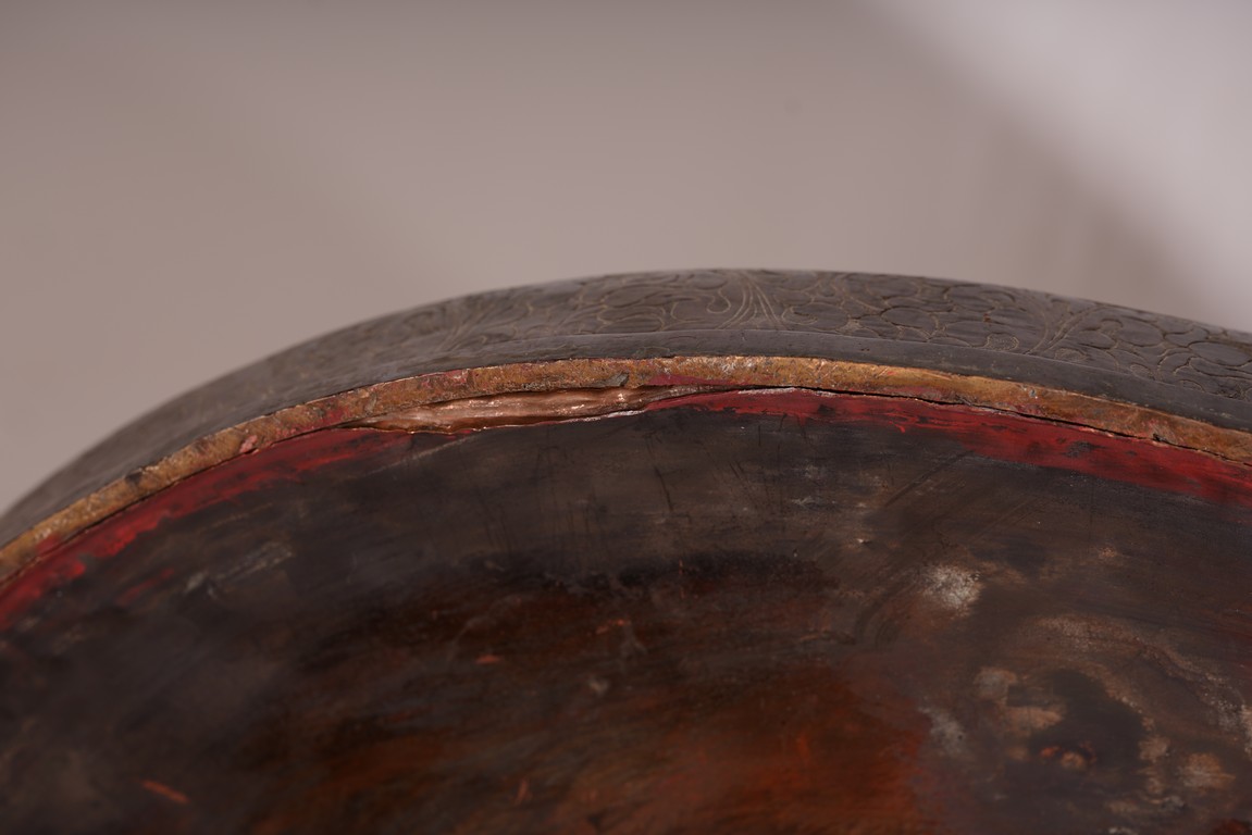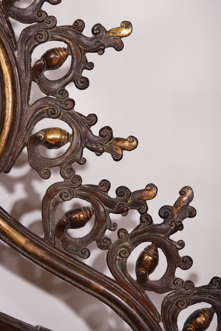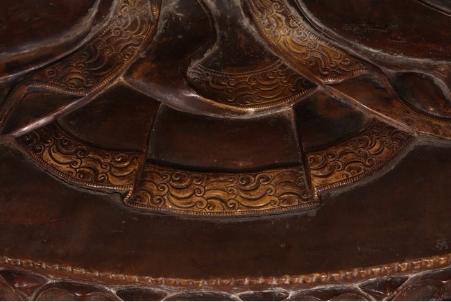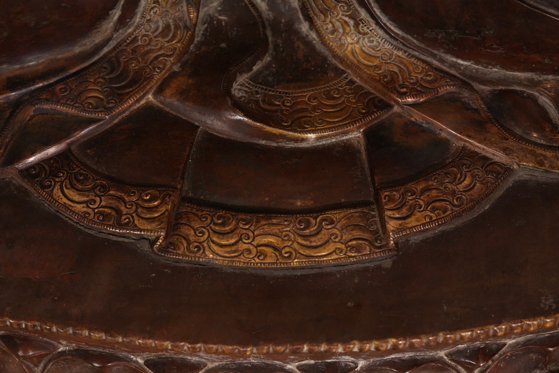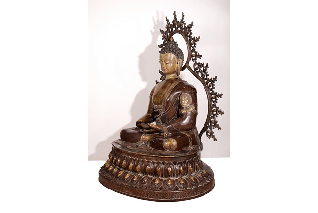 Qing Dynasty period. Heavily cast seated in dhyanasana on a double lotus throne with his hands in dhyana mudra, wearing a sanghati with incised hems and medallions decorations, the face with downcast eyes and gentle smile, flanked by a pair of long pendulous earlobes, backed by a flame-shape mandorla.