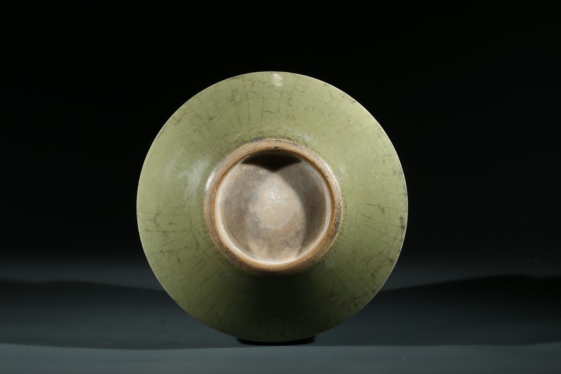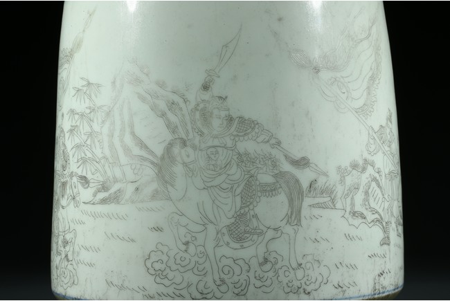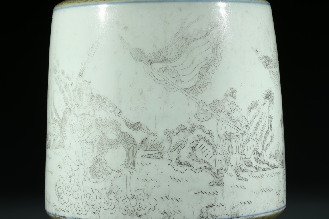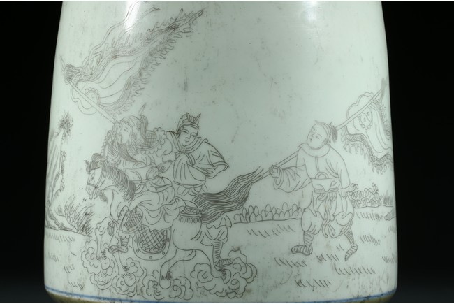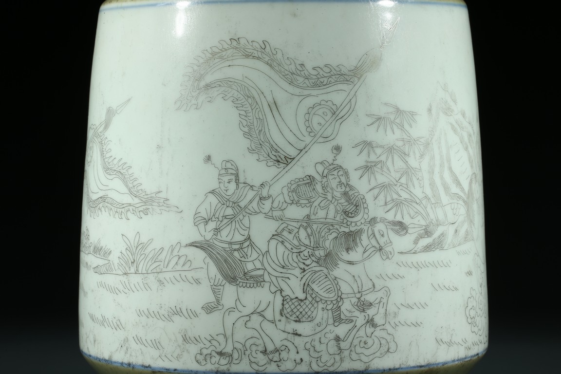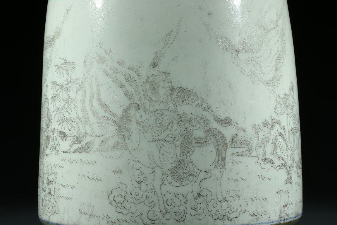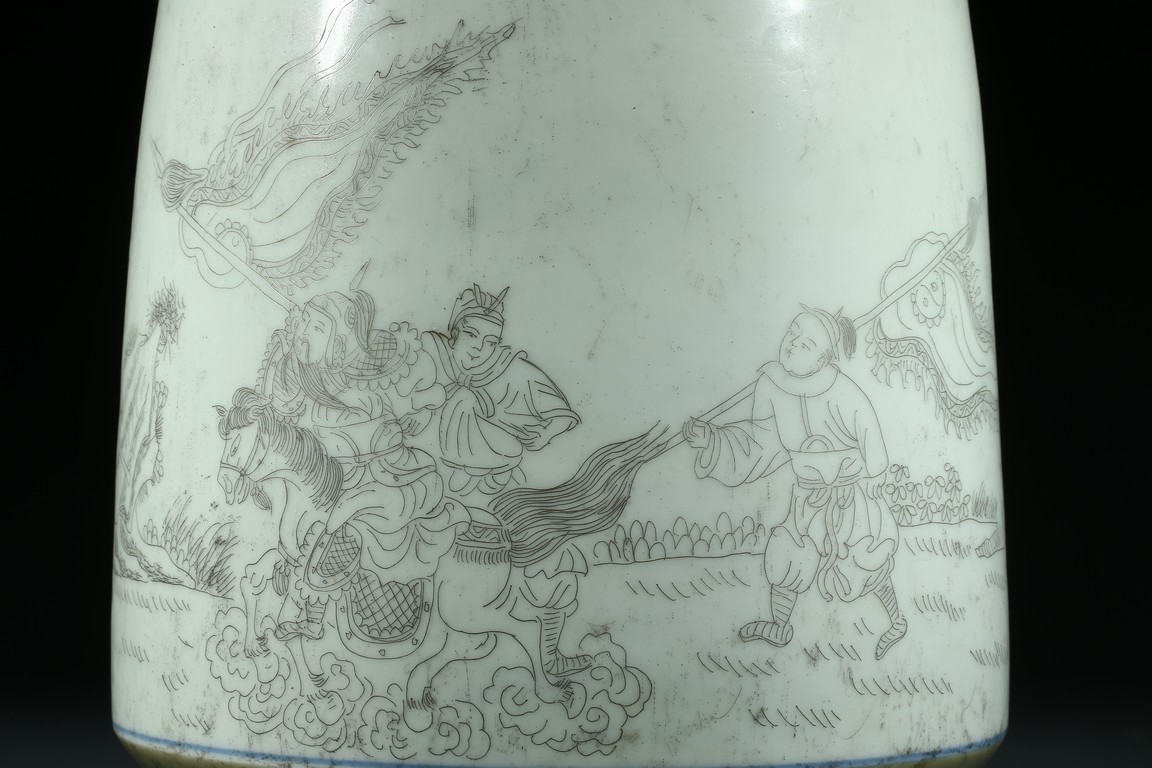 A CHINESE CELADON GLAZE 'WARRIORS' VASE 清 青釉墨彩刀馬人物瓶