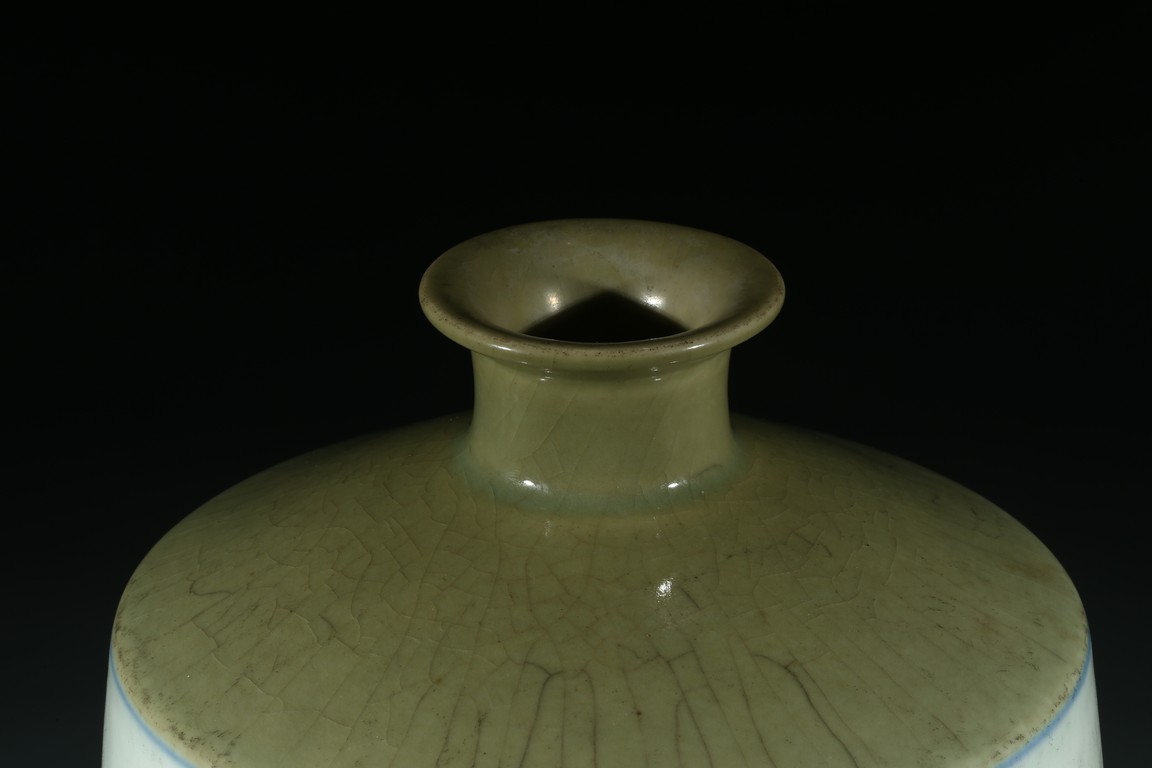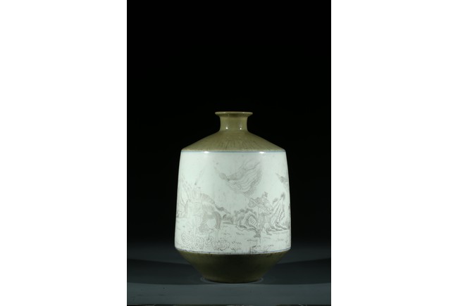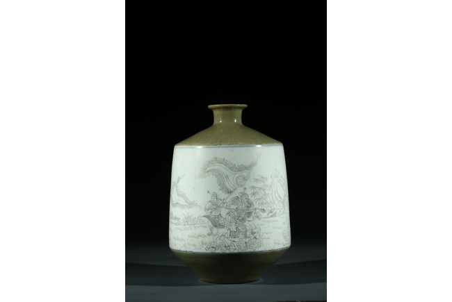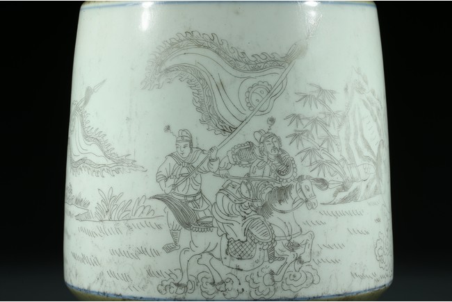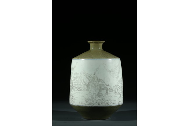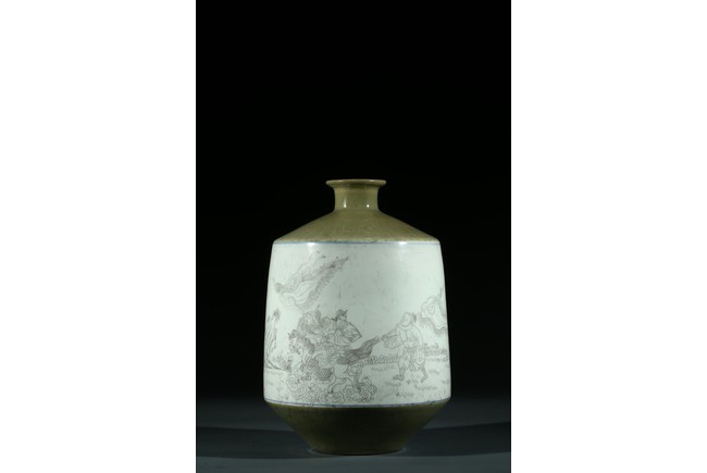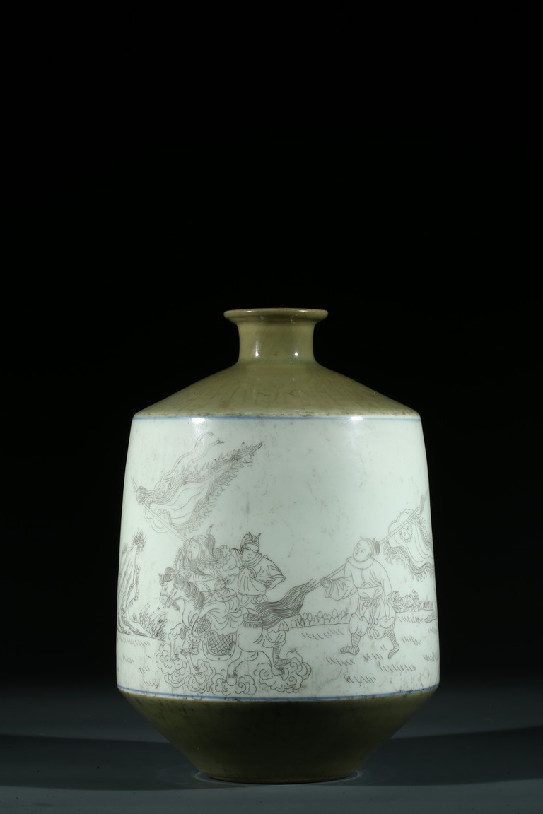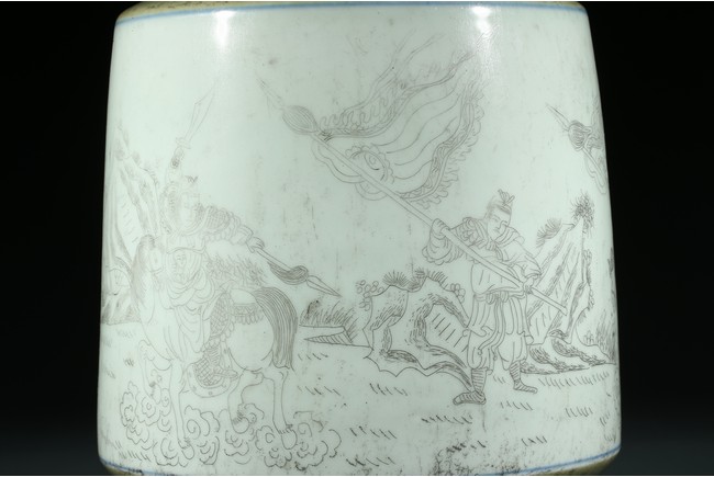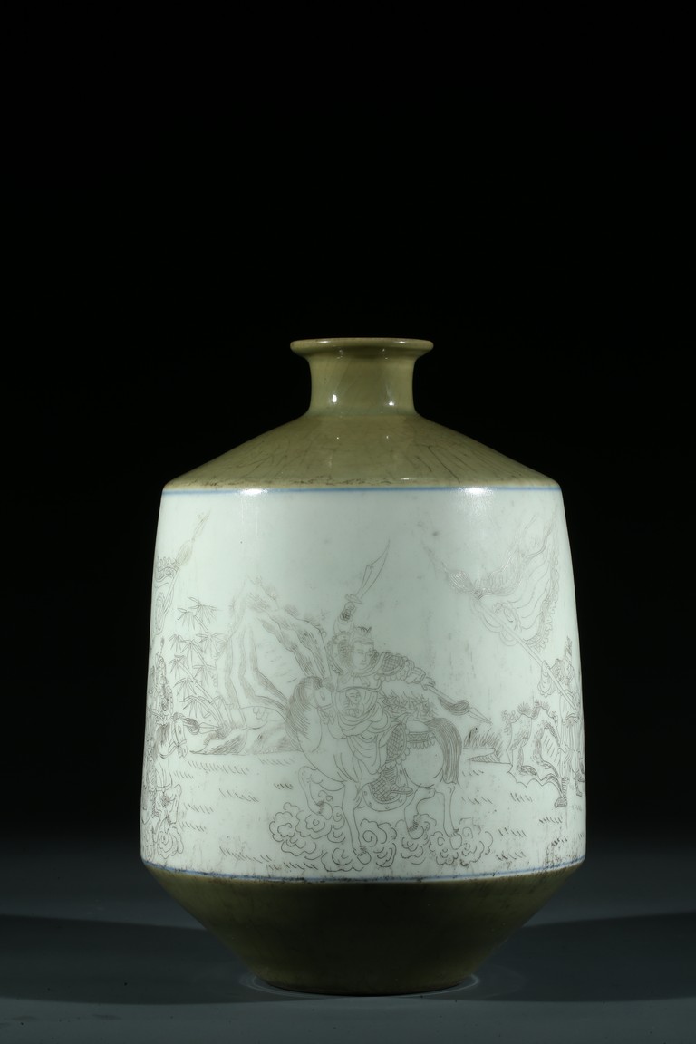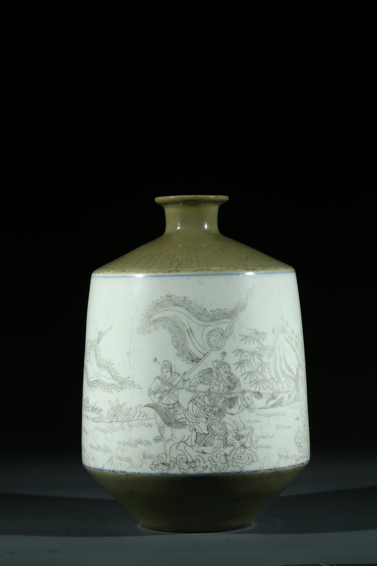 The body decorated with warriors scene flanked by celadon glaze mouth, shoulder, and base.