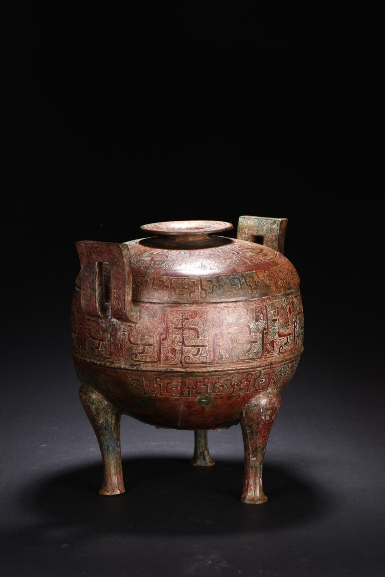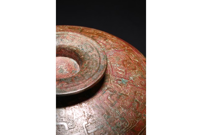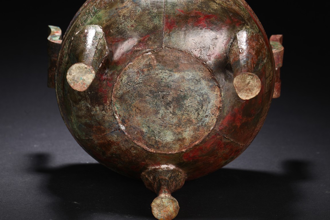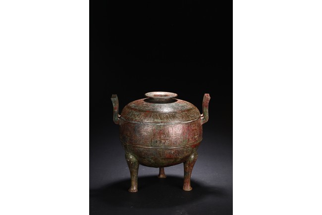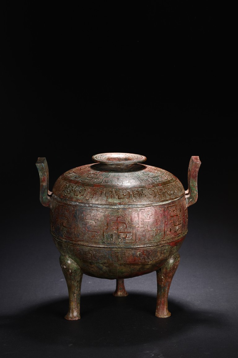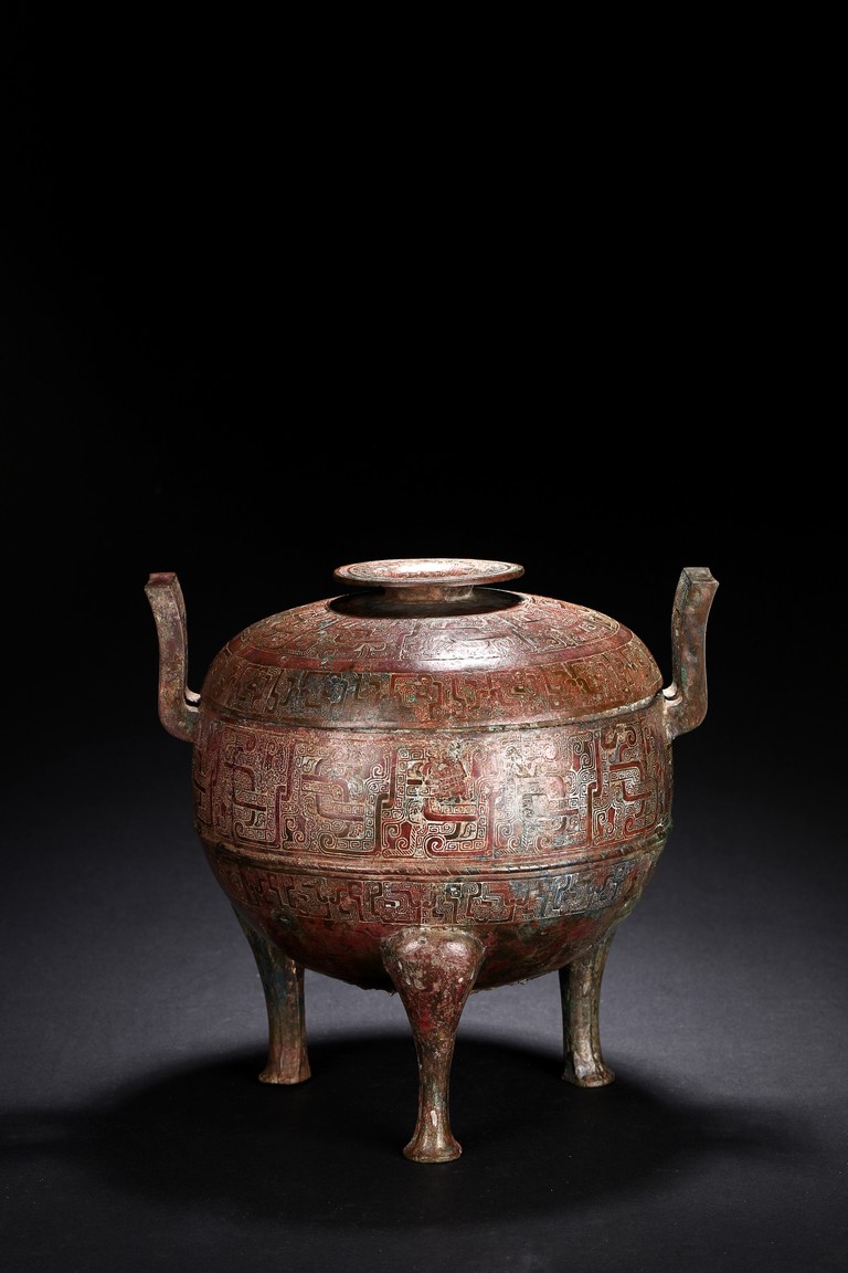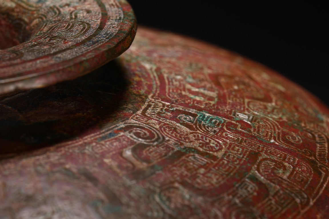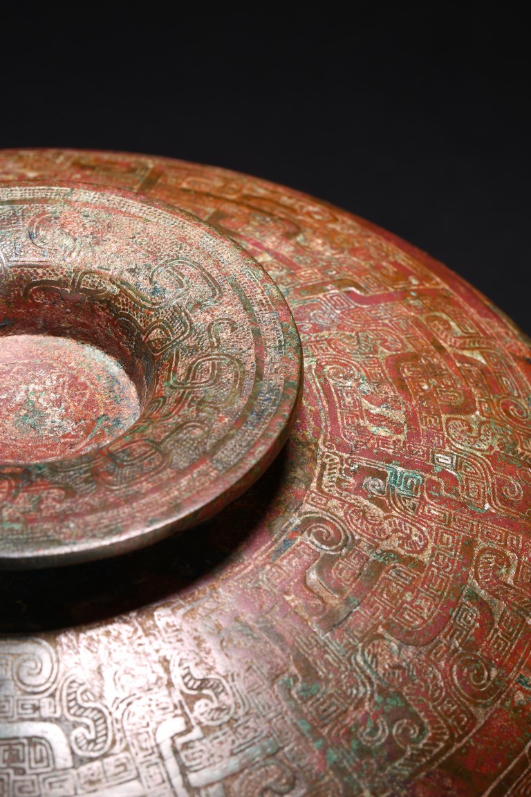 770–256 BC. Eastern Zhou Dynasty period. The globular vessel is crisply cast to the exterior with two dense bands of stylised interlocking stylized dragon scrolls filled with leiwen pattern, separated by two narrow raised bands, the body flanked by two upright handles. Two further bands of similar pattern form concentric rings on the cover, encircling the round finial decorated with intertwined pattern. The bronze has a overall reddish patina with minor malachite encrustation.