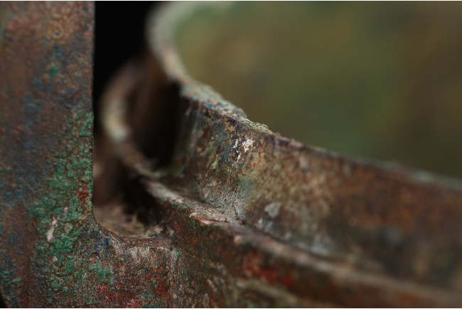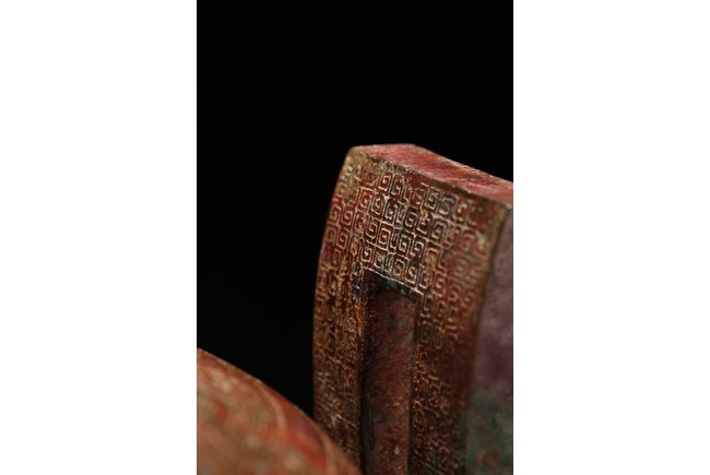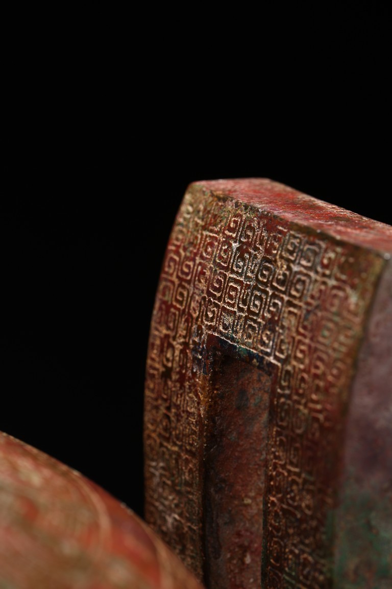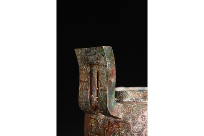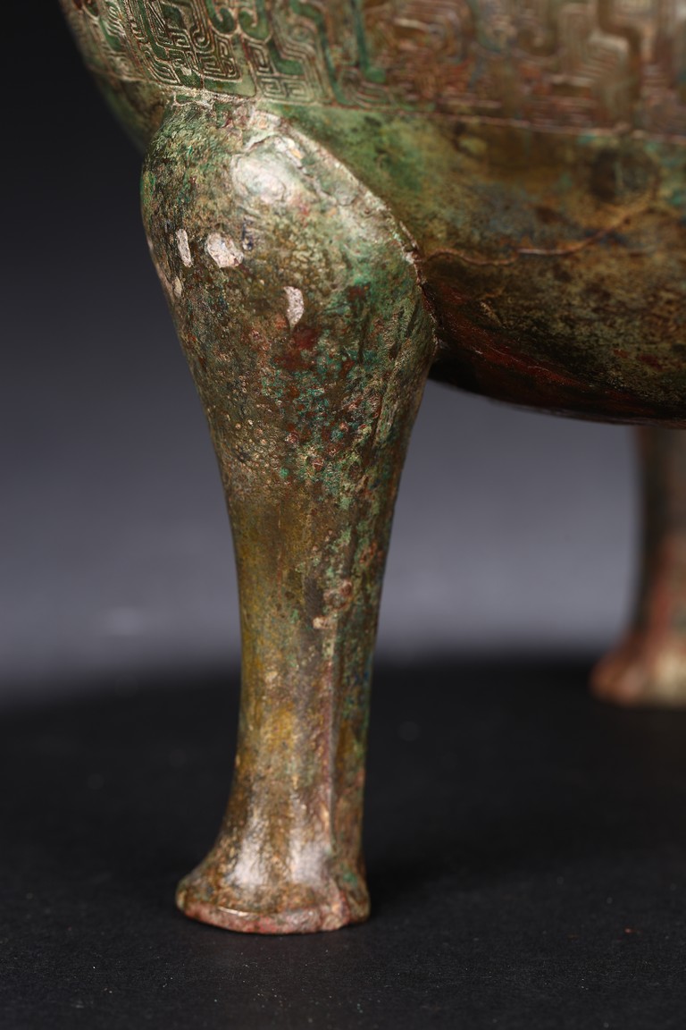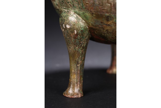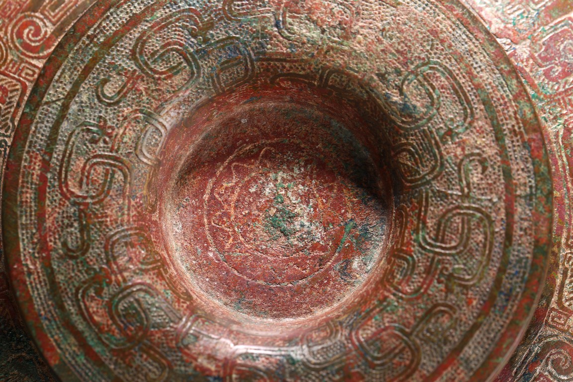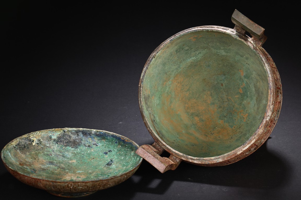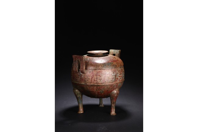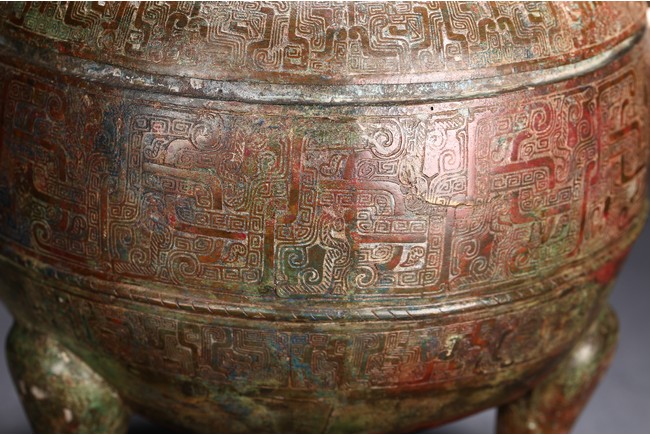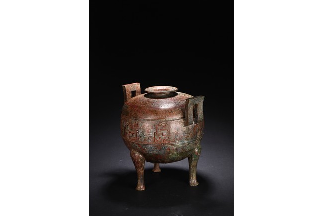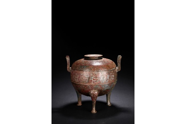 770–256 BC. Eastern Zhou Dynasty period. The globular vessel is crisply cast to the exterior with two dense bands of stylised interlocking stylized dragon scrolls filled with leiwen pattern, separated by two narrow raised bands, the body flanked by two upright handles. Two further bands of similar pattern form concentric rings on the cover, encircling the round finial decorated with intertwined pattern. The bronze has a overall reddish patina with minor malachite encrustation.