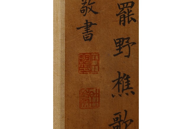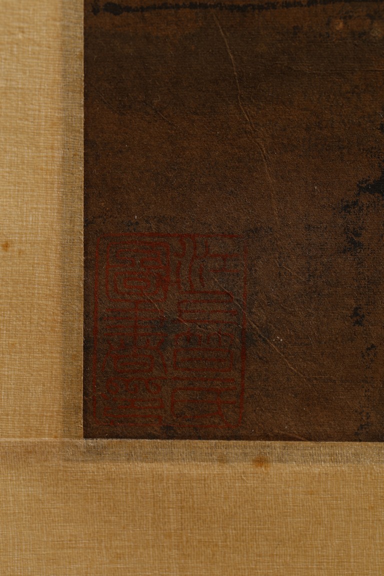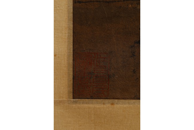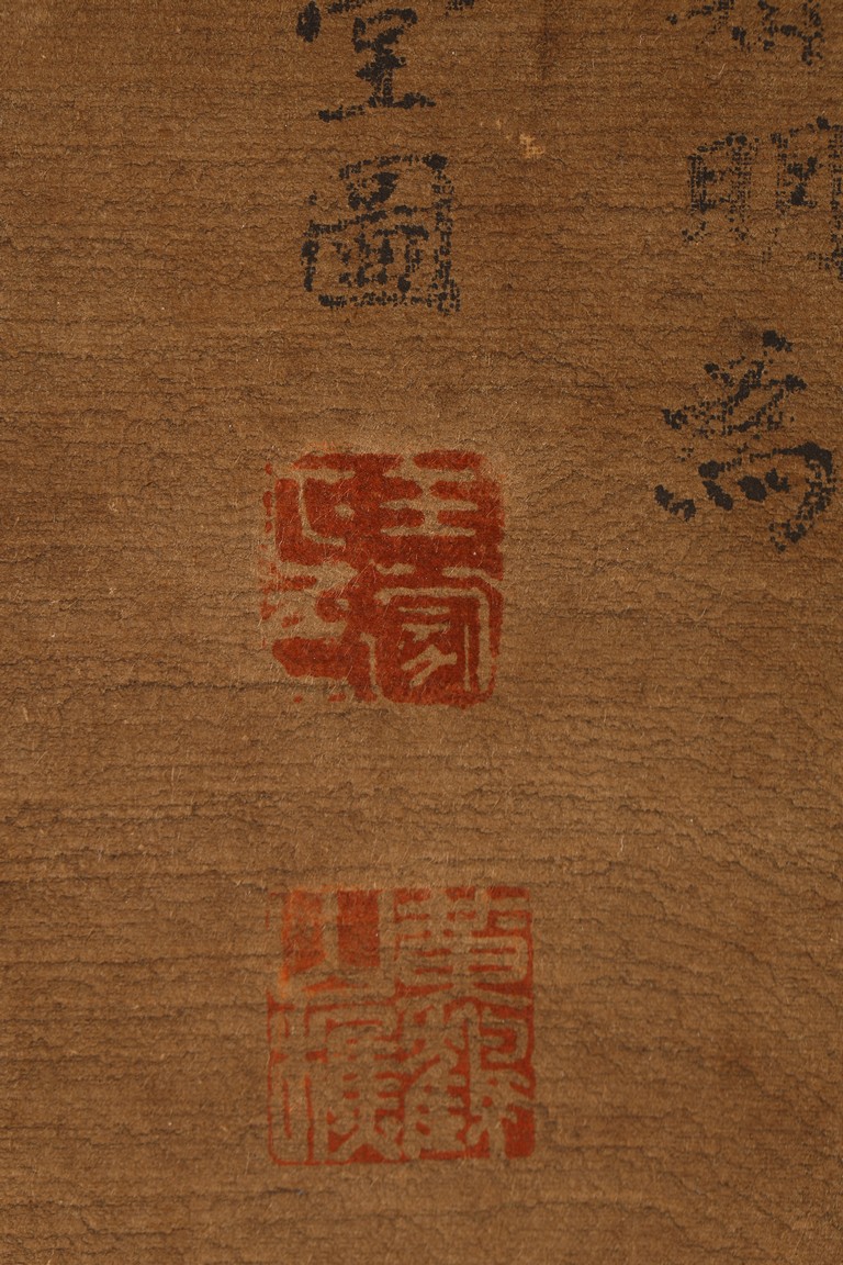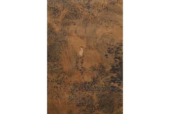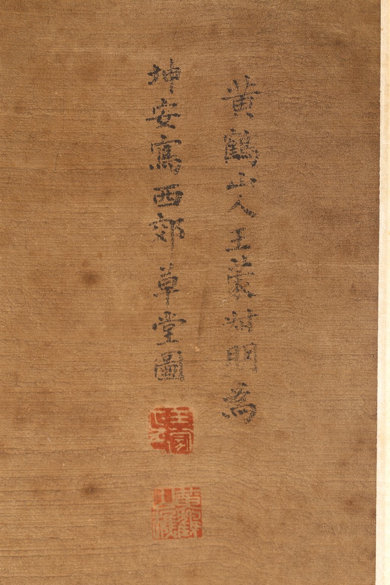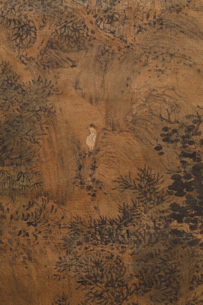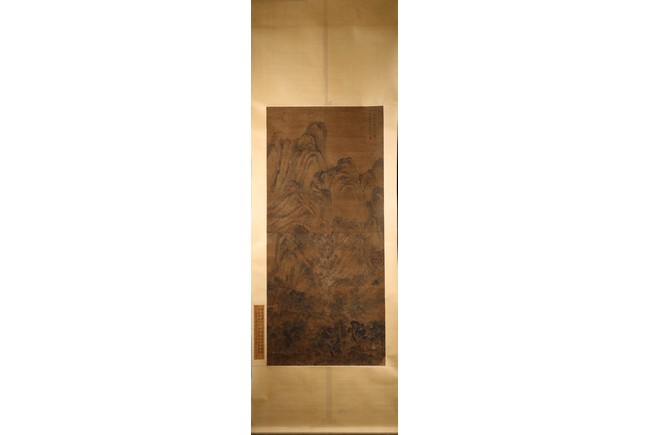 Color and ink on paper. Landscape. Hanging scroll. Inscribed and signed Wang Meng, with three seal marks. With colophon inscribed and signed Ji Jun, with two seal marks. Attributed to Wang Meng.