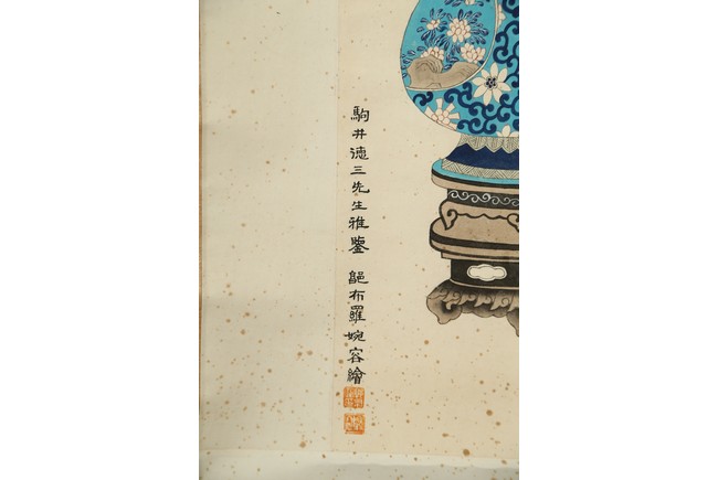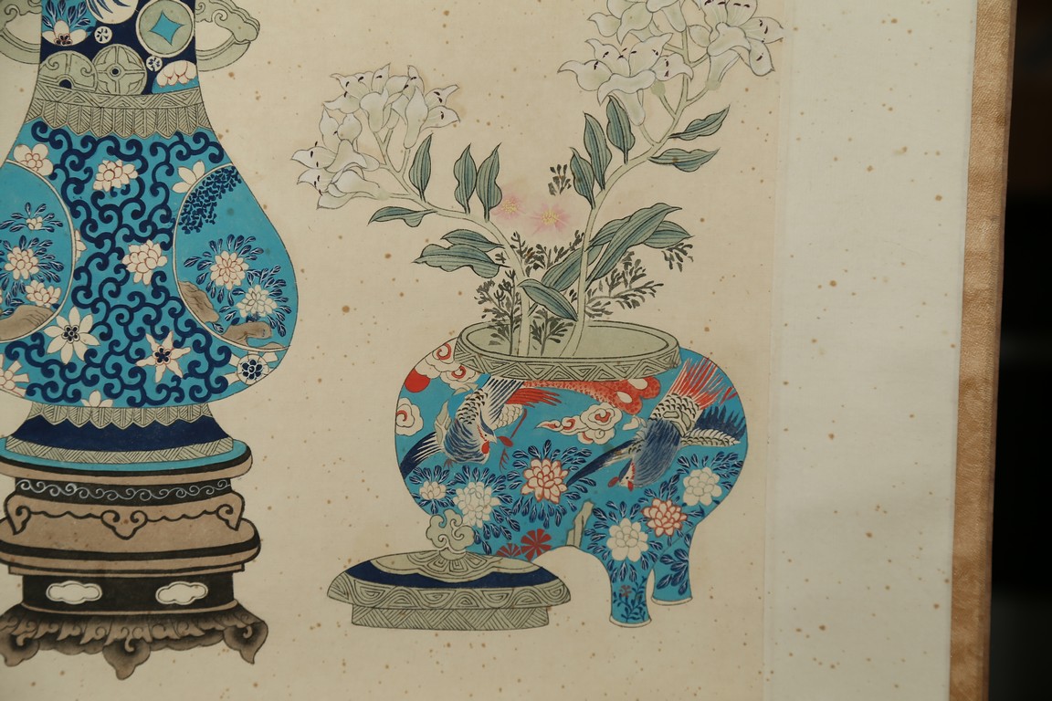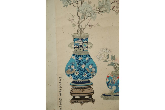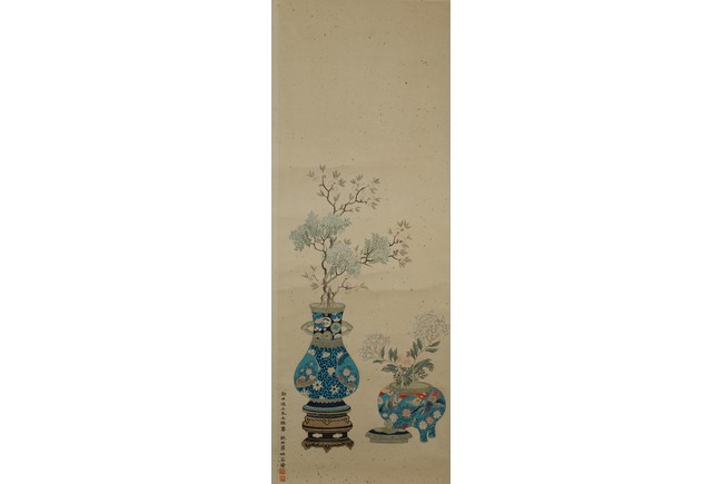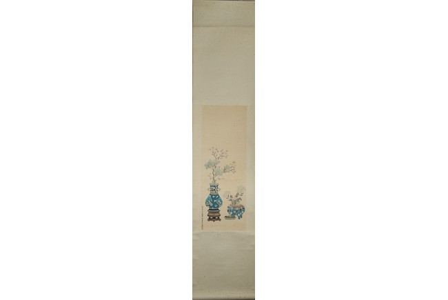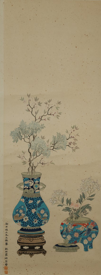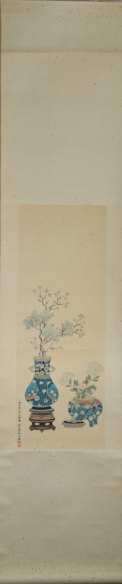 Ink and color on paper painting. Bogu Vases. Hanging scroll. Signed Wan Rong and with two seals of the artist.