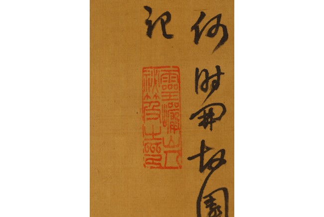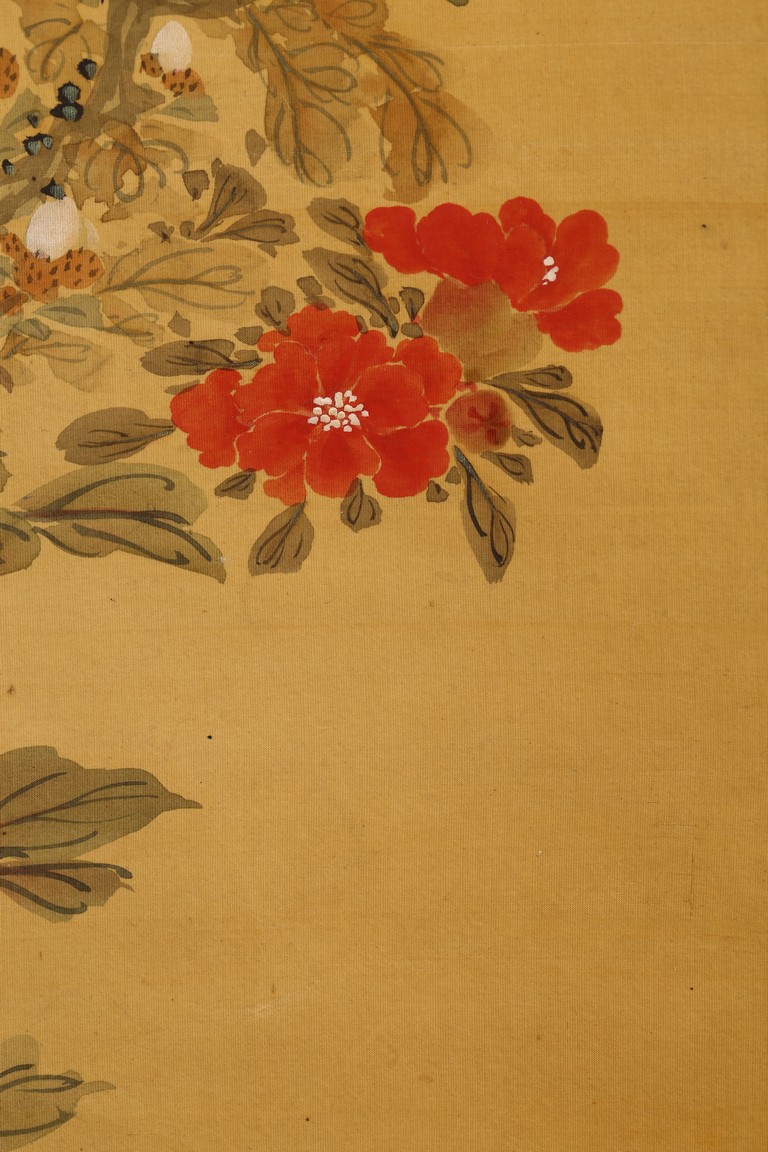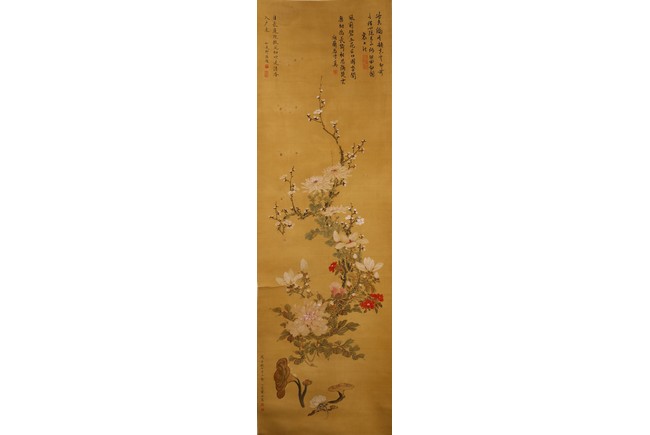 Chinese School. Color and ink on silk. Lingzhi fungus and various flowers. Hanging scroll. Inscribed and signed Xiao Yuan Dong Bai, and colophons of various artists.