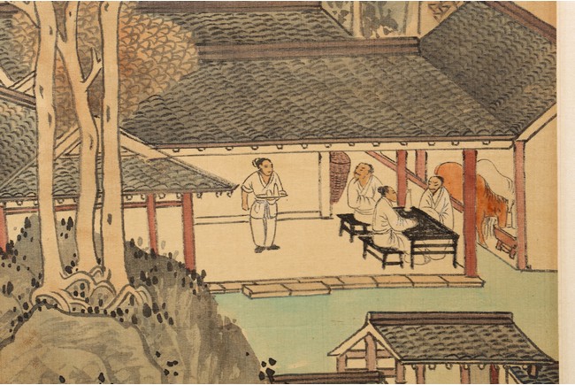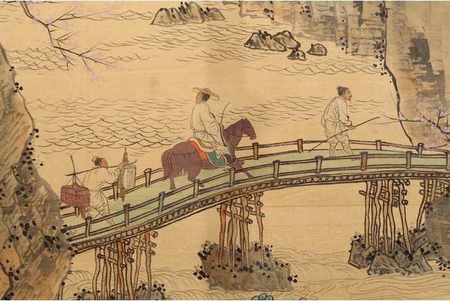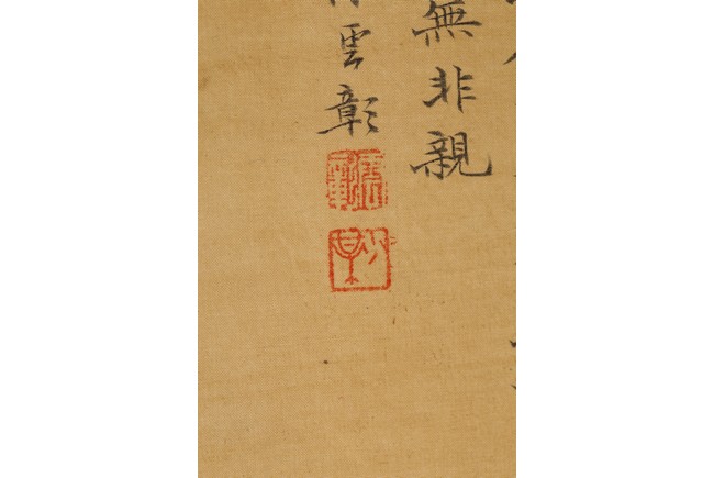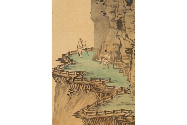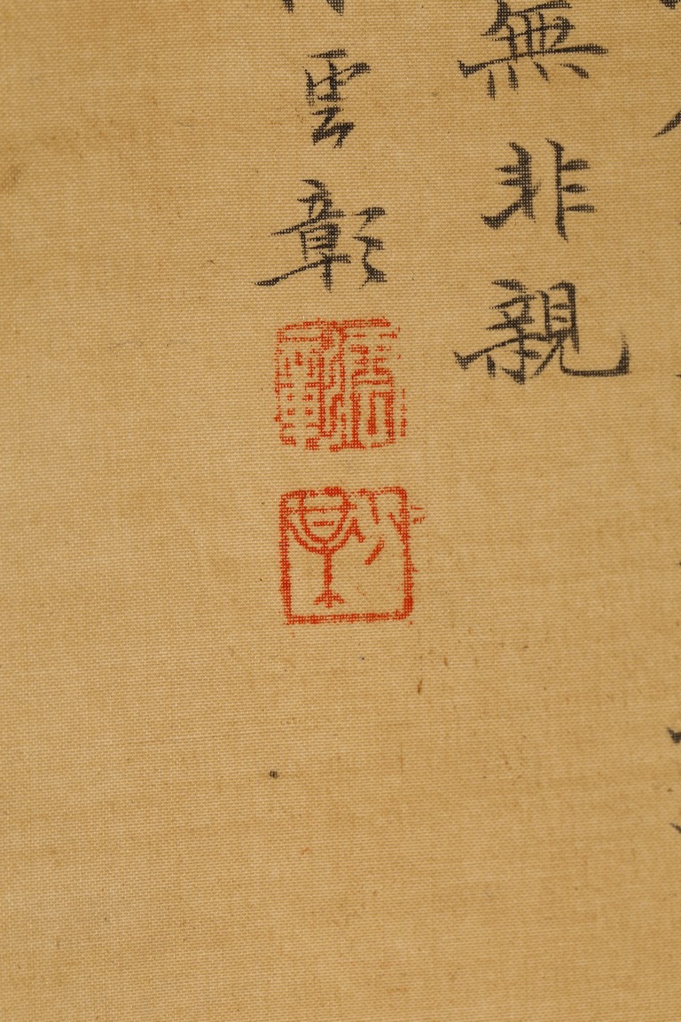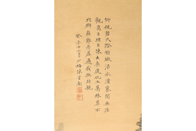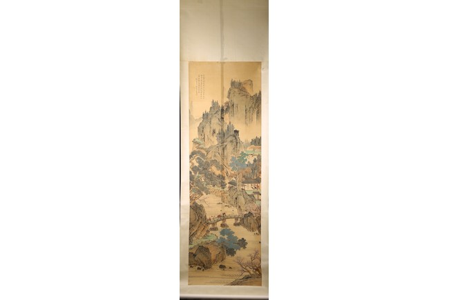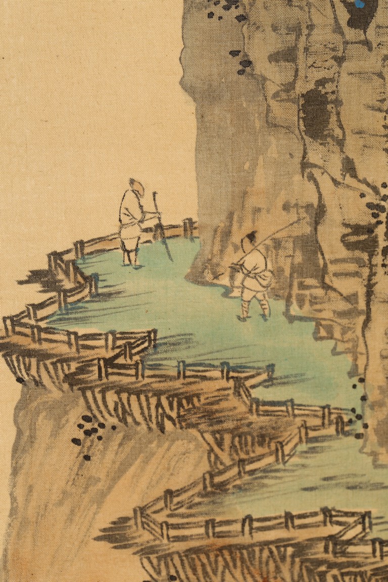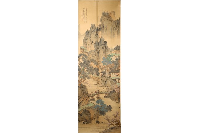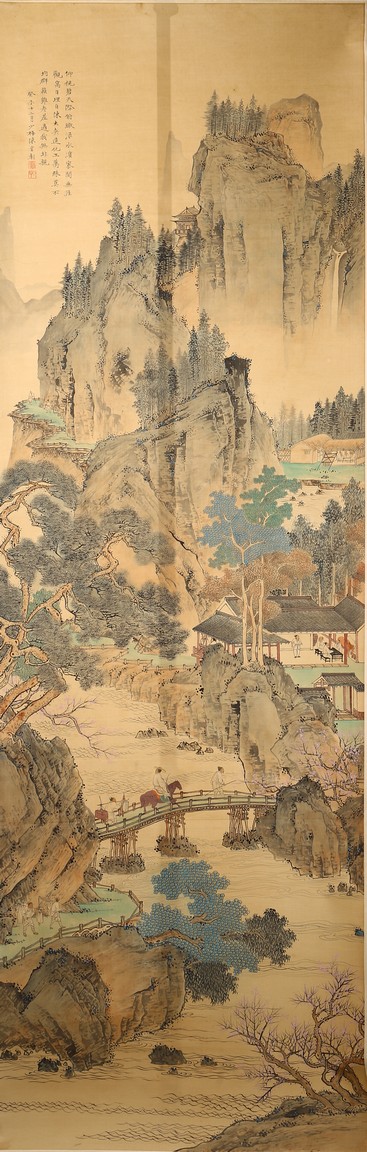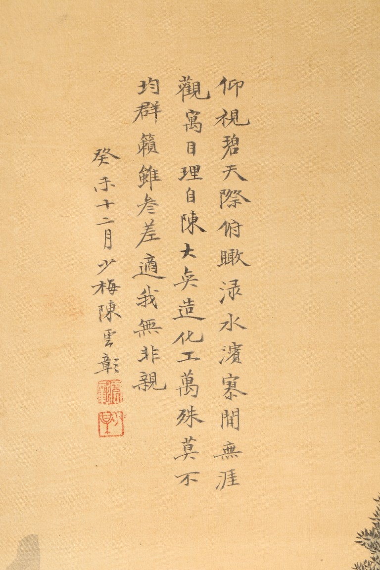 Color and ink on silk. Landscape. Hanging scroll. Inscribed and signed Shao Mei Chen Yun Zhang, with two seal marks.