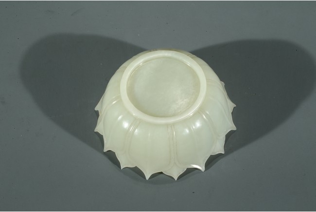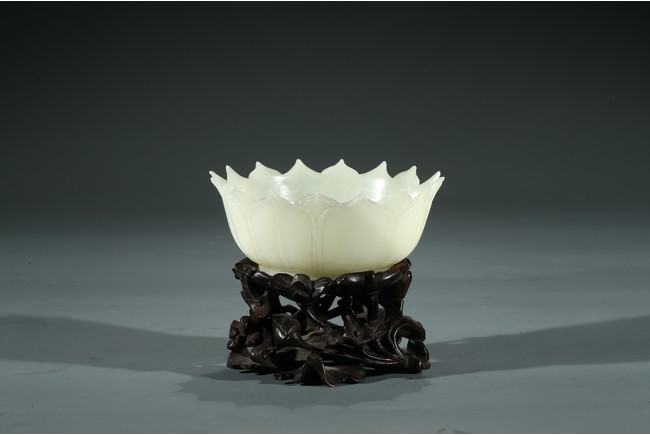 Finely worked in the form of a lotus blossom, the everted sides formed from a row of pointy petals, the smoothly polished stone of a white tone, all supported on carved hardwood stand.