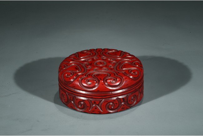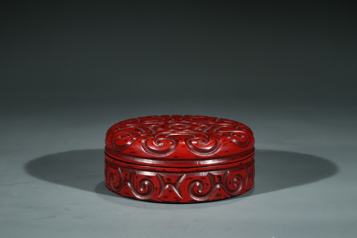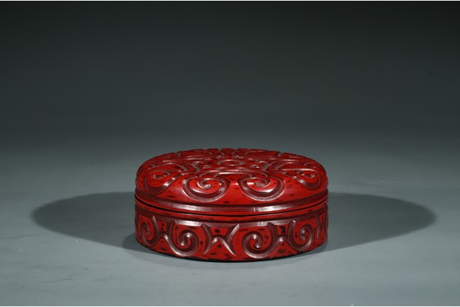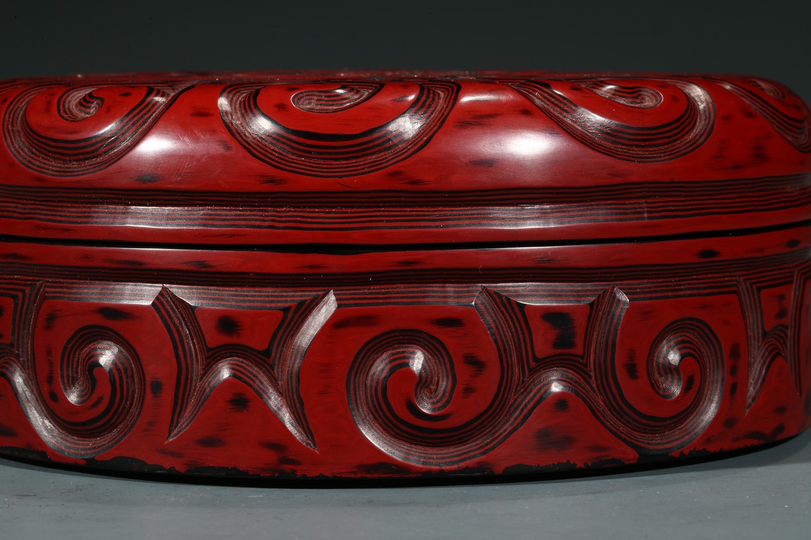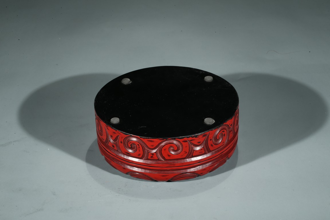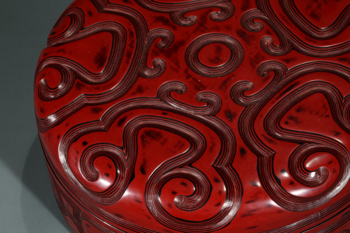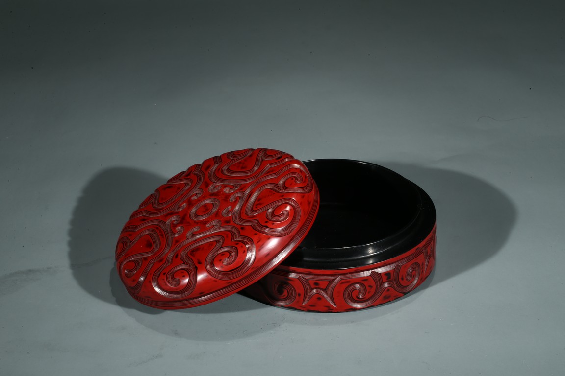 香盒圓形,整髹朱漆並間以黑漆。通體雕刻如意雲頭紋,所雕紋飾構圖飽滿,髹漆肥厚,漆色紅潤,瑩亮溫潤。刀口斷層處朱漆層次分明,線條流暢委婉。