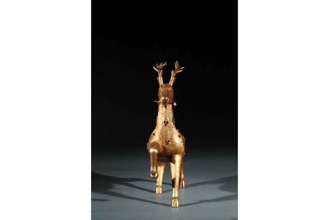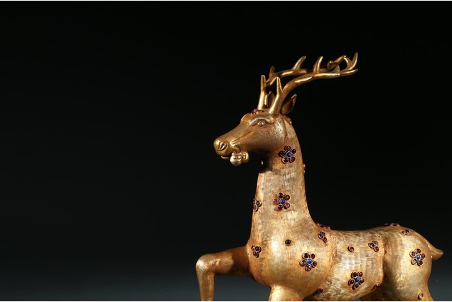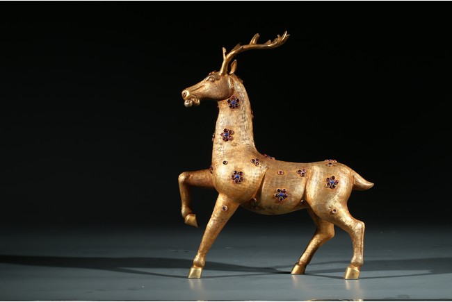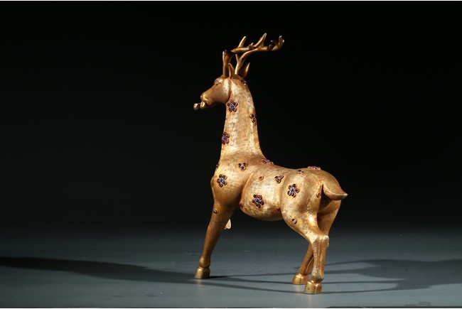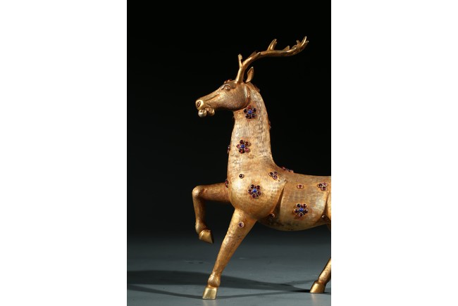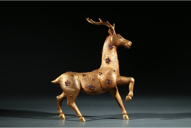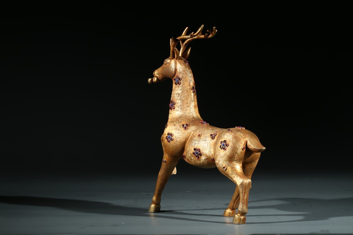 Realistically modelled as a sika deer standing with one foot raised, the body inlaid with gems, the head detailed with expressive branched antlers, the mouth grasping a lingzhi mushroom.