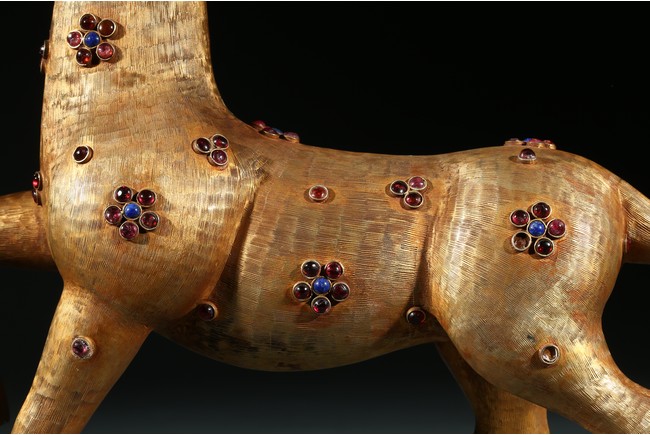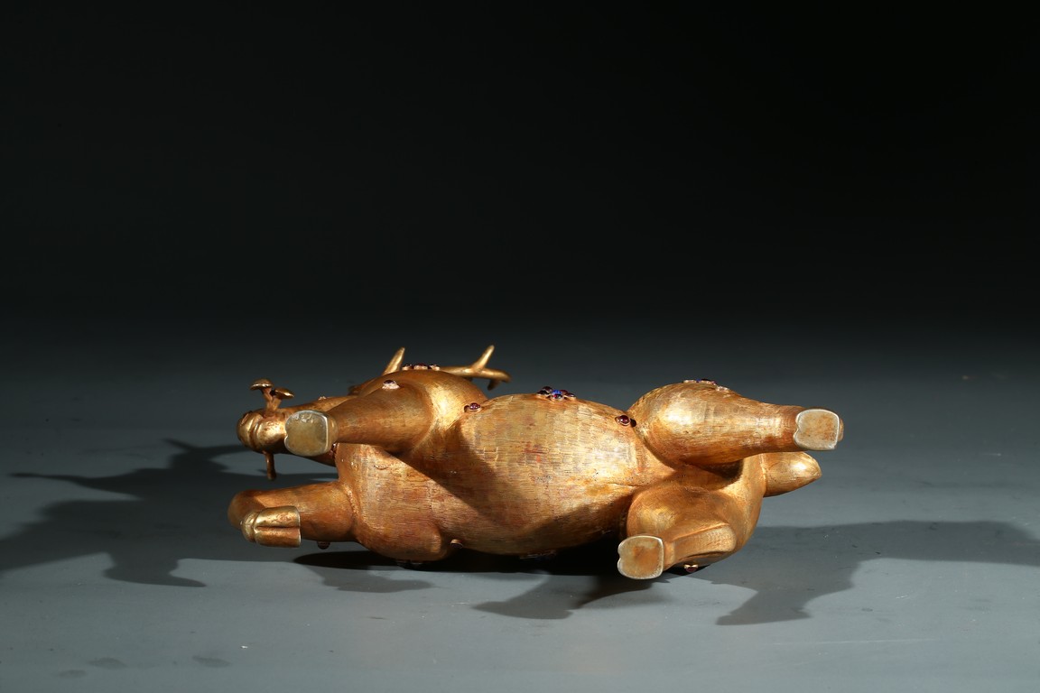鹿諧音“祿”,在中國傳統文化中一直有著吉祥的含義,象徵力量與好運,可保平安、如意。此件作品銅鎏金捶碟工藝,造型寫實,生動形象,案頭陳設佳品。
