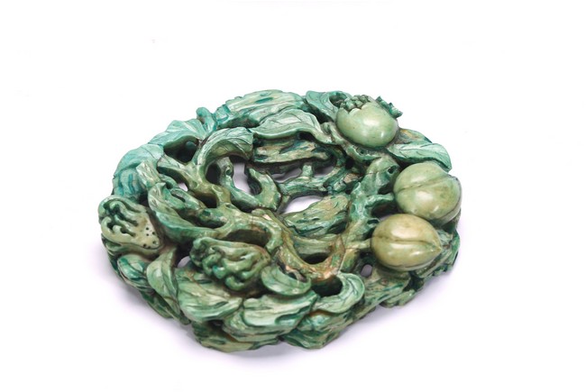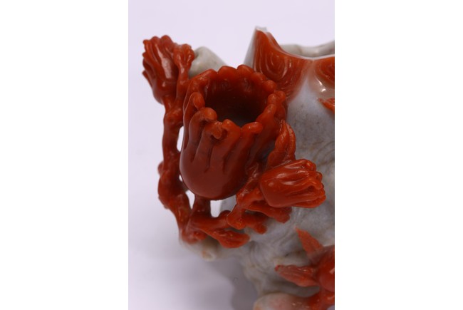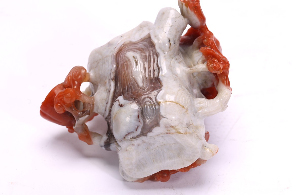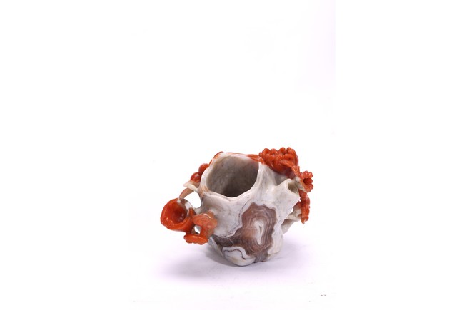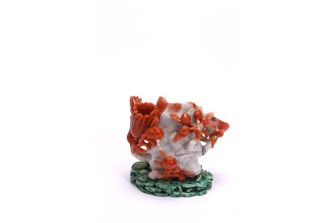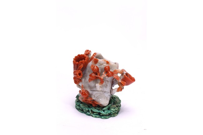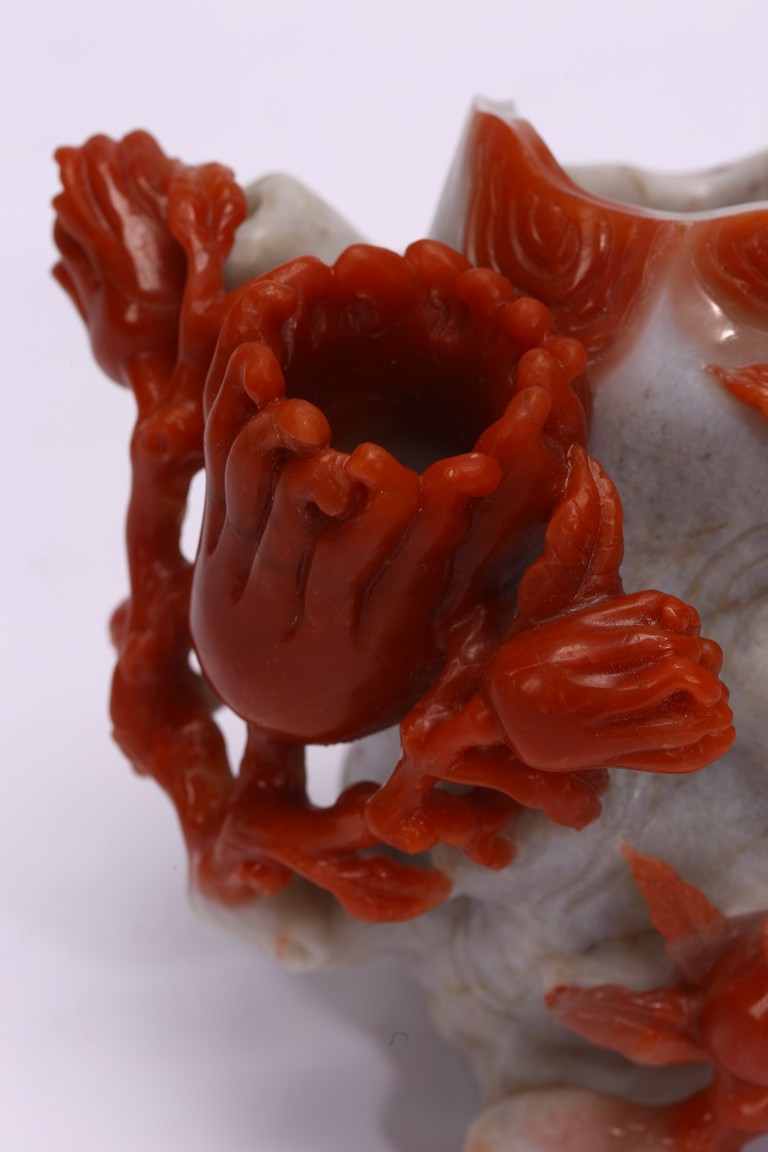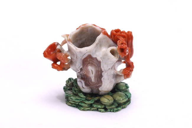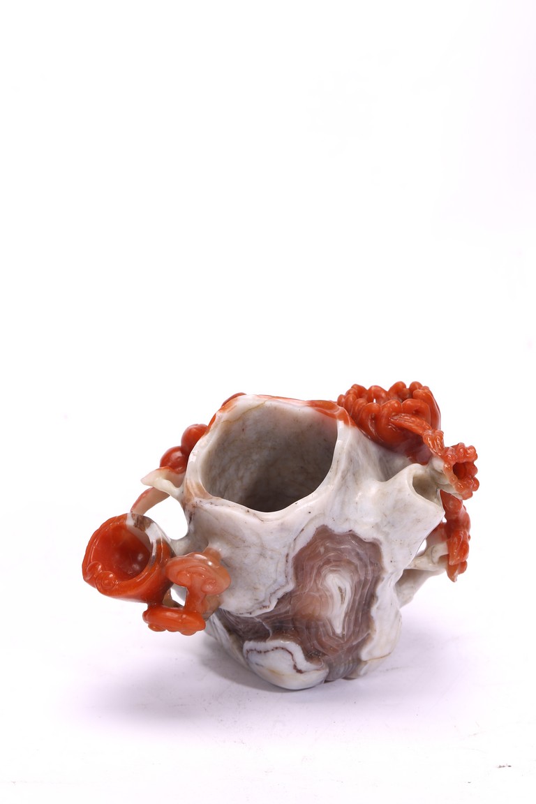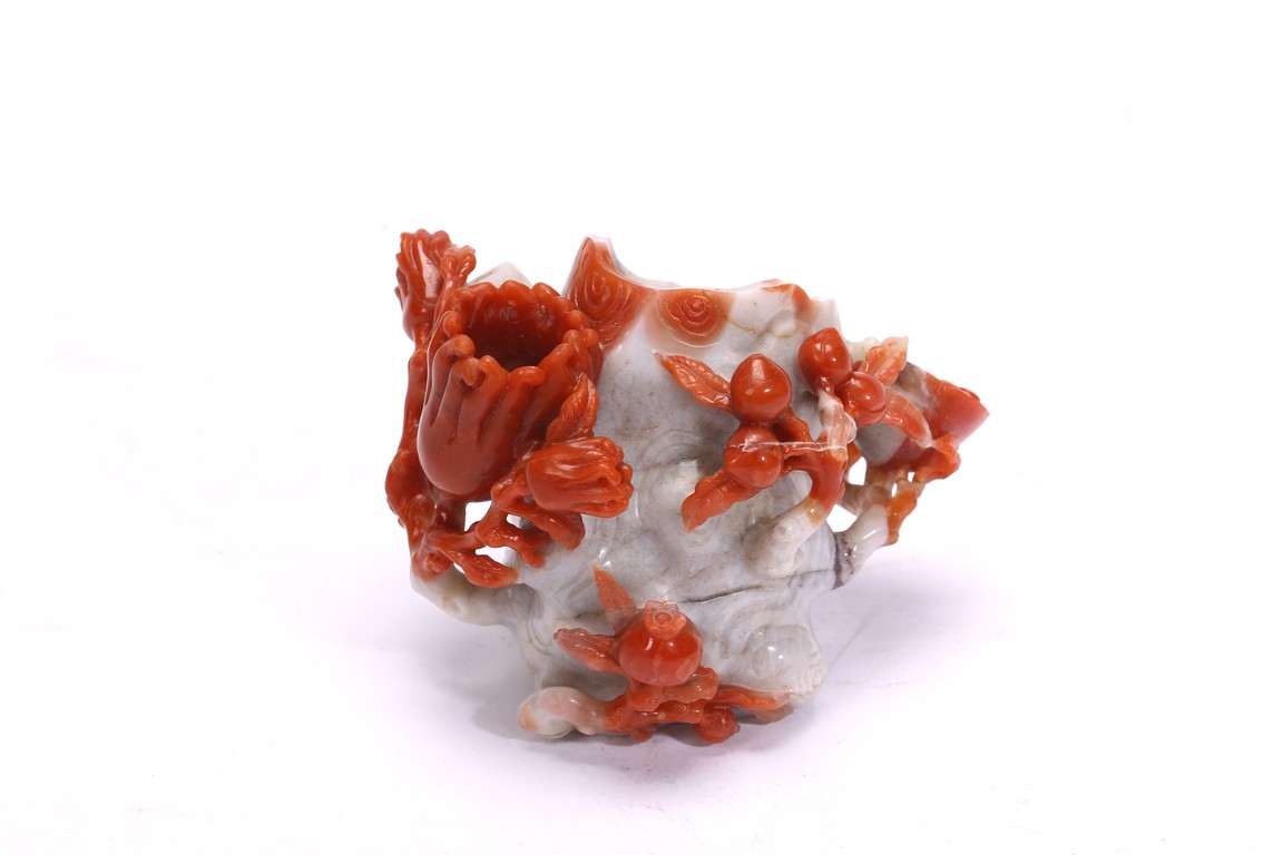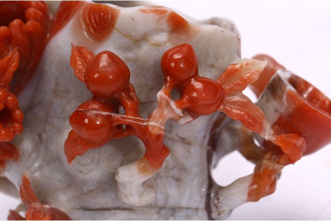 Provenance: Property from a San Diego, California private collection 來源: 加州聖地亞哥私人藏家收藏 。南紅瑪瑙,古稱”赤玉”,產量稀少,在乾隆年間就已開採殆盡。南紅瑪瑙産於中國西藏、內蒙古等地,顏色柔和勻淨、紅白相間,帶有明顯的色彩圈紋,質地細膩光滑。正視有瑩白光彩,側視則若冰雪凝結,也有的紅白分明,甚至有全紅色、水紅色者。古人用之入藥,養心養血,信仰佛教者認為他有特殊功效。佛教七寶中的赤珠(真珠)指的就是南紅瑪瑙。今天南紅瑪瑙,已經和和闐玉、翡翠形成三足鼎立之勢。南紅瑪瑙以小材居多,大塊者亦很罕見,故極為珍貴。此件筆洗擇整塊瑪瑙雕成,質地純淨透亮,光滑細膩,器身白若殘雪,紅若寒梅,極具驚艷之美。整器主體部擇白色處雕大靈芝做樹幹,巧借紅色處雕靈芝,石榴,佛手,桃子,為福壽三多。挖膛開闊,光亮精細,雕制精湛,線條硬朗,且器型碩大,是極為難得的藝術珍品,可寶可藏。配原裝染色壽山石座。