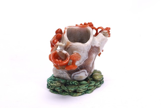 Qing Dynasty Qianlong period. The white section of the agate stone finely carved as a tree trunk forming the washer, the exterior deep red sections carved in high relief with pomegranate, peaches, fingered citrons, and lingzhi mushrooms borne from gnarled branches issuing from the trunk, all supported on finely carved and stained soapstone stand.