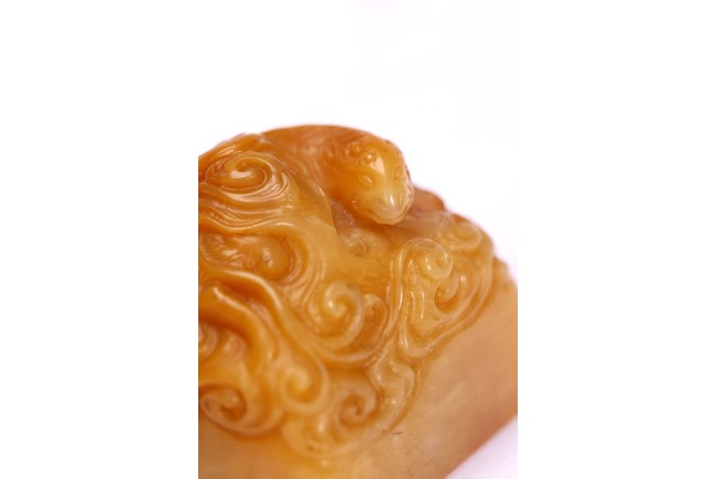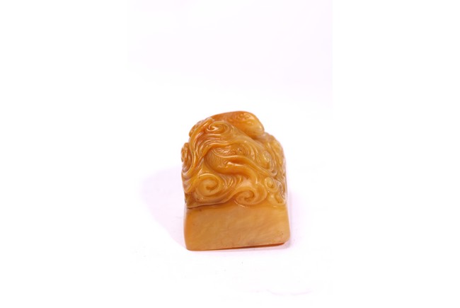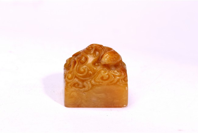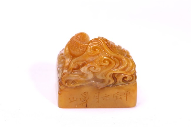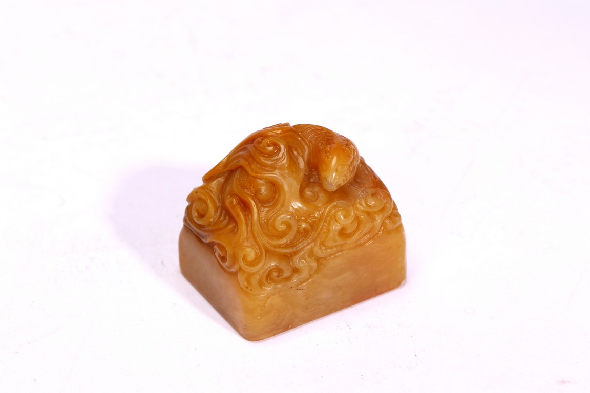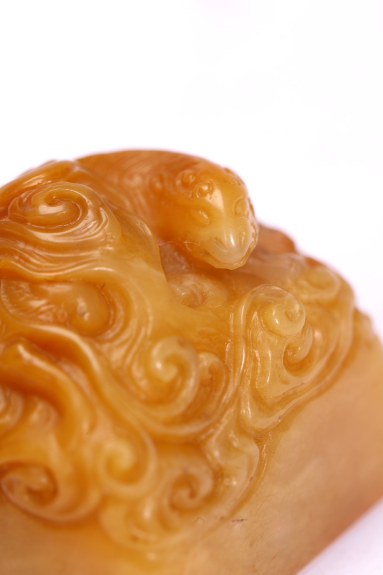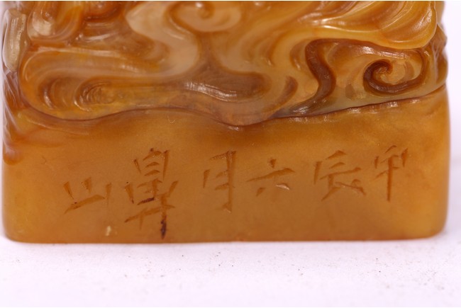 Qing Dynasty Daoguang period. Of square form, the seal carved with a mythical beast emerging from dense auspicious clouds below, the seal side inscribed with six characters signed Bi Shan, the seal face carved with four characters.