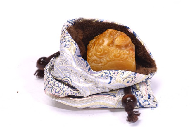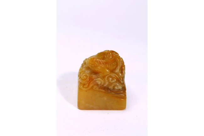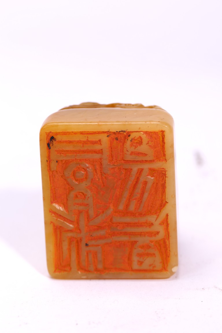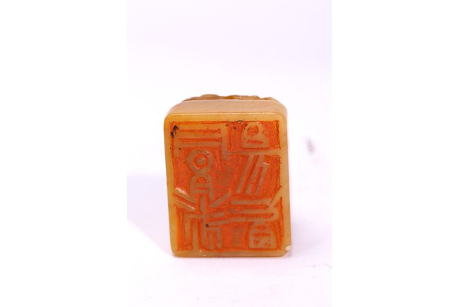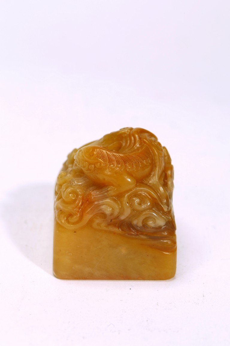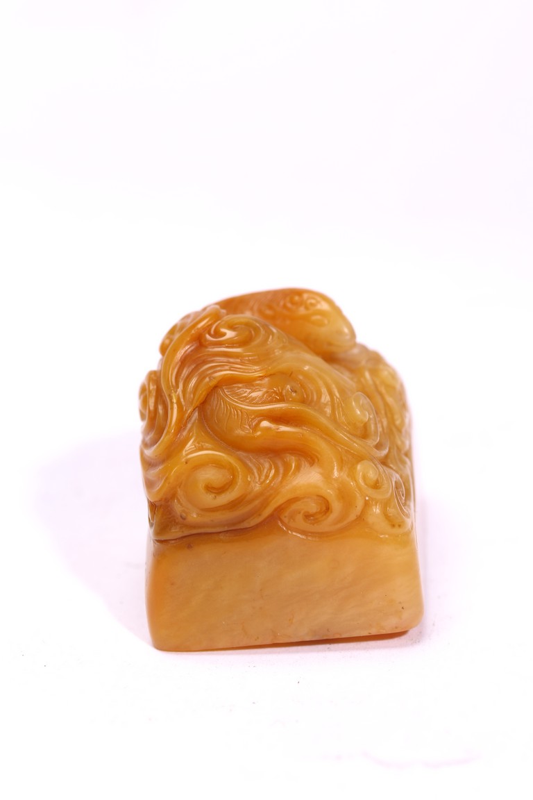 Qing Dynasty Daoguang period. Of square form, the seal carved with a mythical beast emerging from dense auspicious clouds below, the seal side inscribed with six characters signed Bi Shan, the seal face carved with four characters.