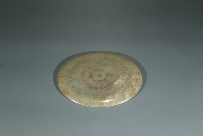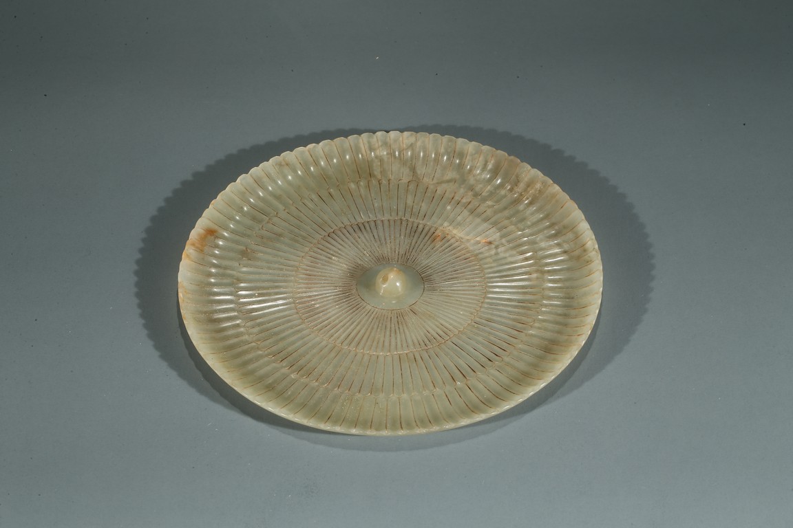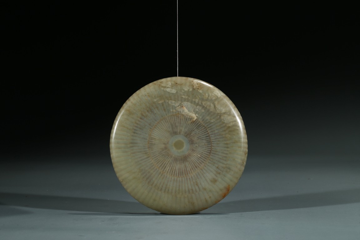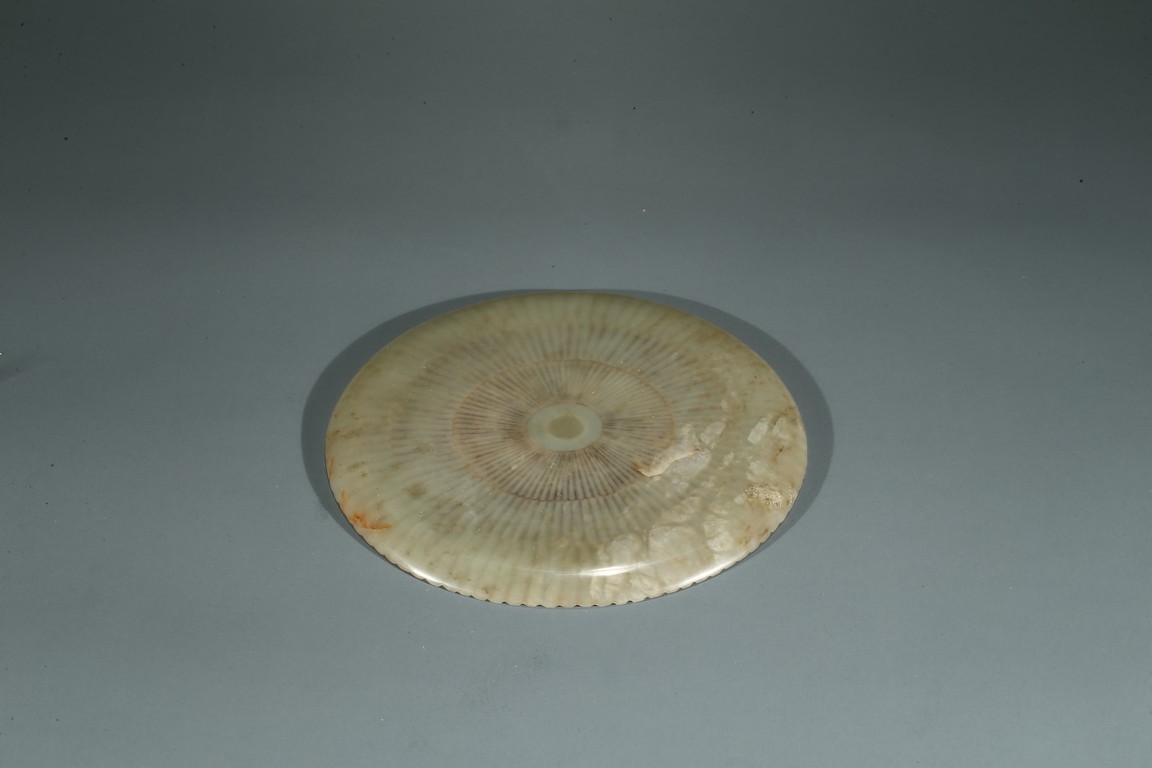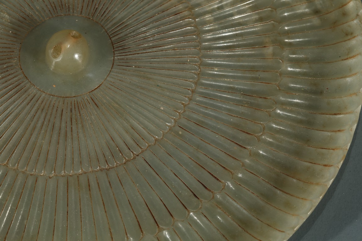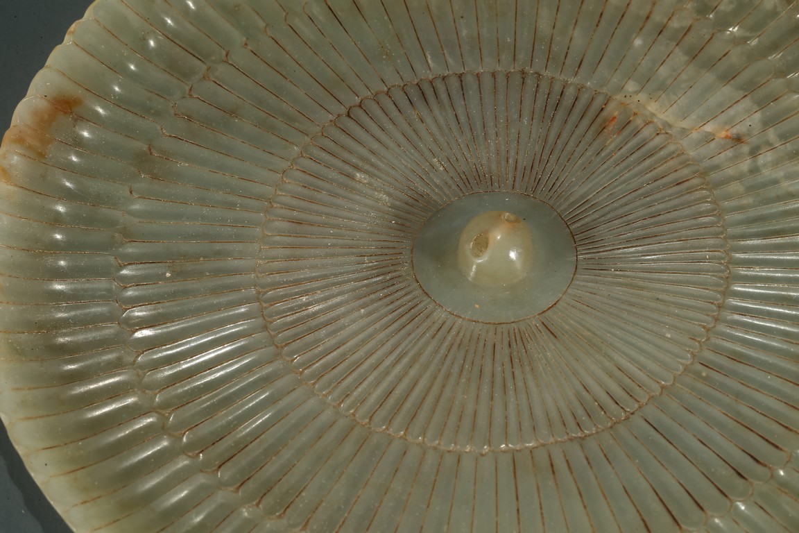 Carved in the form of radiating chrysanthemum petals within concentric rings, the stone is of celadon green tone.
