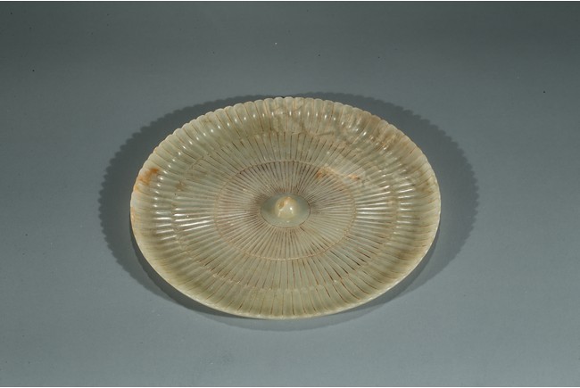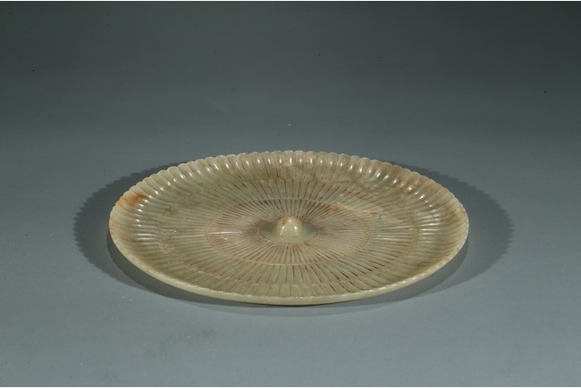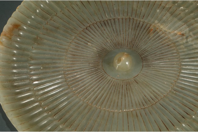 青白玉製成,玉色清潤溫和,微微透光,質地細膩通透,溫潤晶瑩。其造型雅緻高貴,形作菊瓣,呈盛開的菊花瓣狀,器型討巧,呈凝油脂光澤,返璞歸真的純淨蘊含其中。細觀此器,其胎體薄厚均勻,內壁磨製精到,拋光細膩,十分費工。