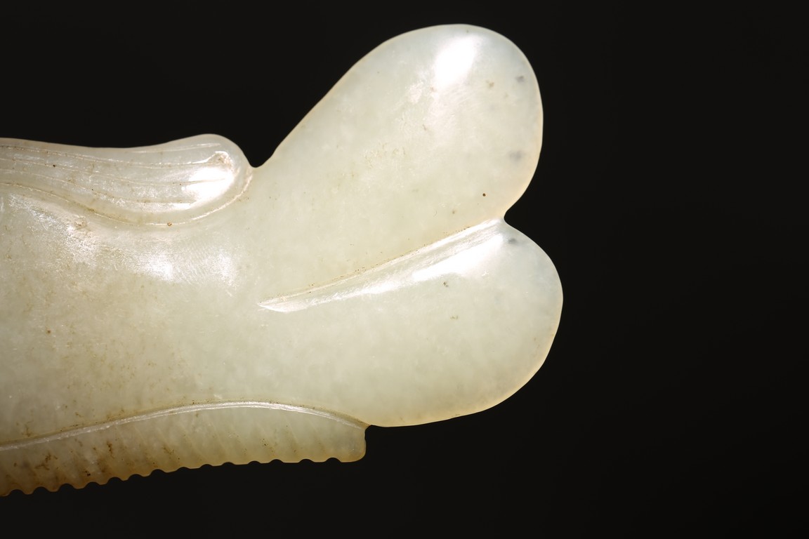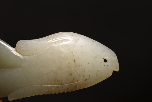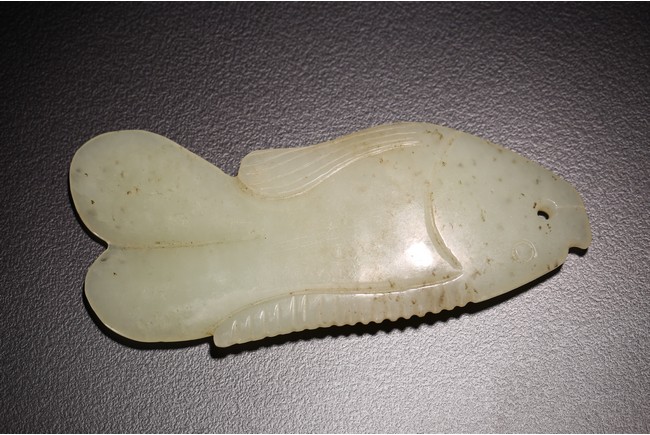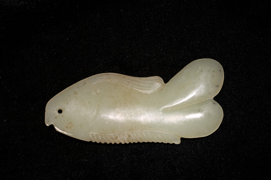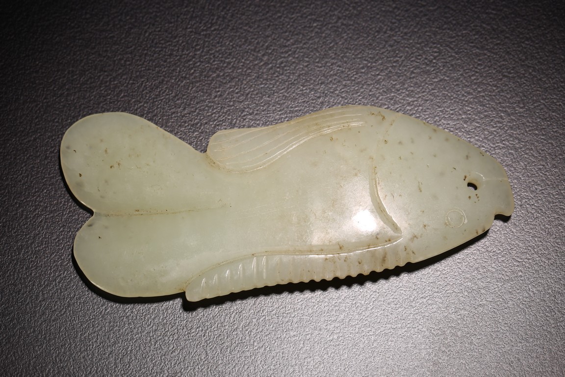 Carved in the shape of a carp with a aperture drilled at the mouth, the stone is of polished even white tone.