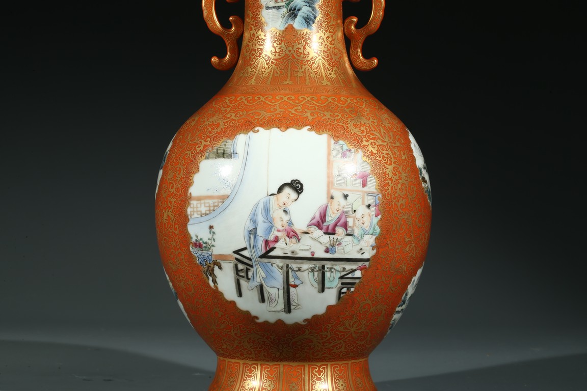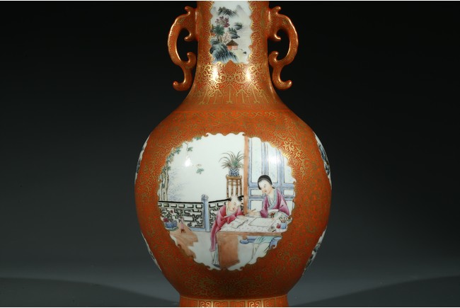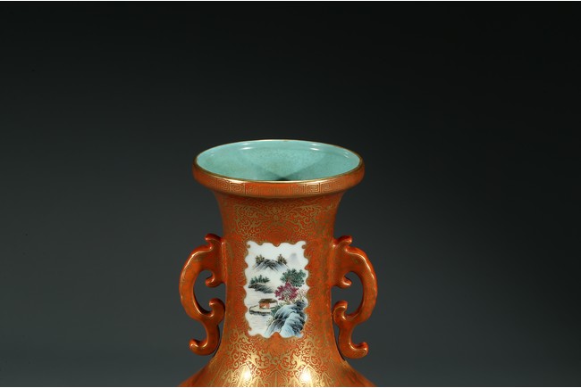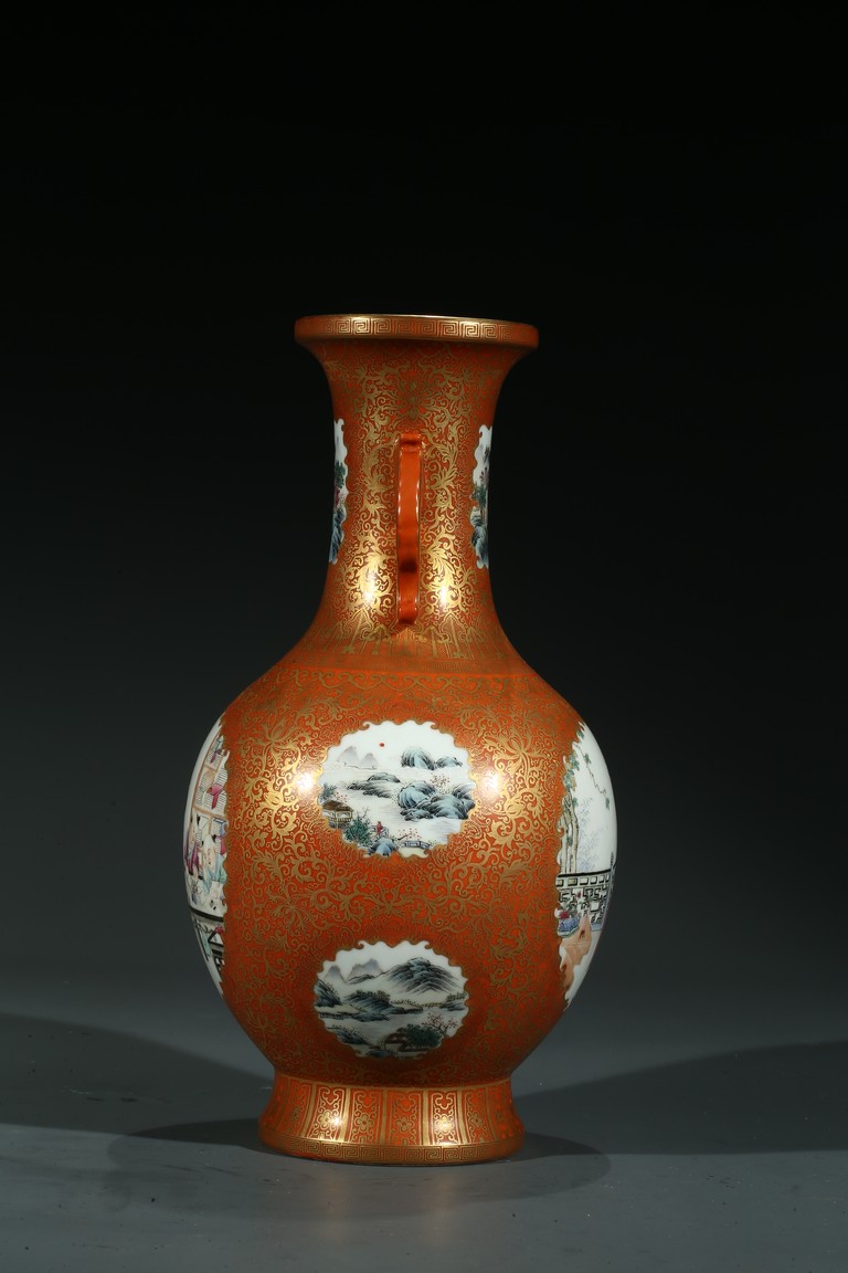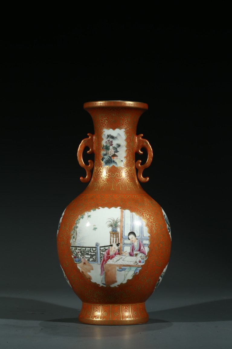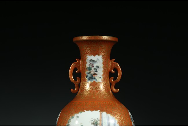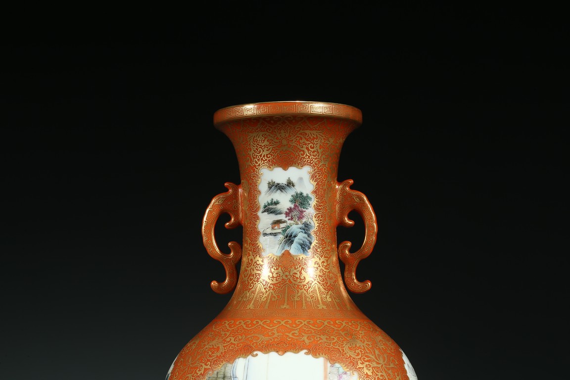 此瓶盤口、束頸、溜肩、鼓腹、下腹漸收、高足外撇,頸部飾雙螭龍耳。通體以珊瑚紅為地,以金彩繪製各式紋飾,頸部長方形開光內繪製山水紋飾,腹部開光繪人物故事紋飾。整體紋飾繁密有序,構圖嚴謹,繪製精細,器型端莊俊秀,胎質細膩堅實,釉面潔淨亮潤,保存完好,應為宮廷貴族案上精美陳設器。