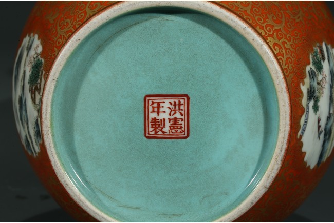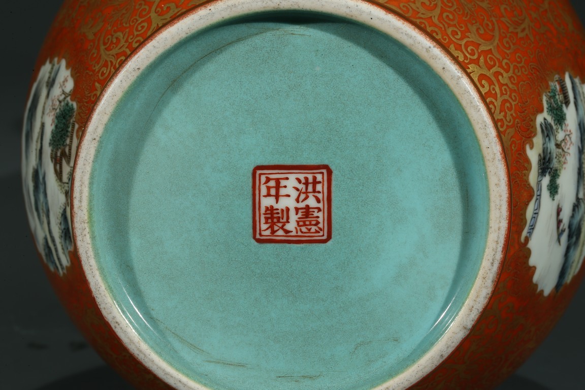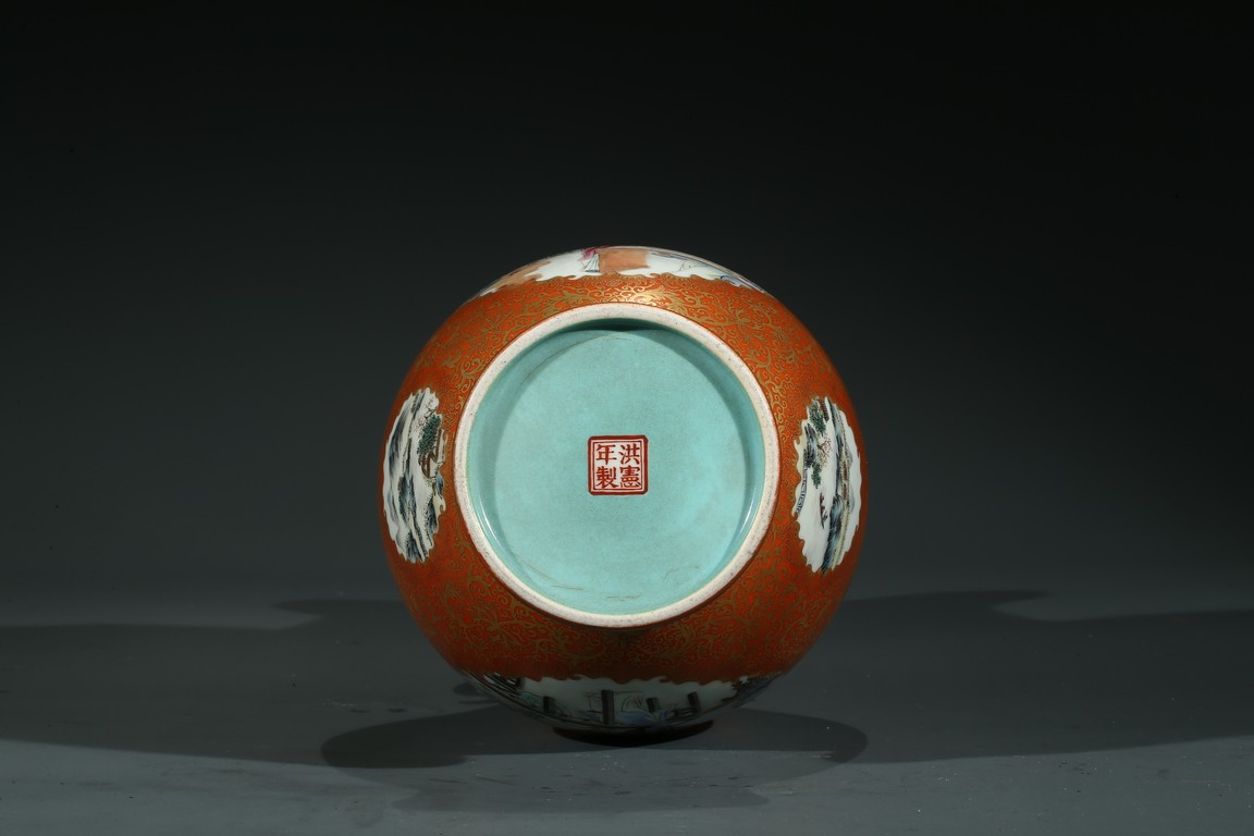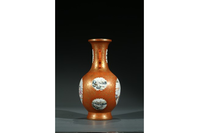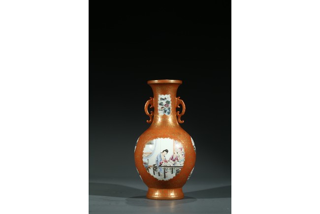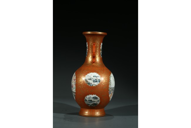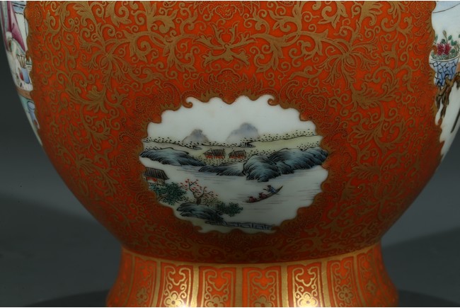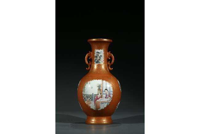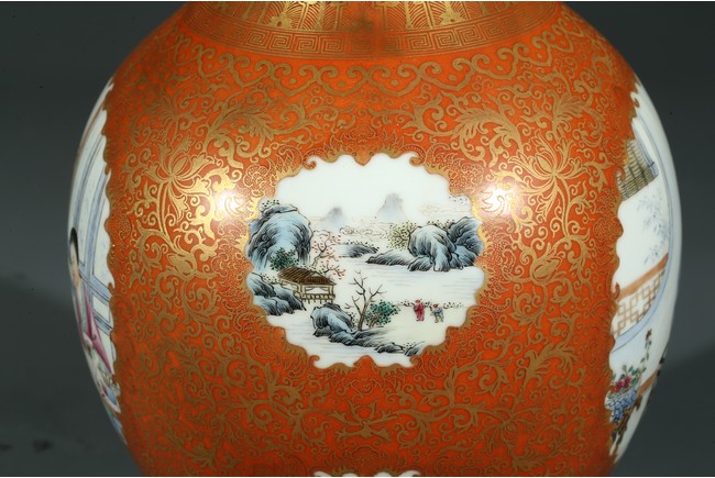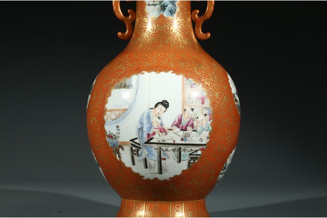 此瓶盤口、束頸、溜肩、鼓腹、下腹漸收、高足外撇,頸部飾雙螭龍耳。通體以珊瑚紅為地,以金彩繪製各式紋飾,頸部長方形開光內繪製山水紋飾,腹部開光繪人物故事紋飾。整體紋飾繁密有序,構圖嚴謹,繪製精細,器型端莊俊秀,胎質細膩堅實,釉面潔淨亮潤,保存完好,應為宮廷貴族案上精美陳設器。
