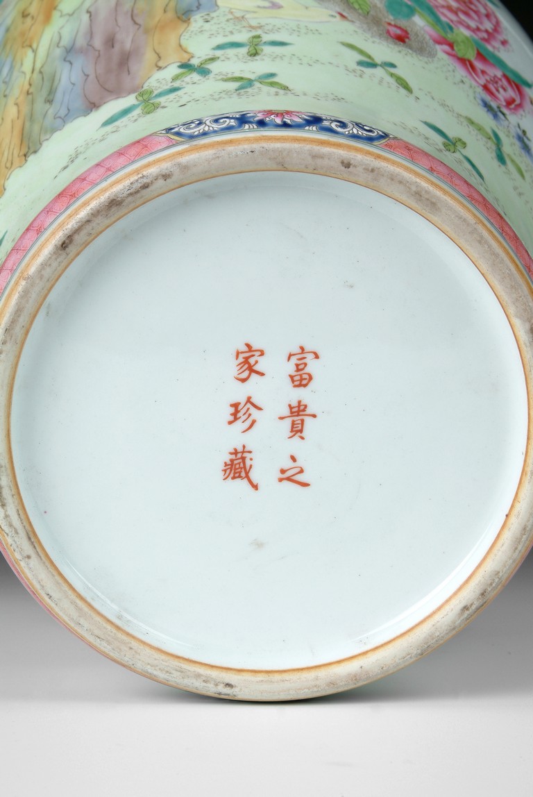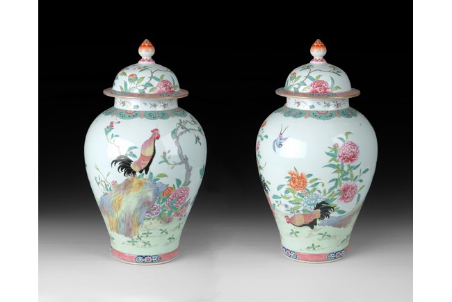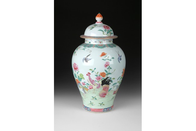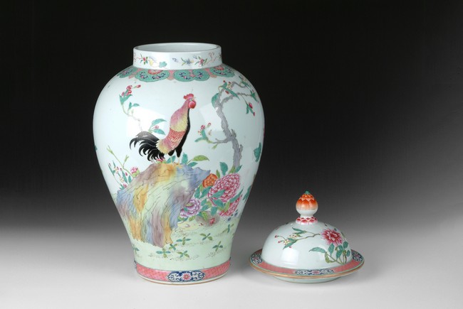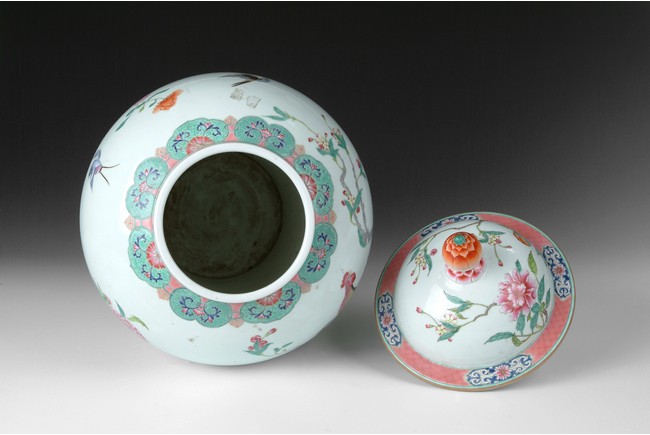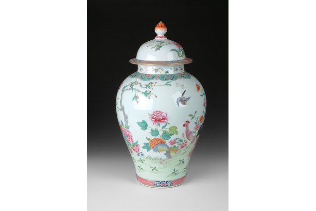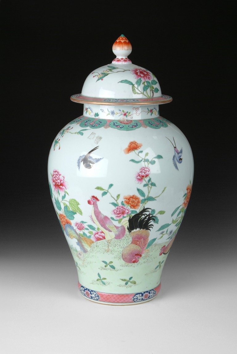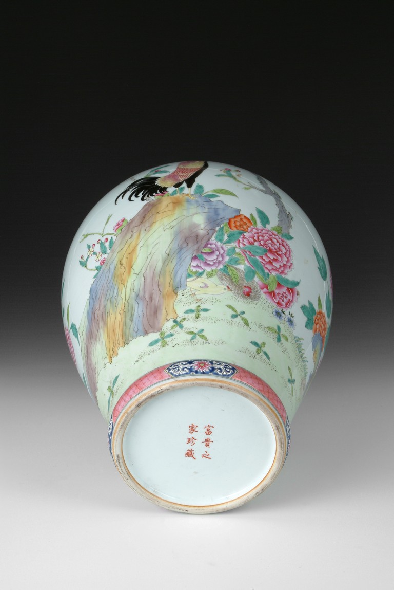 Late Qing dynasty period. Of tapering ovoid form, the body depicts chickens, birds, flowers, and trees in a wild setting, with different scrolling patterns on bottom, neck, and cover. The cover depicts blooming peony flowers, with the finial similar to a flower bulb. Six characters mark on the bottom.