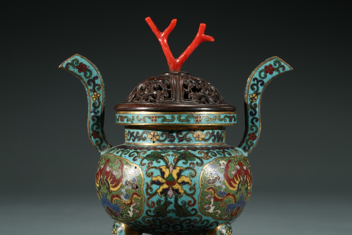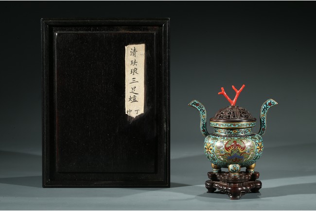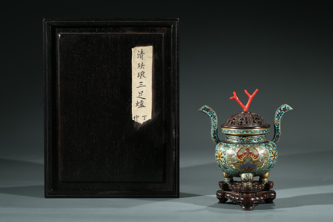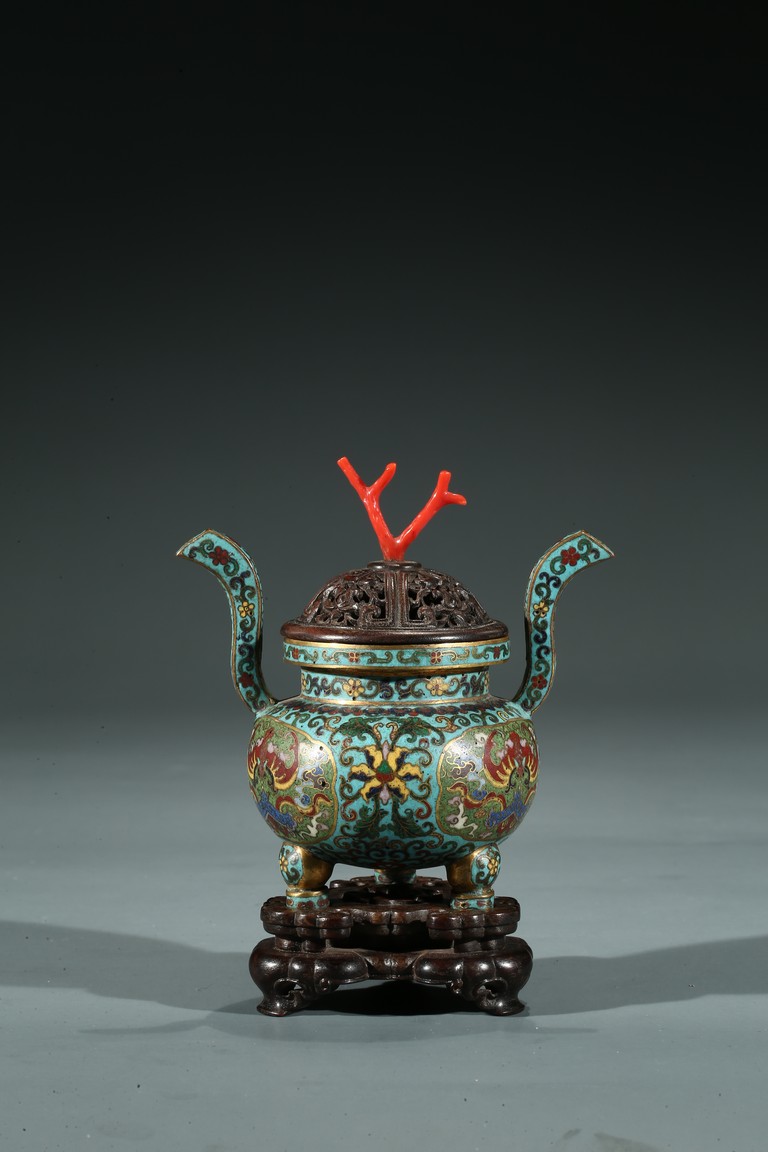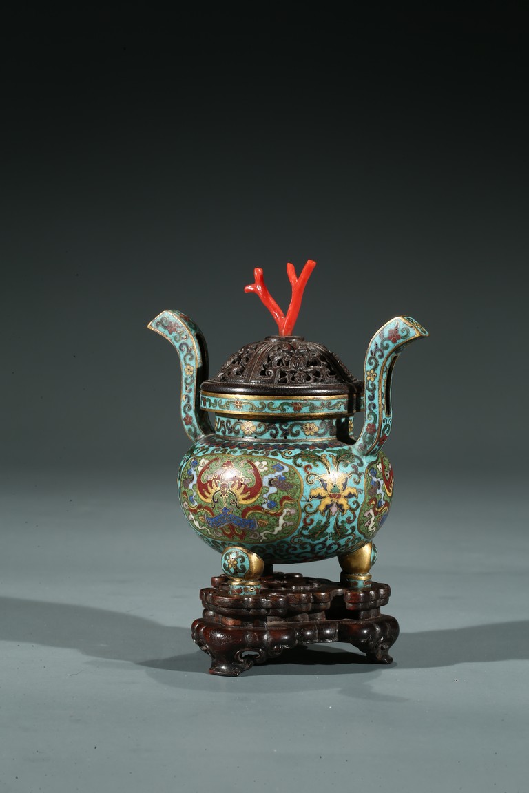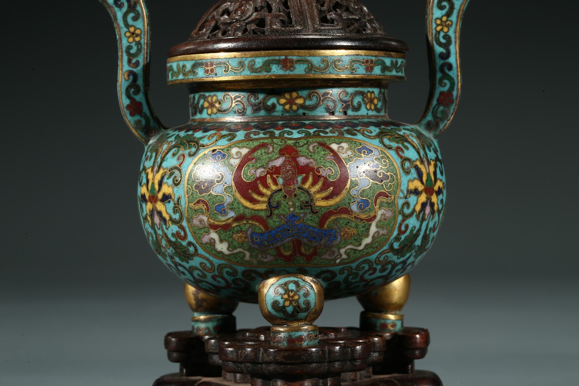 爐造型敦實古樸,琺瑯燦爛。口沿置衝天耳,高束頸圓鼓腹,底承蹄形三足,銅胎掐絲琺瑯製成,藍色琺瑯釉為地,上飾開光蝙蝠、罄之紋飾,寓意福壽吉慶,掐絲精細。上下均以紫檀雕爐蓋與三足爐底,整體造型俊美,氣度非凡,案頭陳設賞玩佳品。