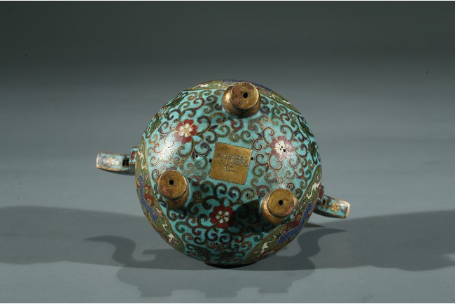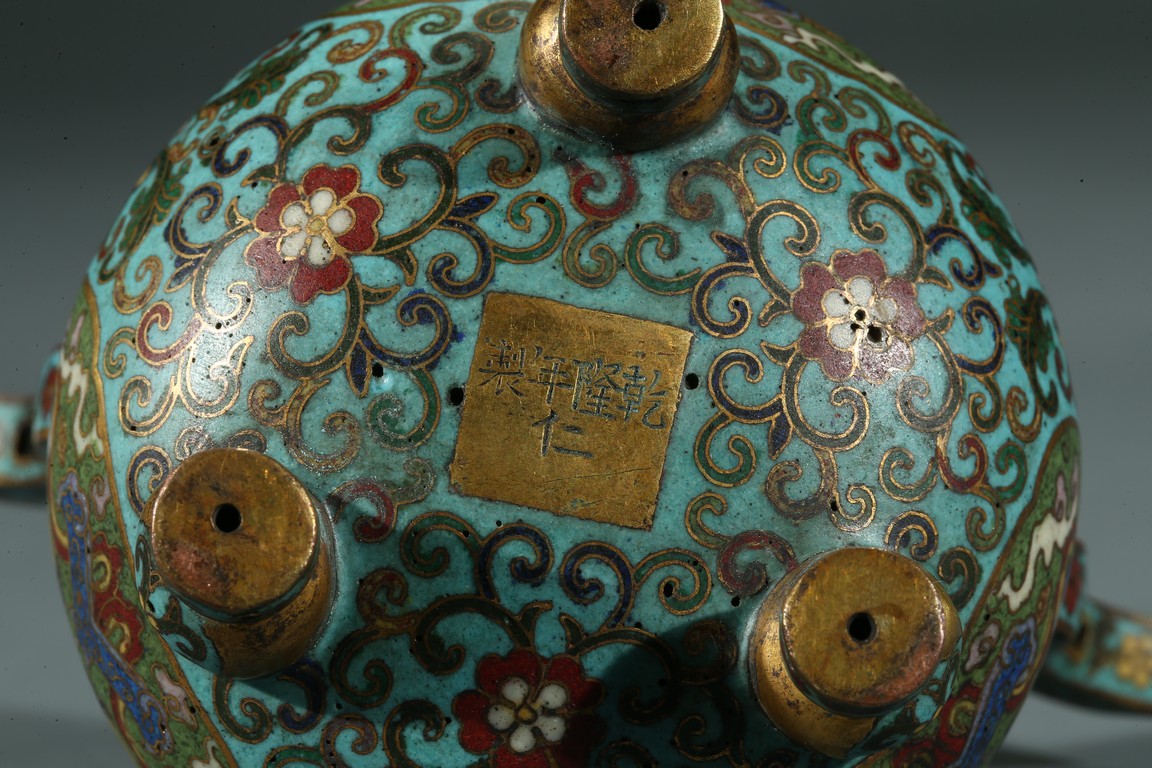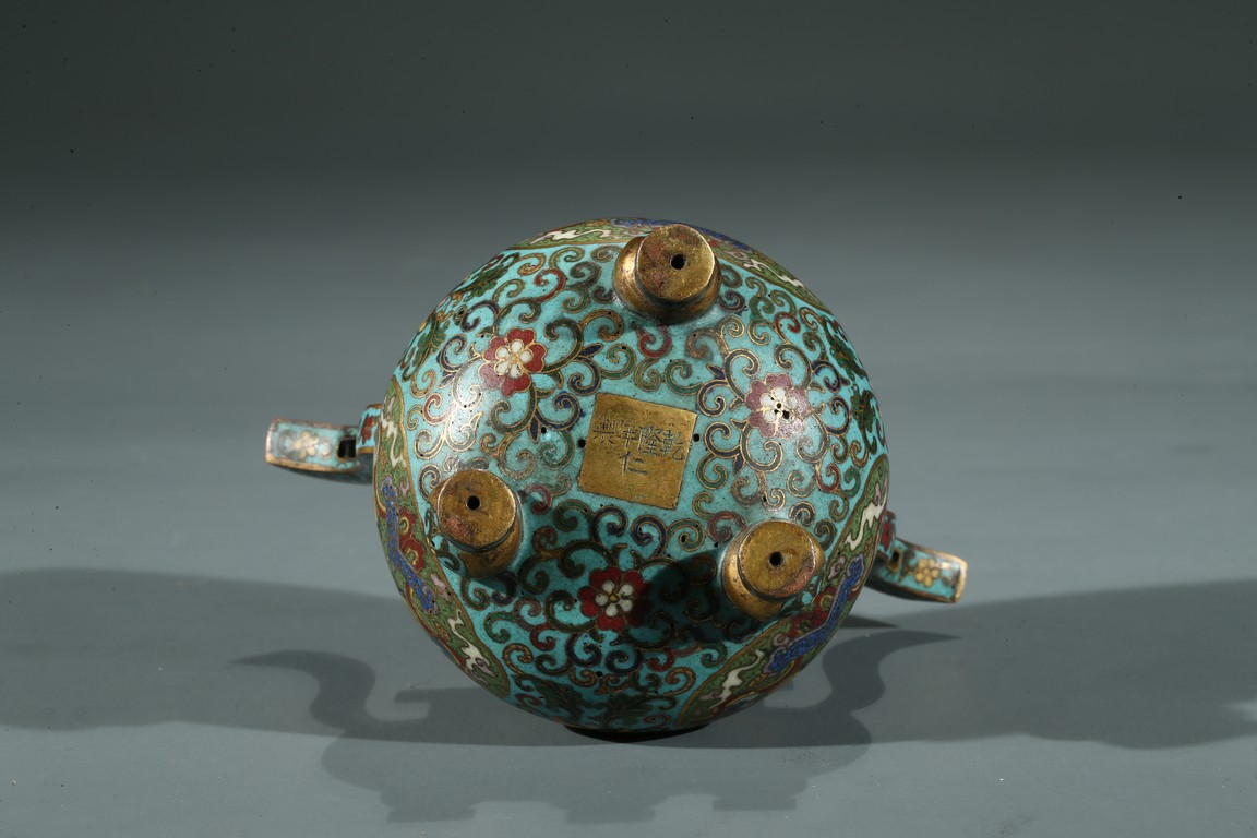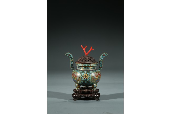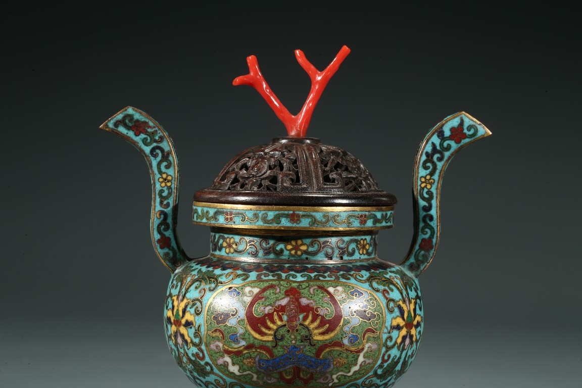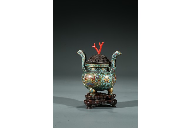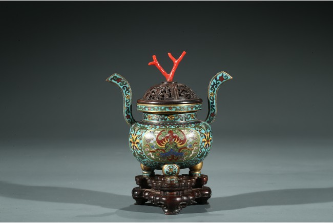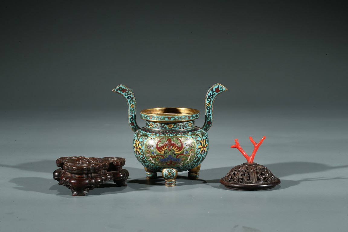 爐造型敦實古樸,琺瑯燦爛。口沿置衝天耳,高束頸圓鼓腹,底承蹄形三足,銅胎掐絲琺瑯製成,藍色琺瑯釉為地,上飾開光蝙蝠、罄之紋飾,寓意福壽吉慶,掐絲精細。上下均以紫檀雕爐蓋與三足爐底,整體造型俊美,氣度非凡,案頭陳設賞玩佳品。