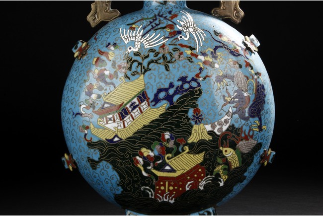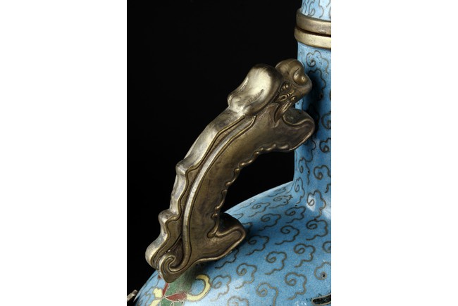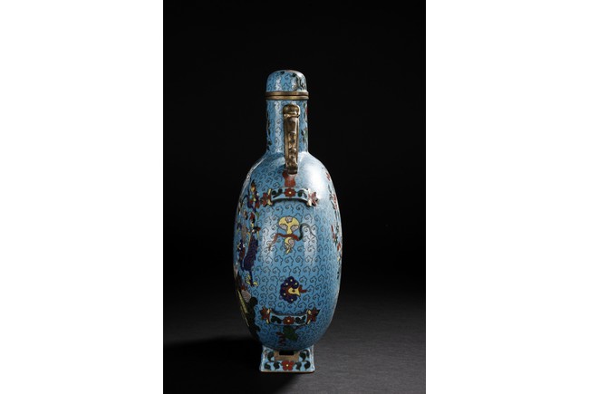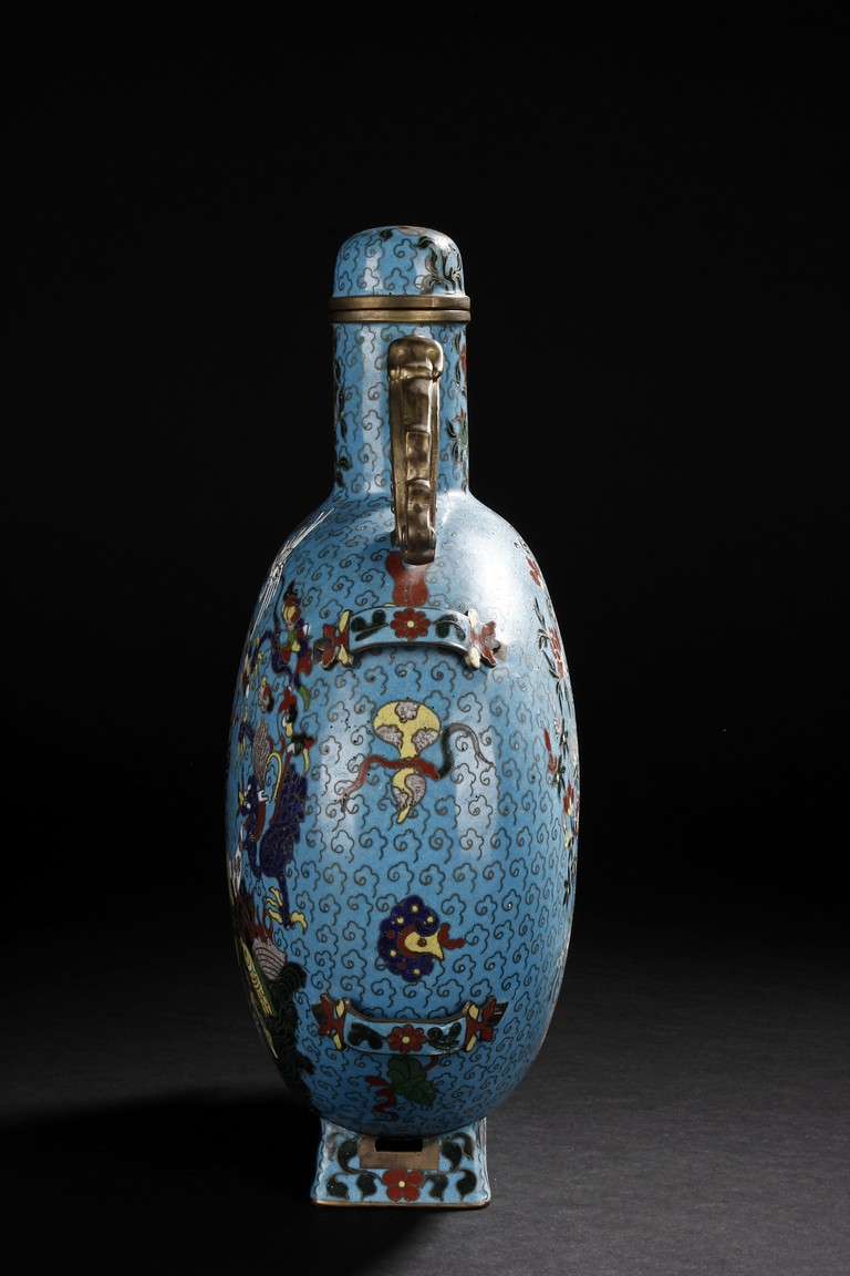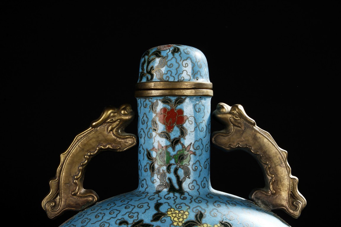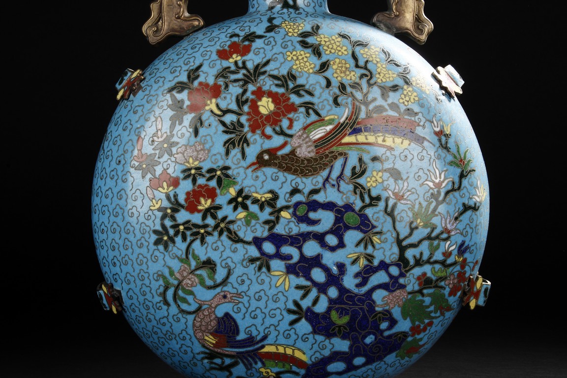 Of flattened circular body, the moonflask is enamelled on one side with scene of carp jumping over the dragon gate, the other side with two phoenix amongst leafy flowers issuing from rockwork, all reserved on turquoise ground with auspicious cloud motifs. The neck further decorated with two gilt mythical beast handles.