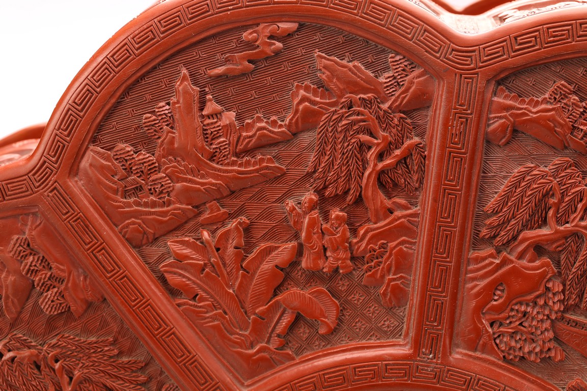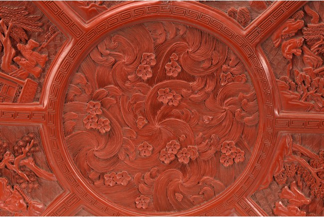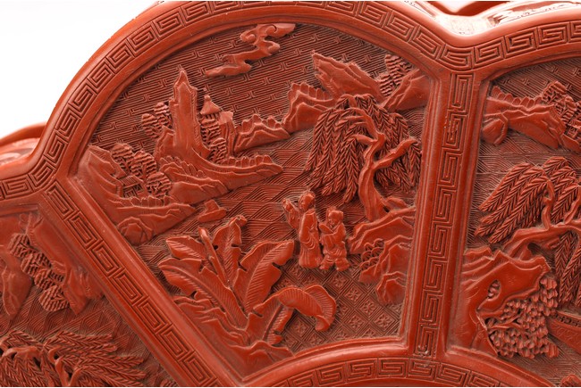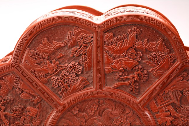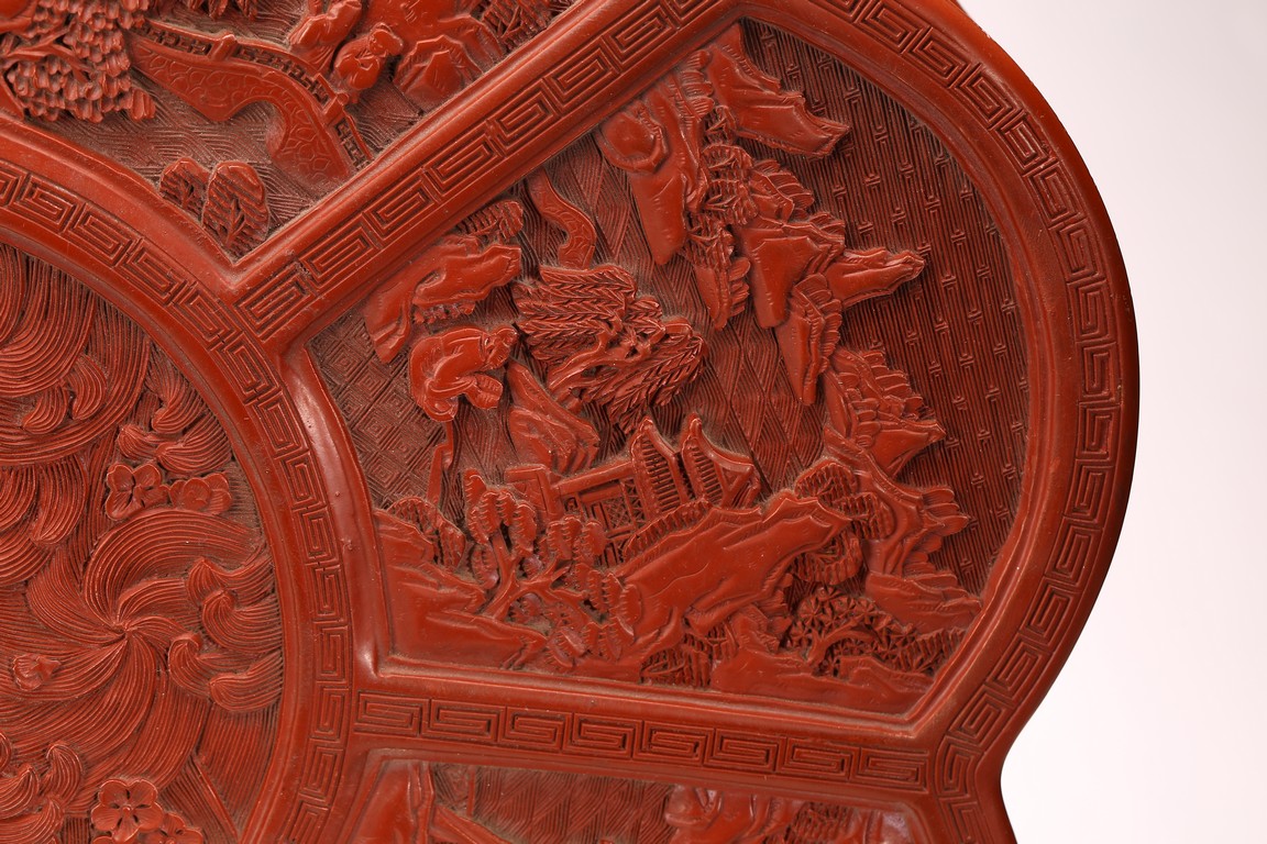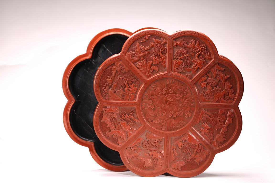盒八瓣梅花式,通體髹朱漆,盒蓋頂部內雕錦紋為地,其上軋雕山水人物。山石俊俏挺拔,修竹芭蕉,迎風款擺,遠岸崇山,漸遠漸深,整體構圖靈動,虛實相映,儼然一幅立體的山水畫。整器髹漆厚重,漆色典雅明豔,雕刻工藝精湛,刀法流暢,層次豐富,邊角圓潤,意境清遠。