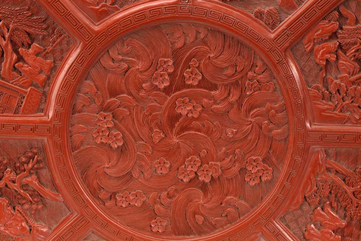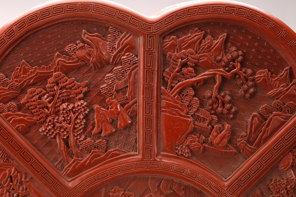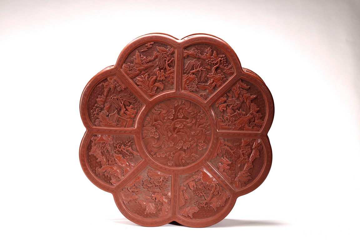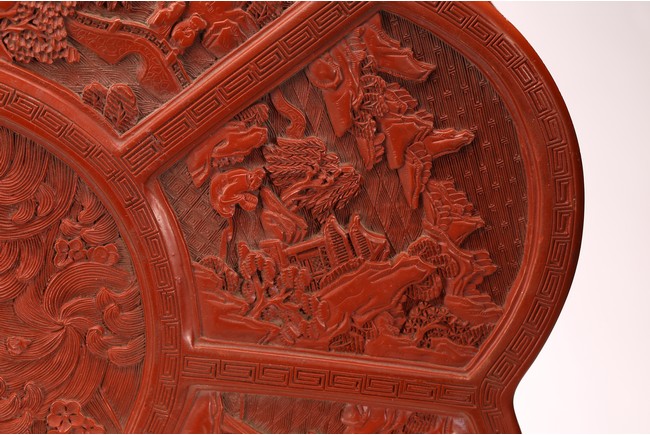 盒八瓣梅花式,通體髹朱漆,盒蓋頂部內雕錦紋為地,其上軋雕山水人物。山石俊俏挺拔,修竹芭蕉,迎風款擺,遠岸崇山,漸遠漸深,整體構圖靈動,虛實相映,儼然一幅立體的山水畫。整器髹漆厚重,漆色典雅明豔,雕刻工藝精湛,刀法流暢,層次豐富,邊角圓潤,意境清遠。