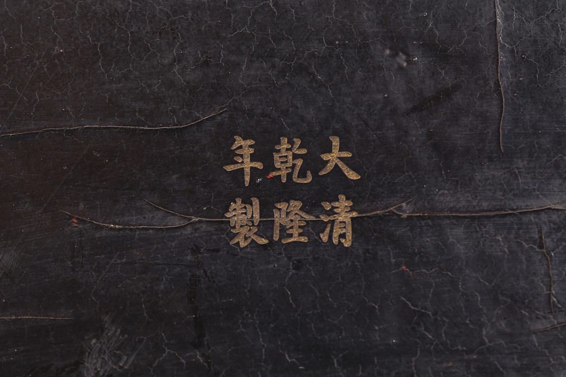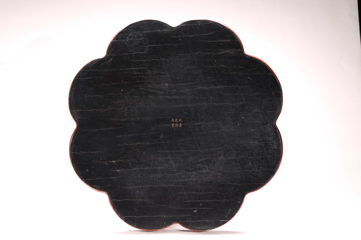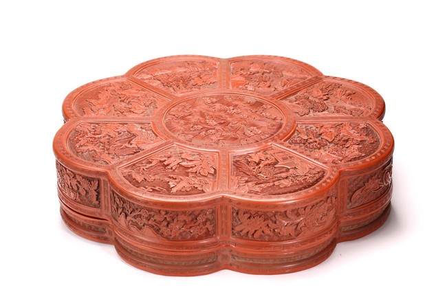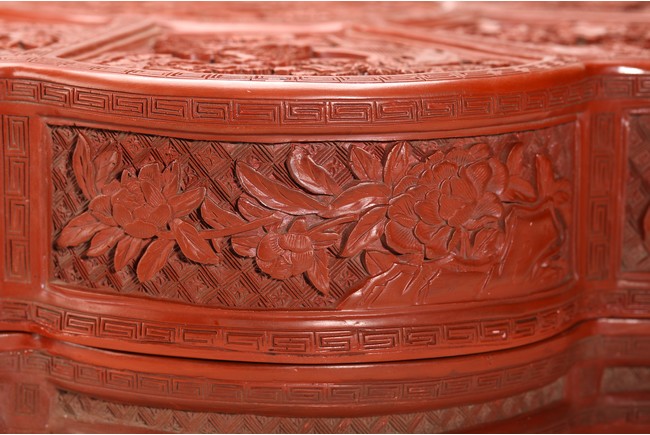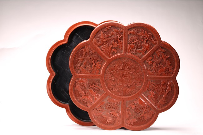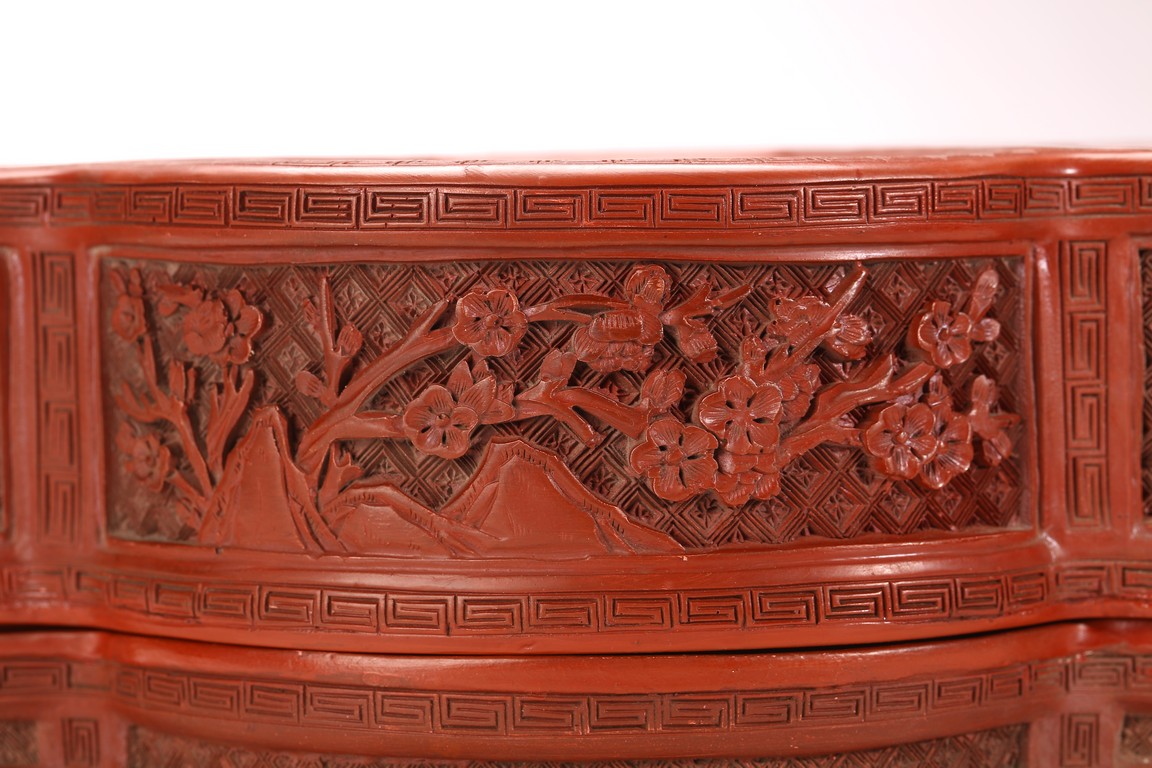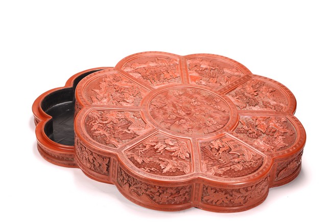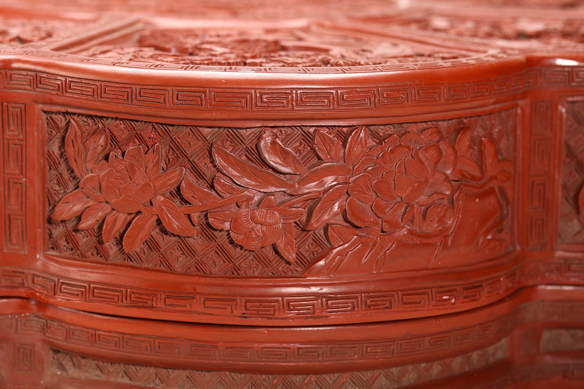 Qing Dynasty period. Of eight lobed form, the box cover finely carved through the layers to depict scenes of landscape and figures in each lobe surrounding the central panel of sea waves, the sides carved with flowers, base painted in black lacquer and carved with six character Qianlong mark in gilt.