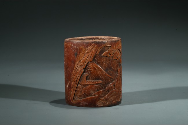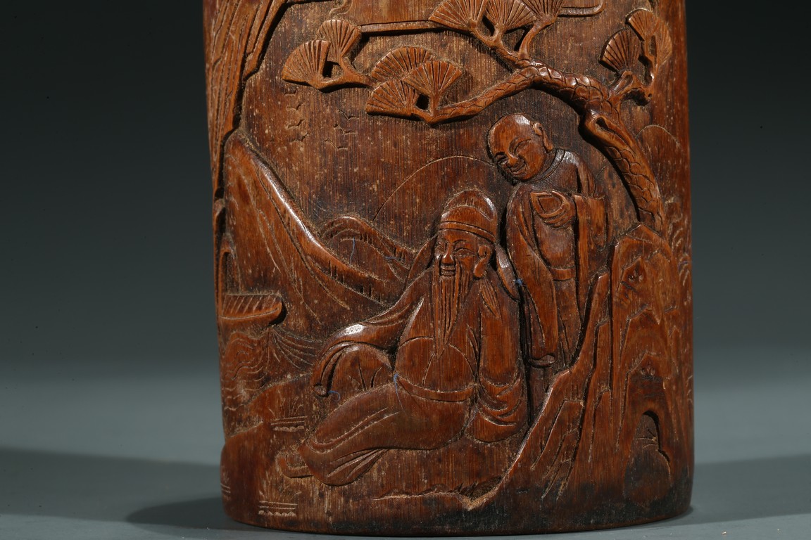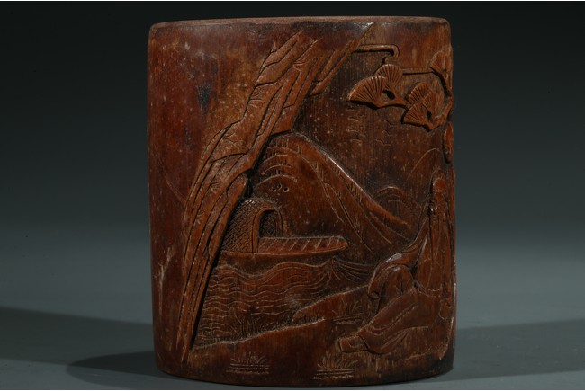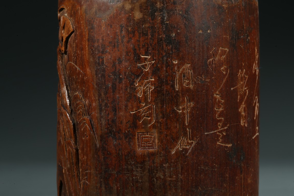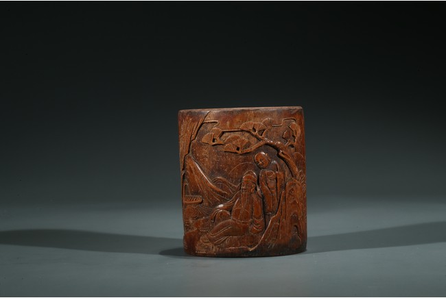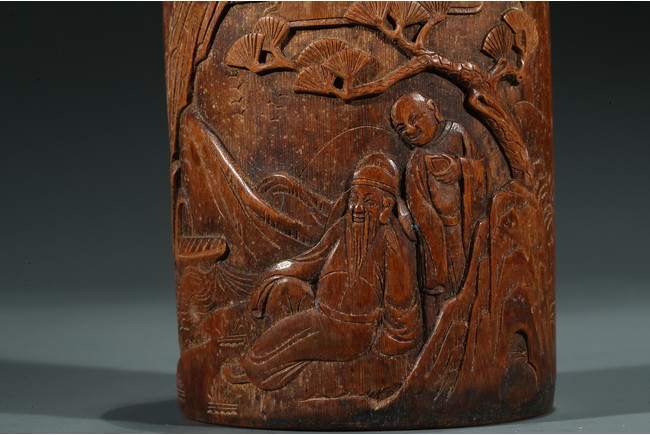 筆筒外壁以高浮雕技法琢刻柳樹枝幹遒勁,以陰刻技法表現山石聳立,李白頭戴學士巾,身著寬衣袖袍,醉意正濃,閉目而憩,背後小童則持酒匙取酒偷飲,神情膽怯中透露著竊喜,活潑生動。作品雕刻犀利精道、包漿溫潤,文房案頭雅品。