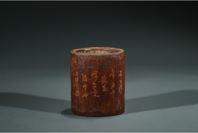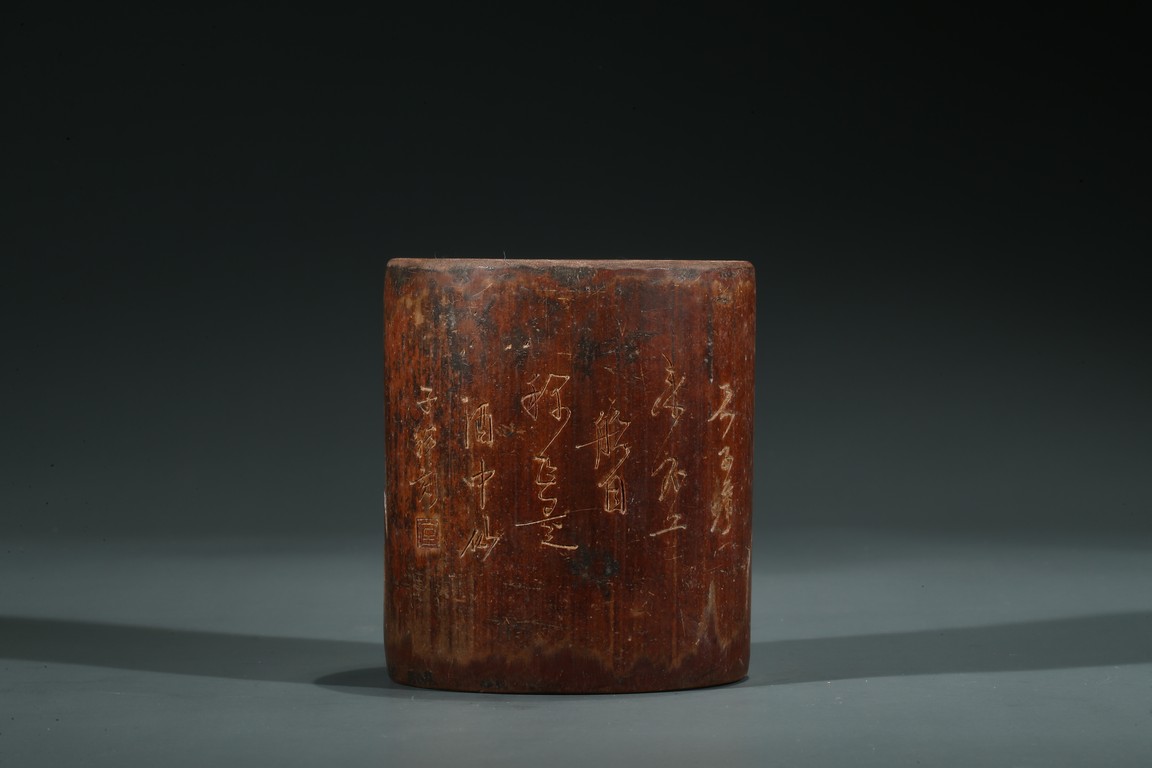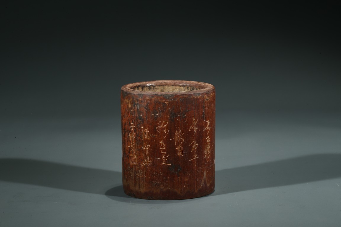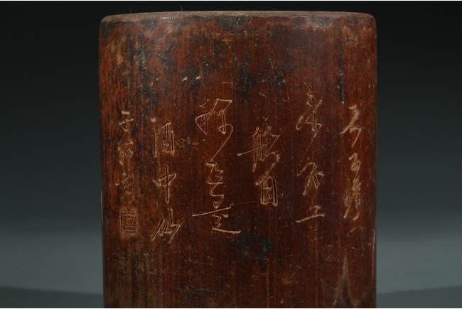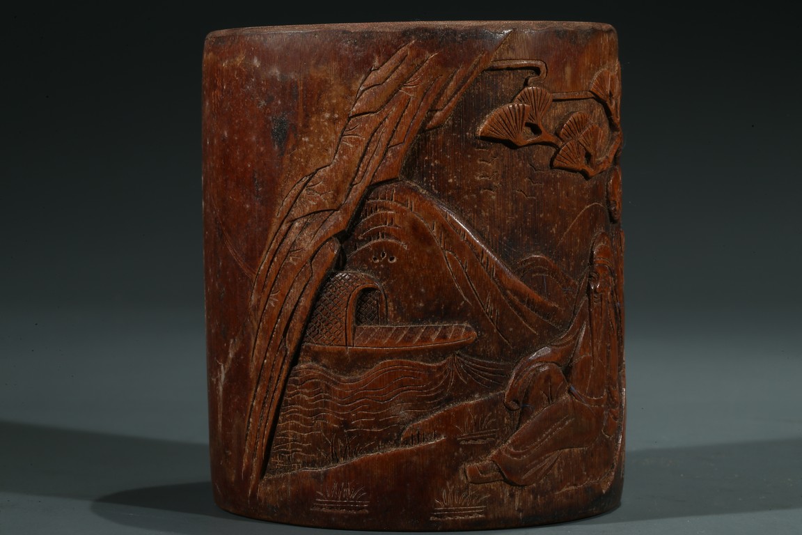 筆筒外壁以高浮雕技法琢刻柳樹枝幹遒勁,以陰刻技法表現山石聳立,李白頭戴學士巾,身著寬衣袖袍,醉意正濃,閉目而憩,背後小童則持酒匙取酒偷飲,神情膽怯中透露著竊喜,活潑生動。作品雕刻犀利精道、包漿溫潤,文房案頭雅品。