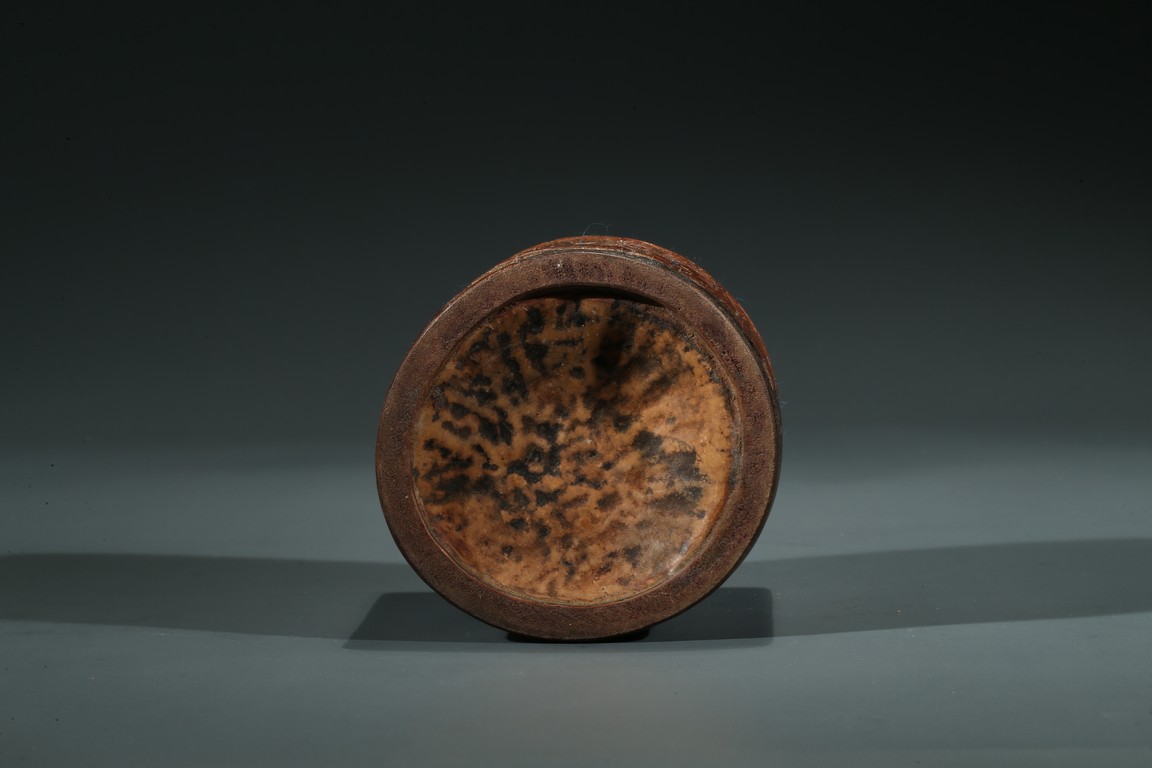 Carved around the body in relief to depict seated scholar and a monk on riverbank, the reverse inscribed with poems.