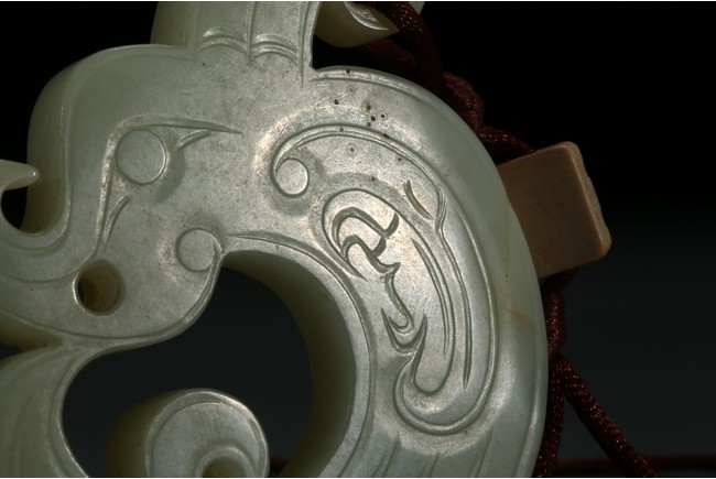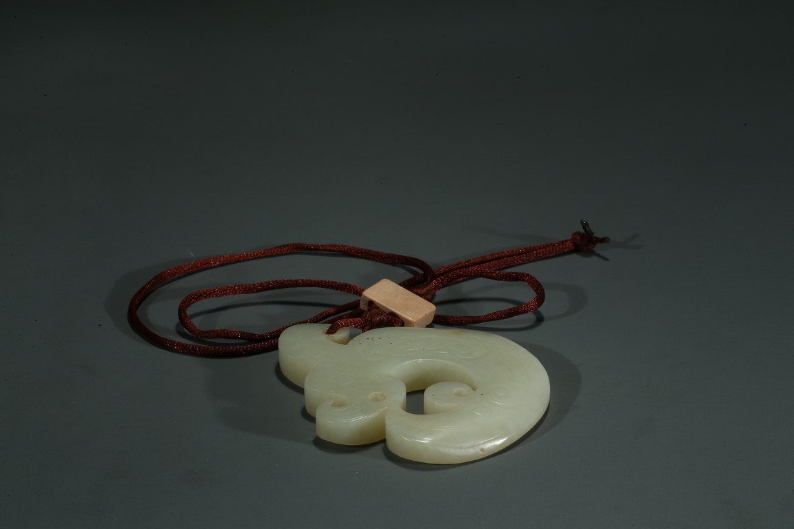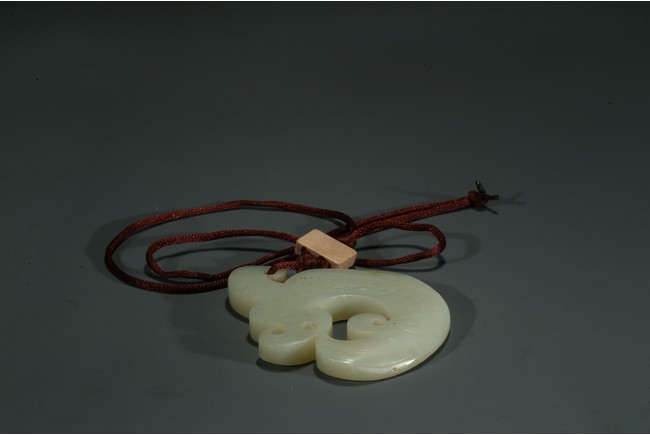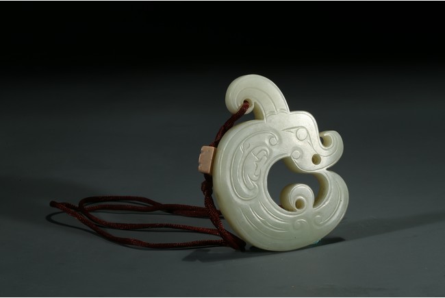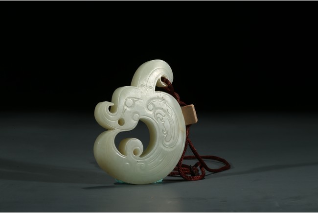 白玉製成,卷龍形狀,頭部上方以雲氣化的鬢鬃設計成斜上飄揚的形式,尾部向上翻捲與下顎處相連接,如此自然造成前後交疊的空間從深感,產生強烈的扭轉力量。在一動一靜、一左一右的張弛之間,動態感自然傳送至觀者的腦海中。