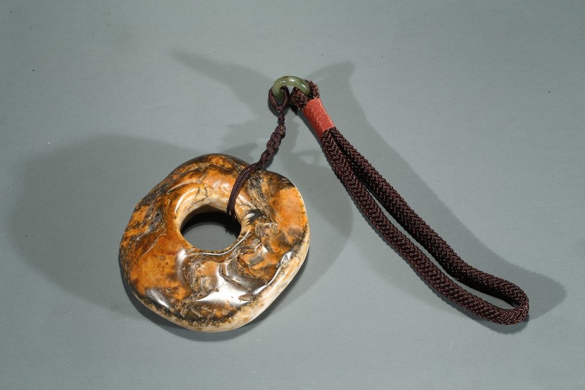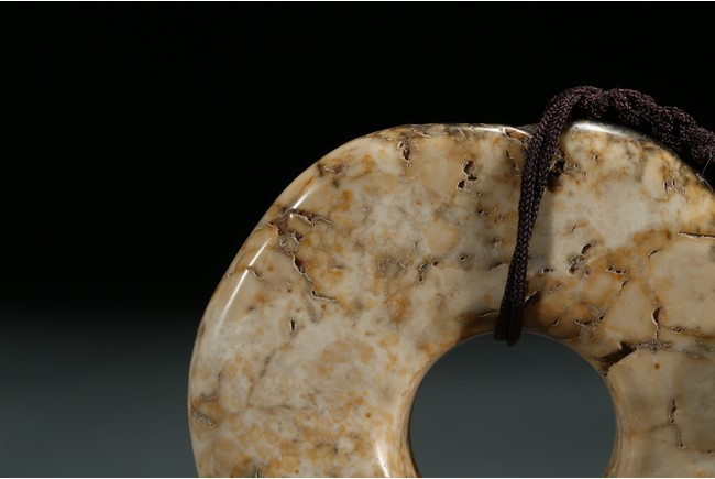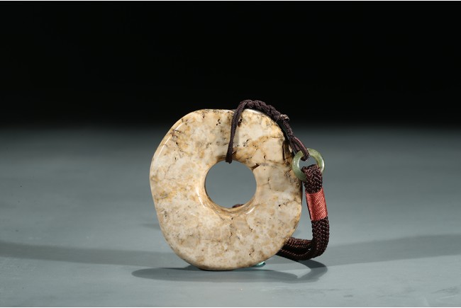 玉璧是古人祭祀活動中的一種禮器。古人認為天圓地方,而天又是蒼色(青色),故“以蒼璧禮天”。璧是一種中央有穿孔的扁平狀圓形玉器,古玉璧由於年代久遠,壁體有不同顏色的沁色,此件玉璧亦有紅褐色、灰白色。